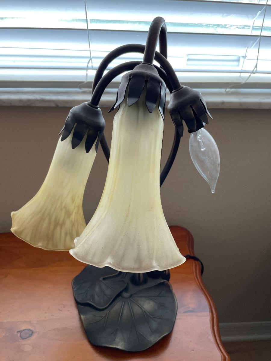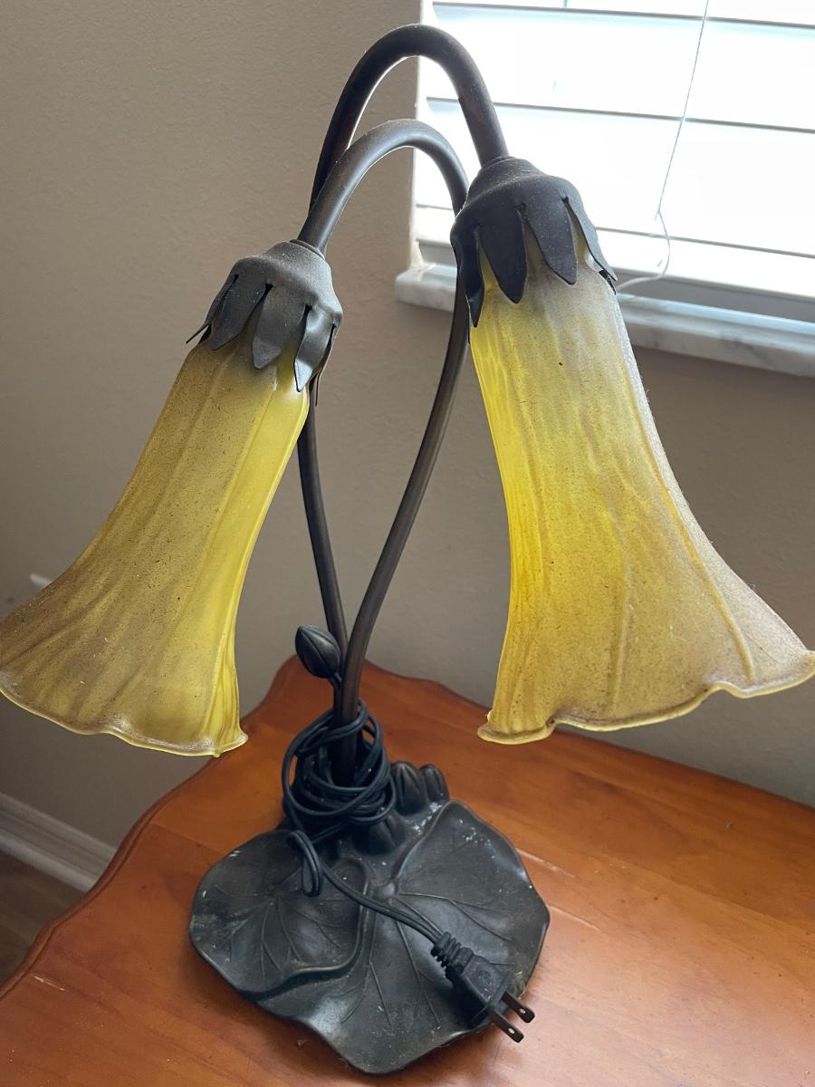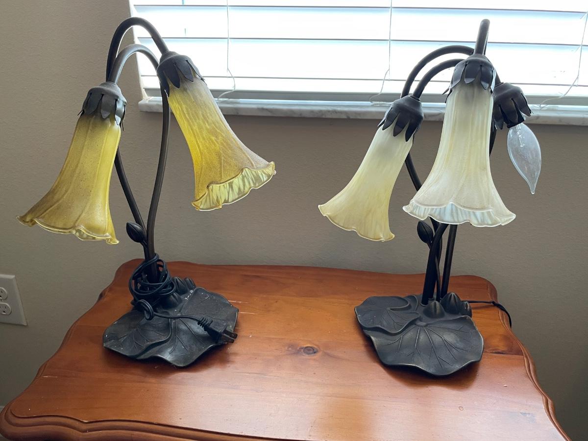 One lamp has two lights, the other has 3 lights. There is a shade missing from the 3 light lamp.