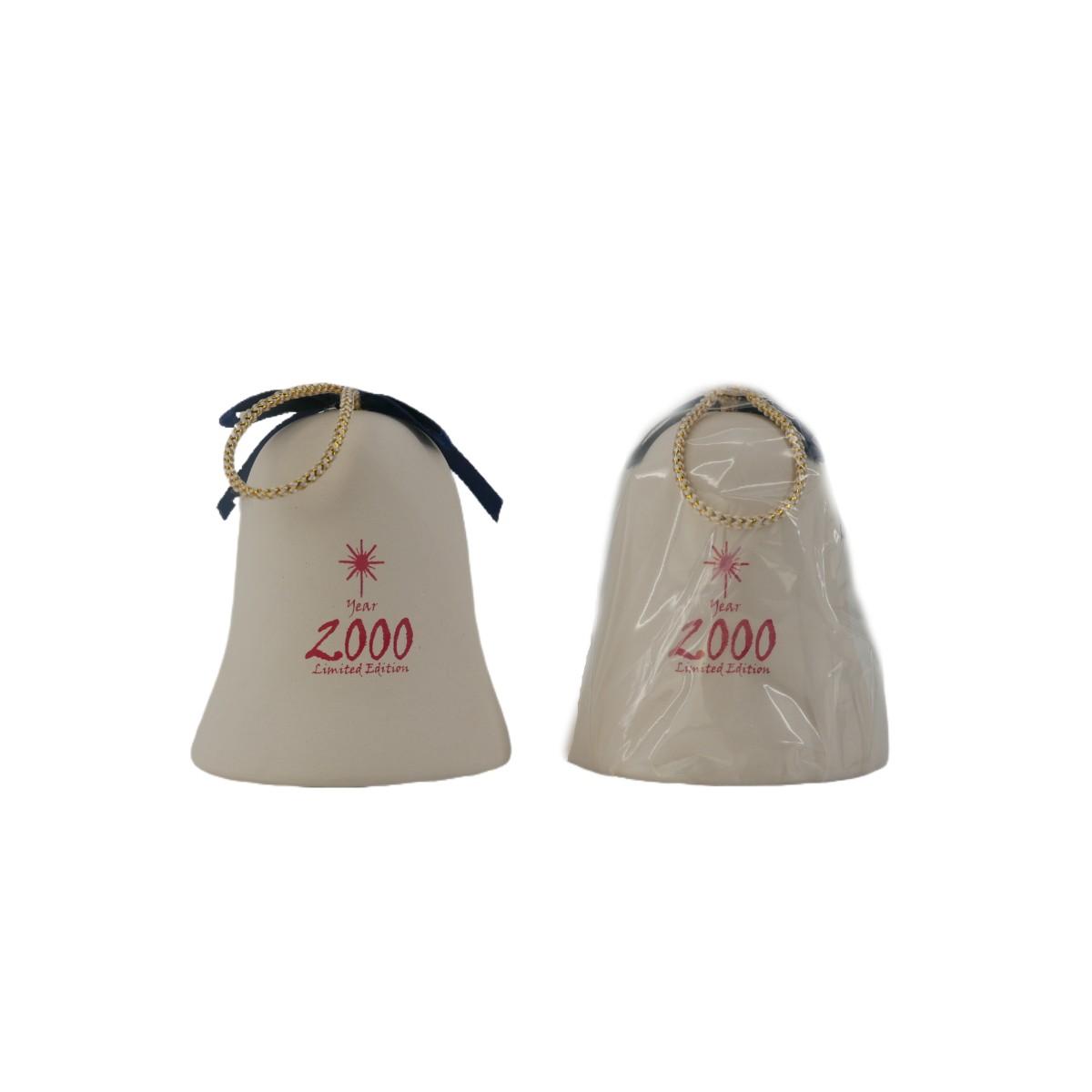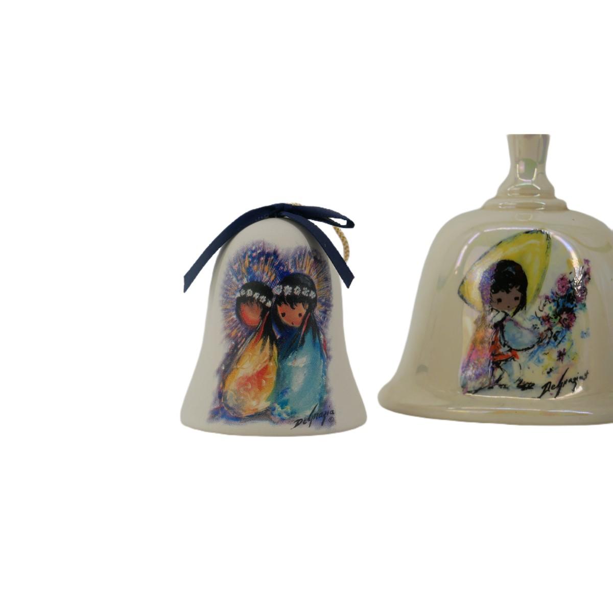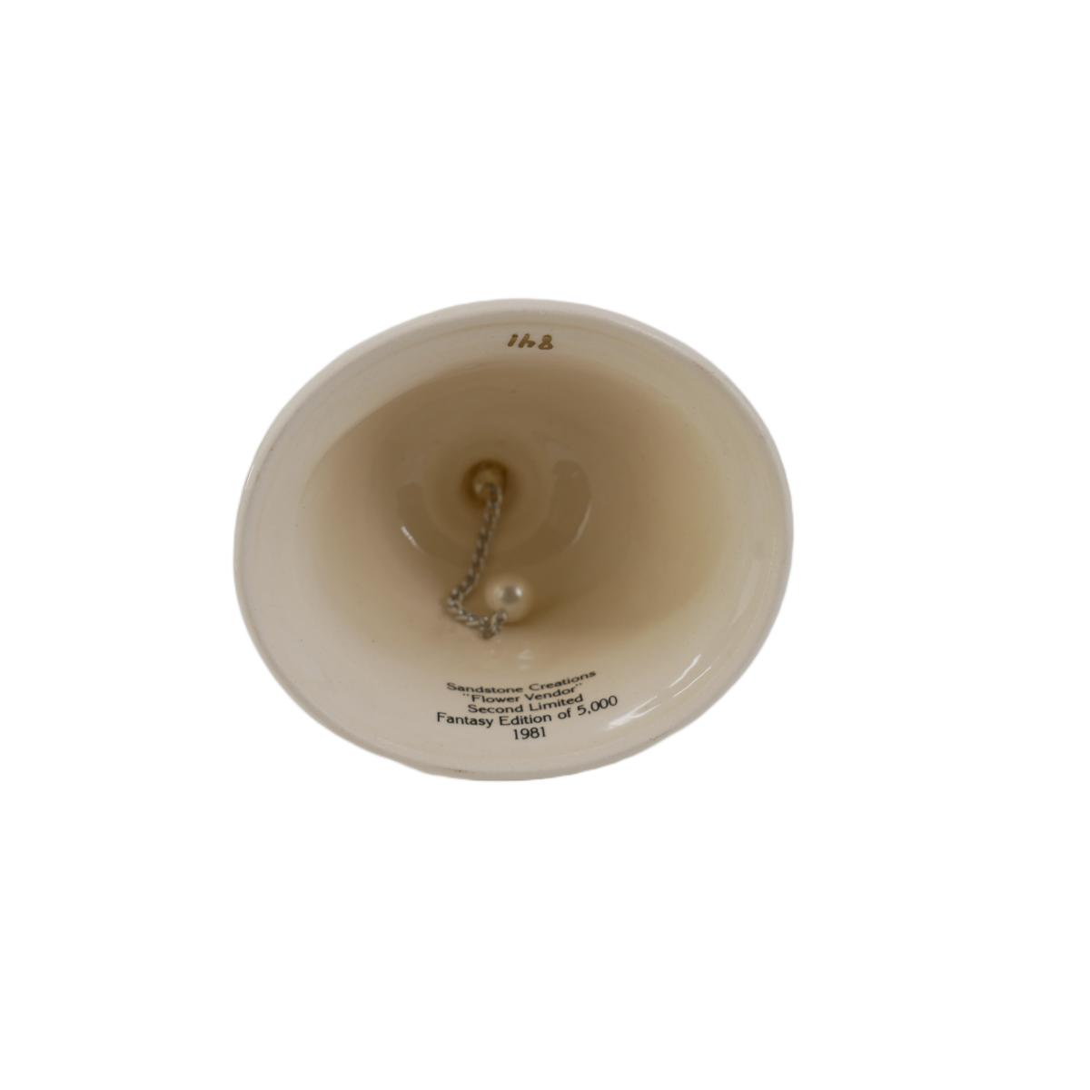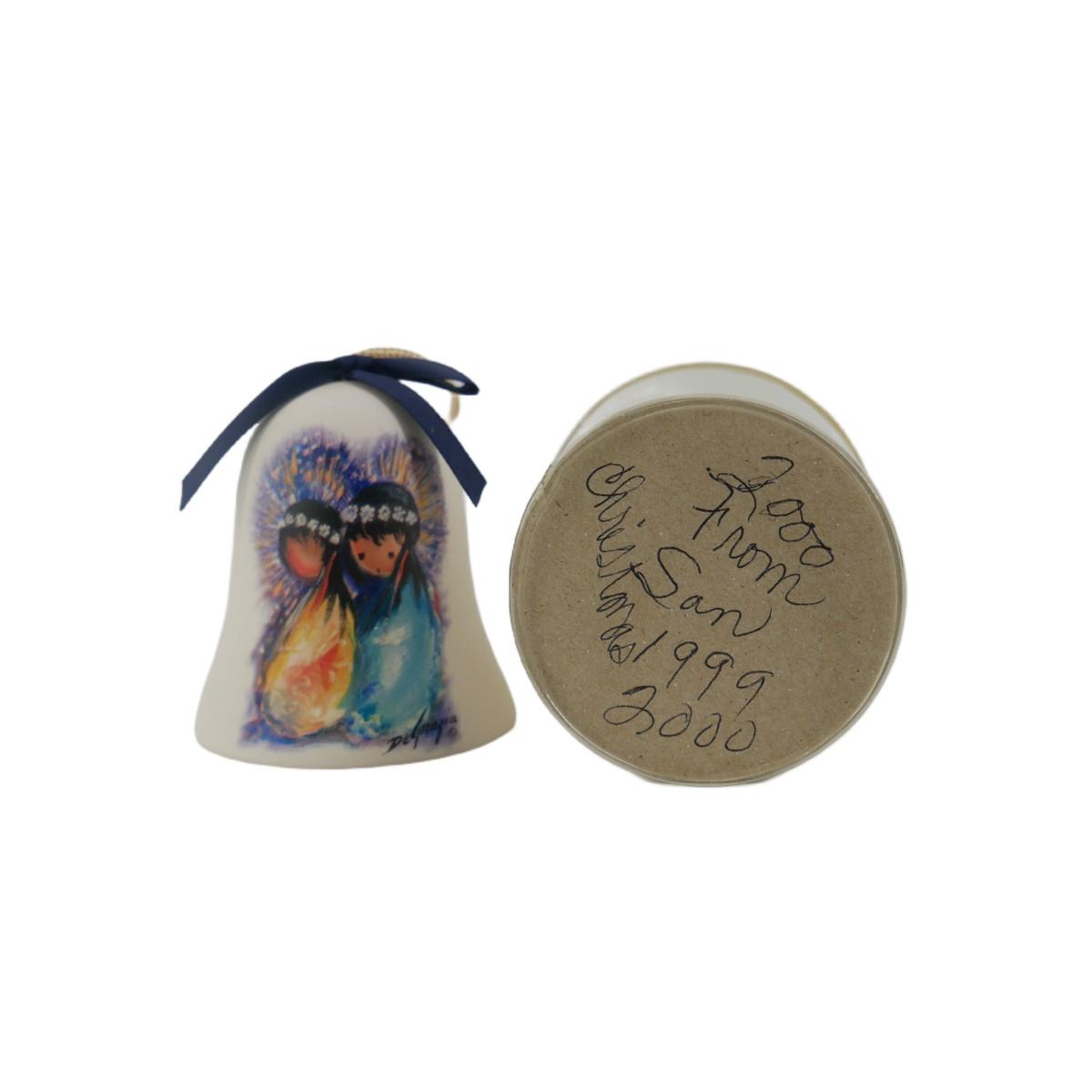 Two vintage year 2000 limited edition DeGrazia bells. Each is 1 of 10,000 handcrafted by Sandstone Creations in Arizona. Each measures 2.25" in diameter and 3" tall. One is missing 1 of 10,000 sticker, the other is unopened and still in container (has writing on bottom of container - see photo). Both in excellent condition - no issues found. Large vintage year 1981 DeGrazia bell by Sandstone Creations in Arizona. Named "Flower Vendor" second limited edition of 5,000, numbered 841. Measures L 4" x H 6" x W 3.5". Has a gorgeous iridescent glaze and is in pristine condition! Lot weighs 8 oz. (C56)