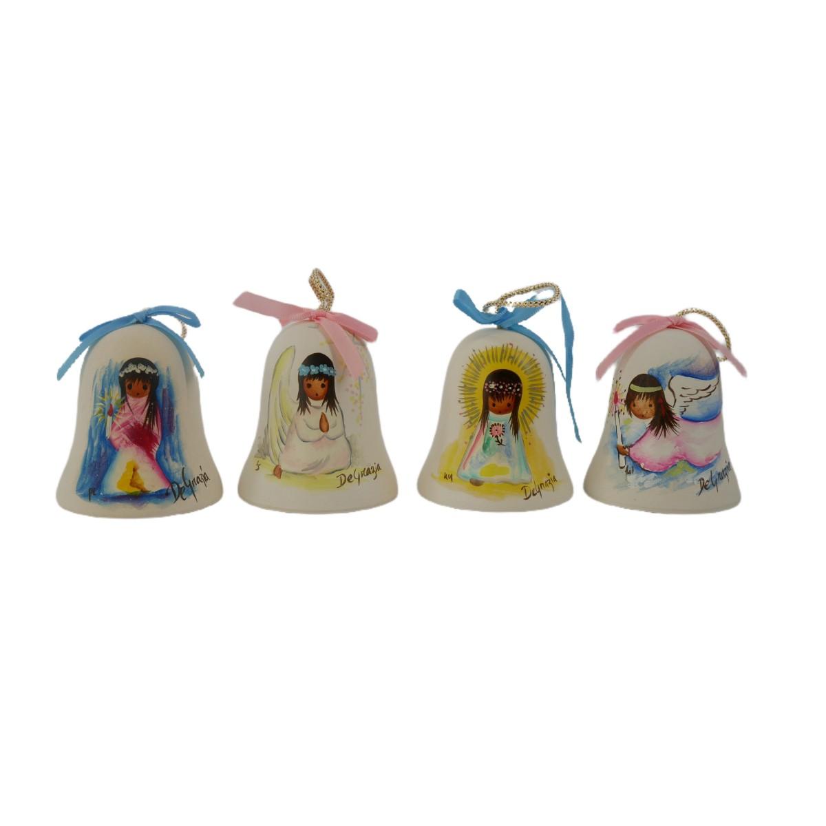 Four vintage limited edition DeGrazia style decorative bells. All handpainted by Sandstone Creations in Arizona. Years of bells are 1986, 1984, 1985, and 1987. Each measures approximately 2.25" in diameter and 3" in height. Three have limited edition 1 of 10,000 sticker. All in excellent condition. (C57)