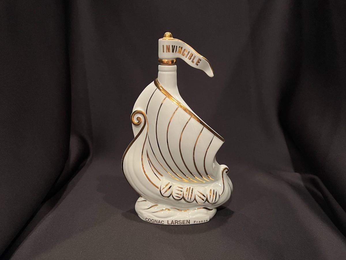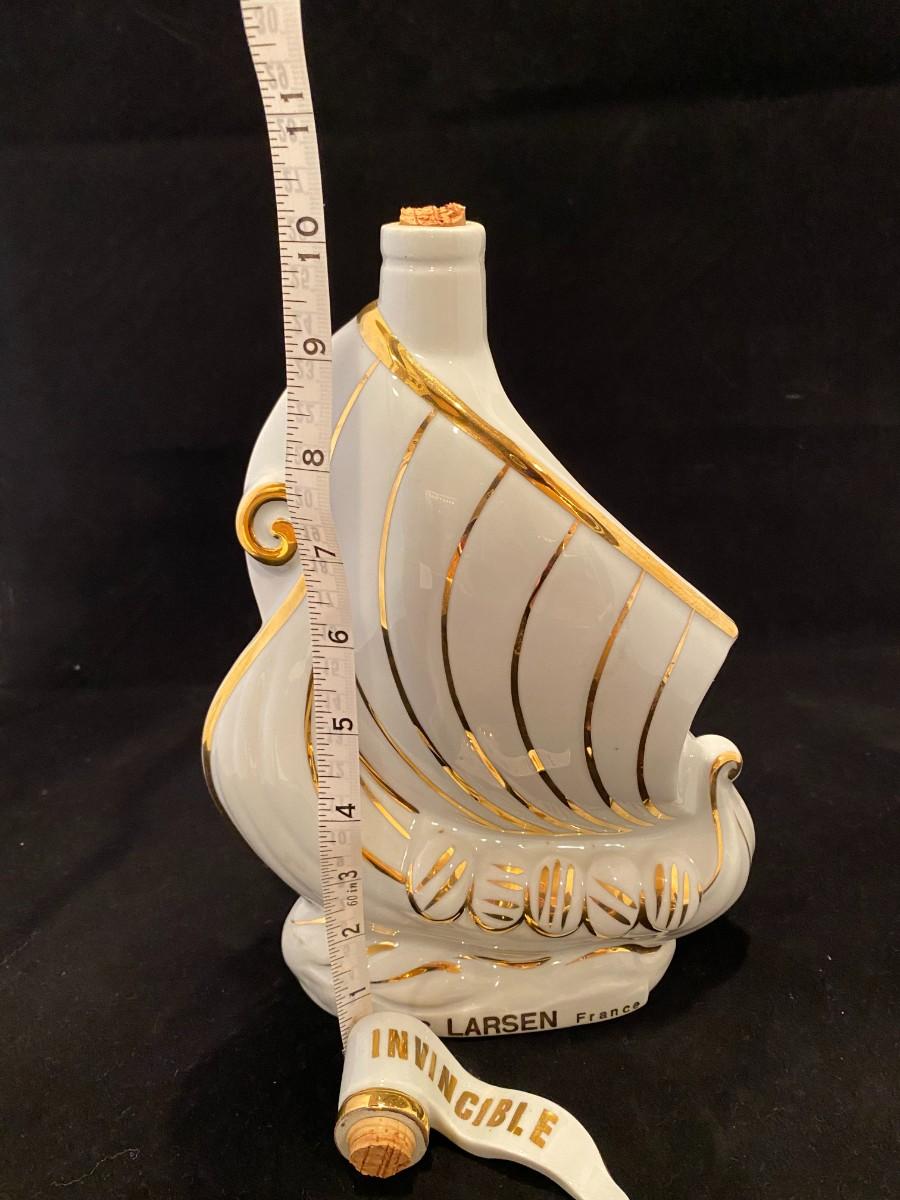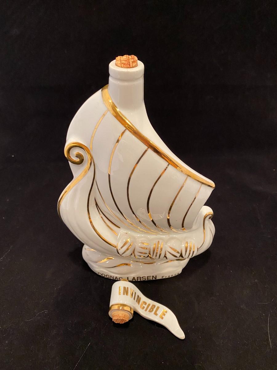 Vintage Limoges porcelain bottle with "Invincible" flag for Larsen cognac in France. In very good condition, though the original cork has broken from being dry (as shown in photos).