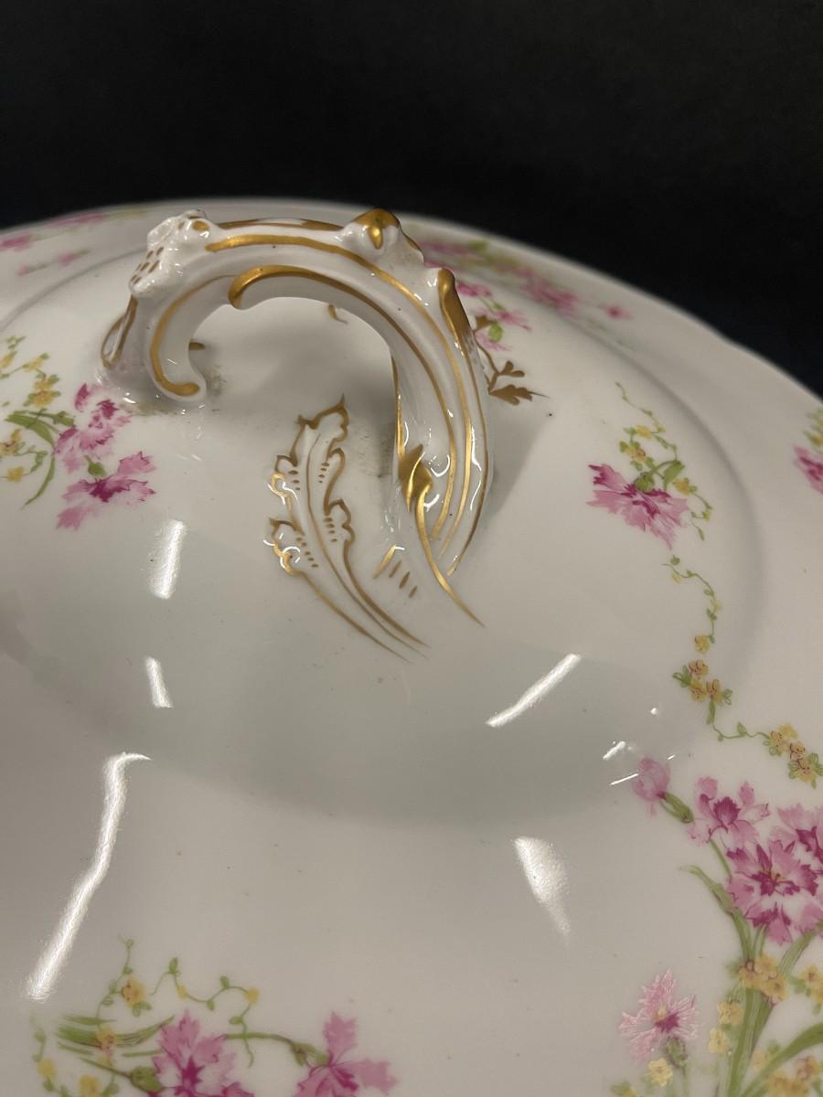 Vintage Limoges porcelain covered tureen. Porcelain is in excellent condition showing very minimal signs of wear. Does not include ladle. 13 1/4" wide from edge of handles x 8" deep.