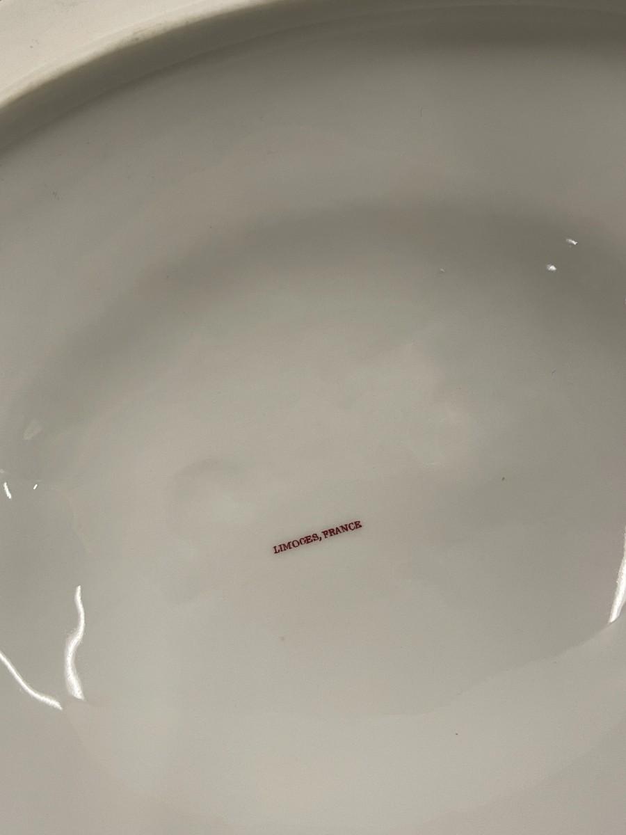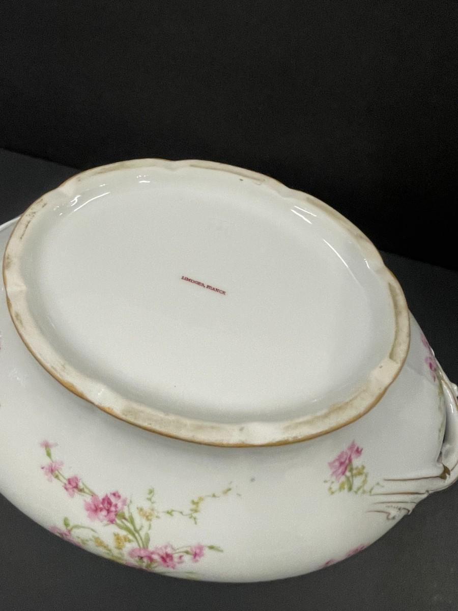 Vintage Limoges porcelain covered tureen. Porcelain is in excellent condition showing very minimal signs of wear. Does not include ladle. 13 1/4" wide from edge of handles x 8" deep.