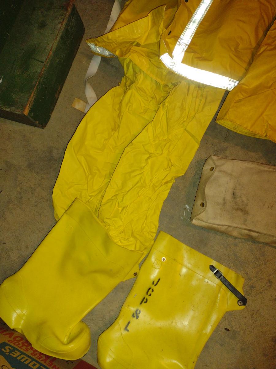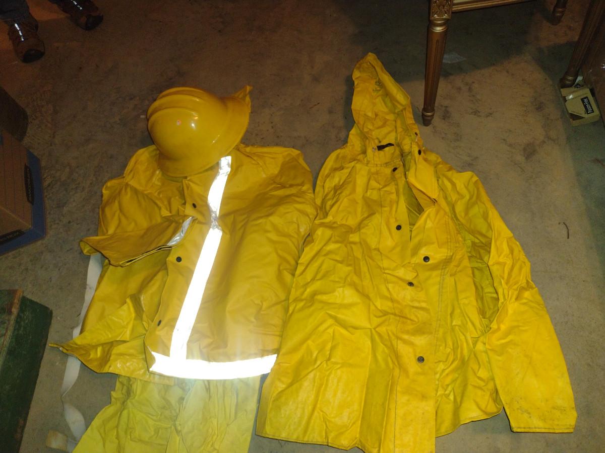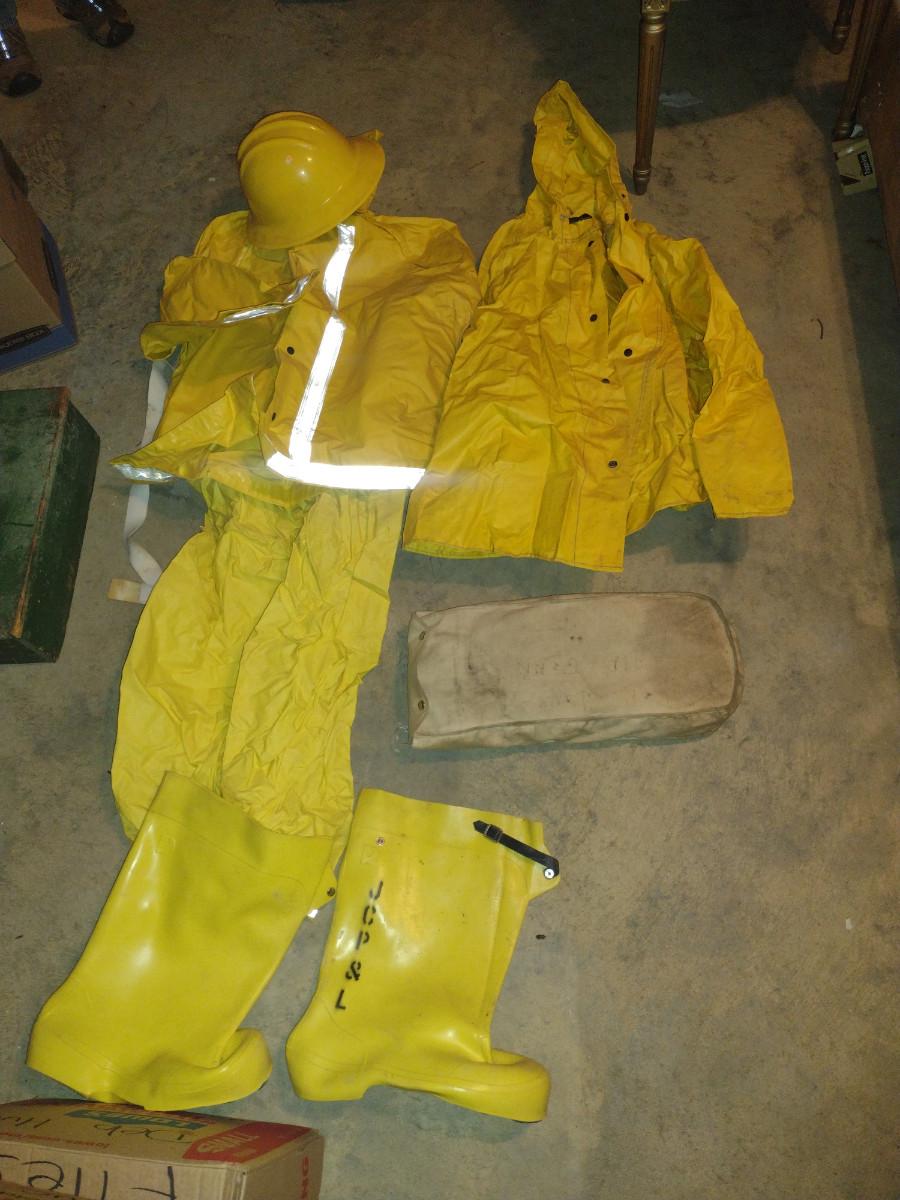 Vintage Lineman's Rain Wear. Two coats, pants, hard hat, boots. Jersey Central Power & Light (JCP&L). Size approx 2XL.