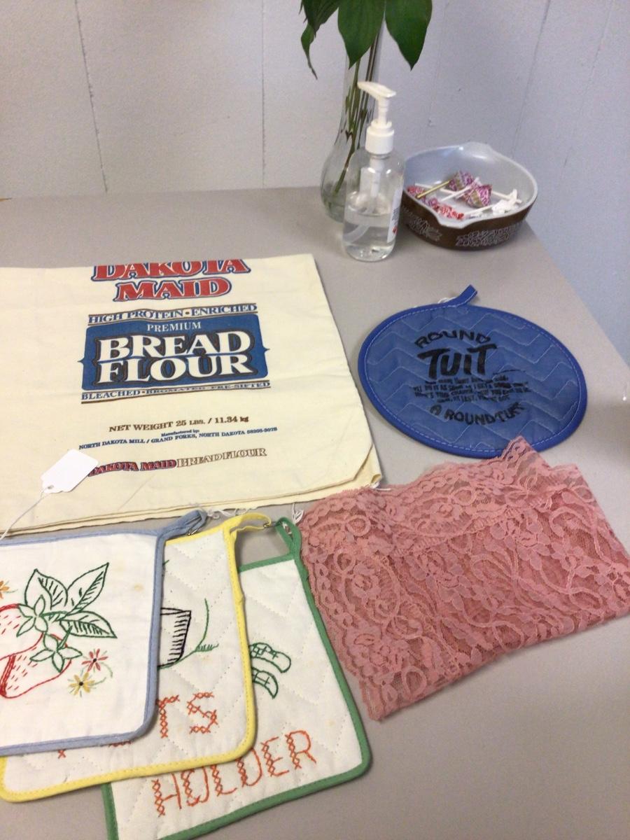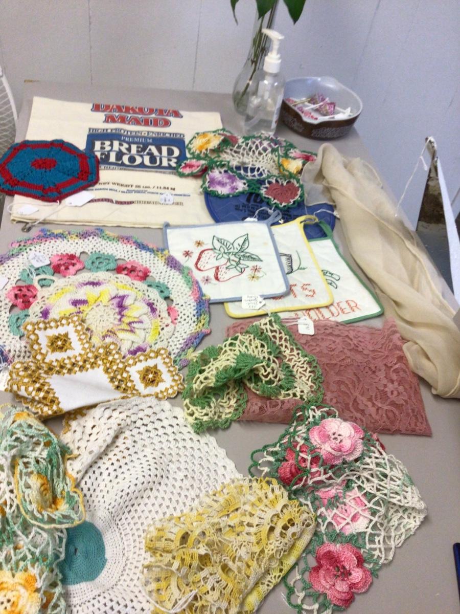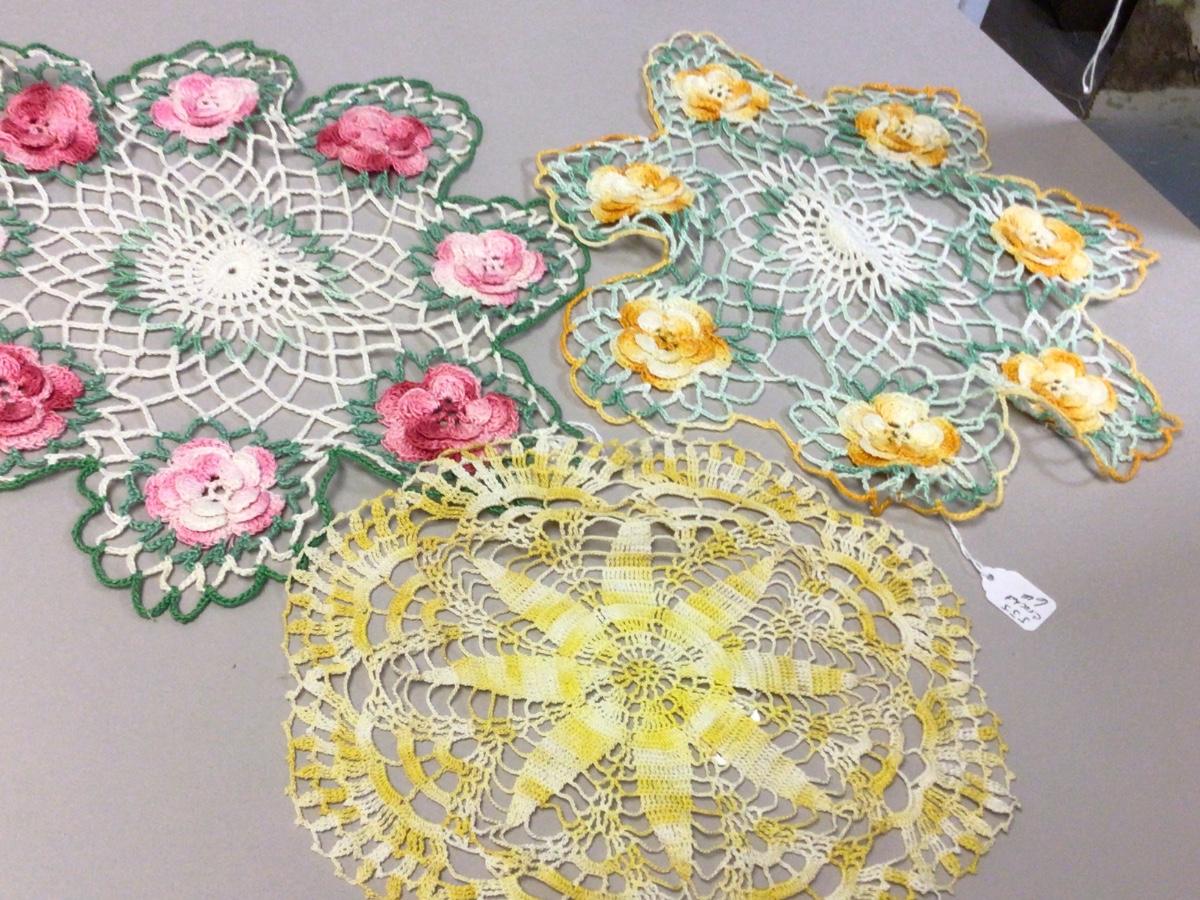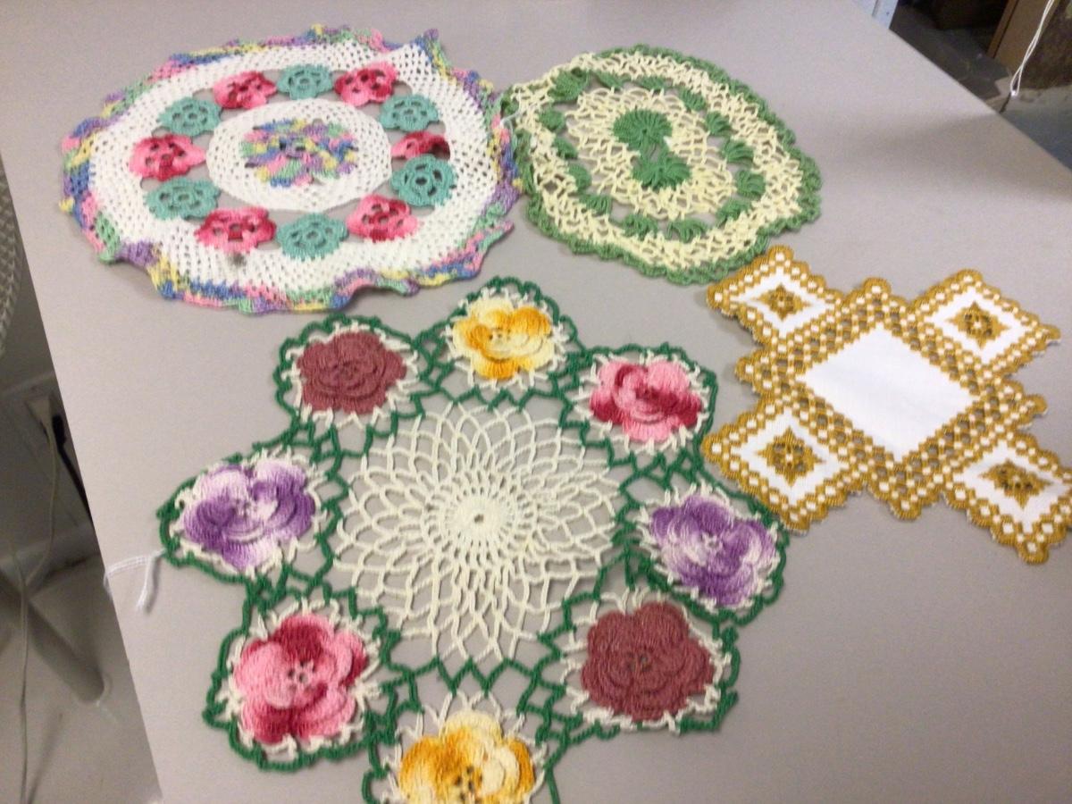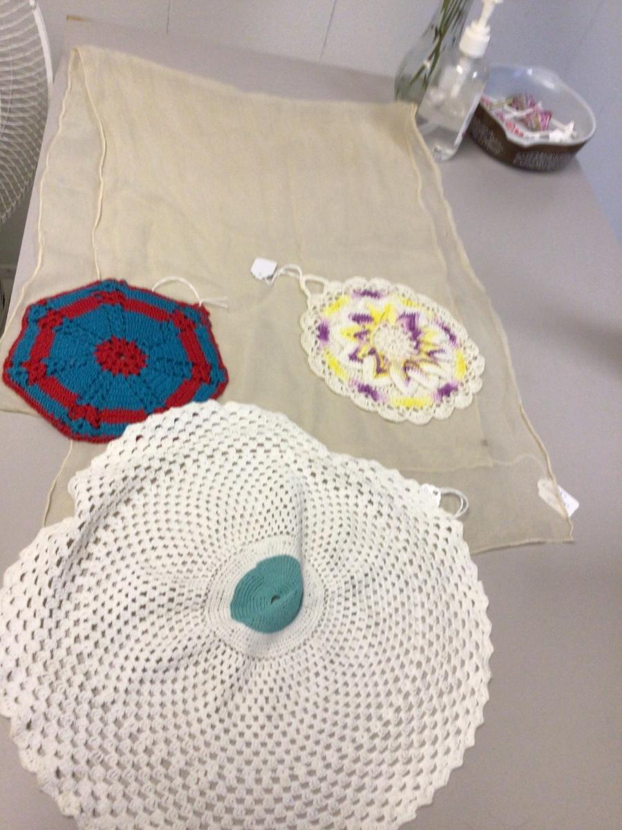 More crochet doily’s, flower bag, pot holder, scarf, lace runner