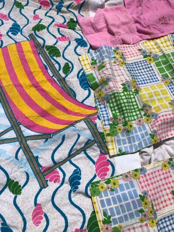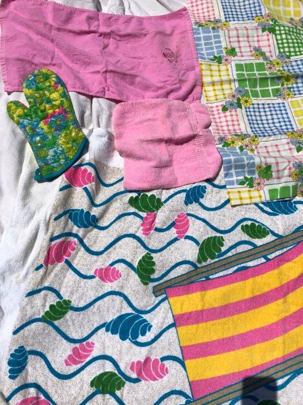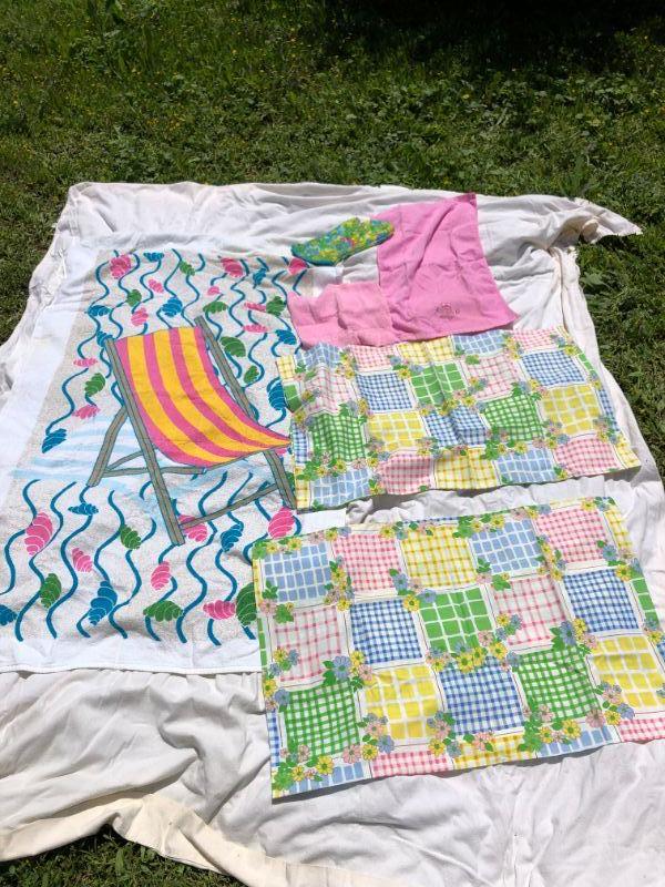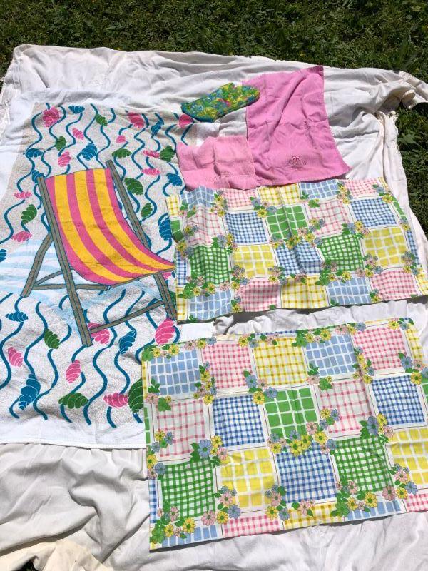 VINTAGE LINEN LOT - Beach Towel, 2 pillowcases, hand towel, oven mitt in Retro colors