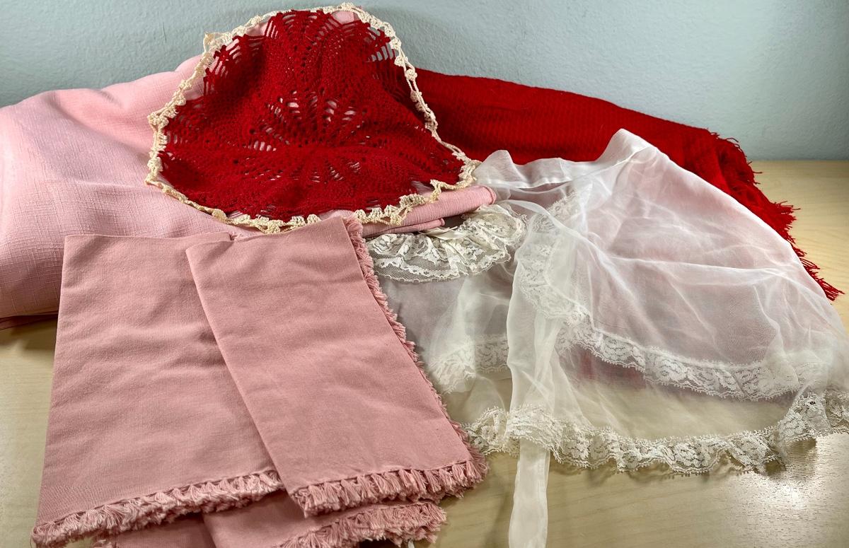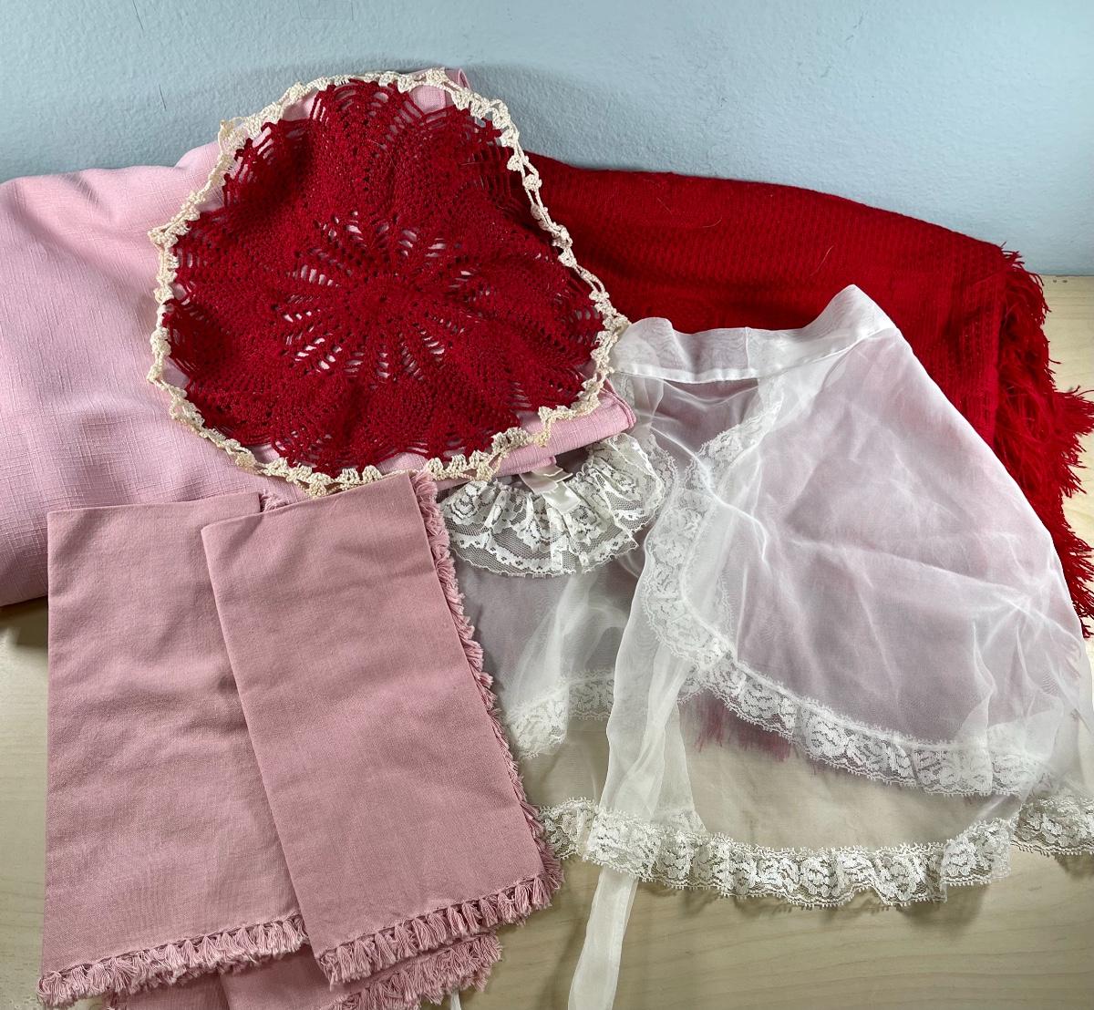 Vintage Linen lot, apron, lap blanket, tablecloth and napkins, doily
