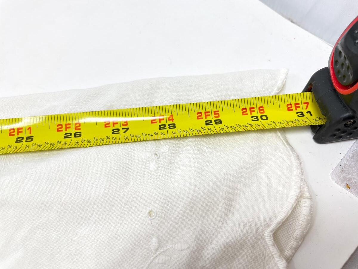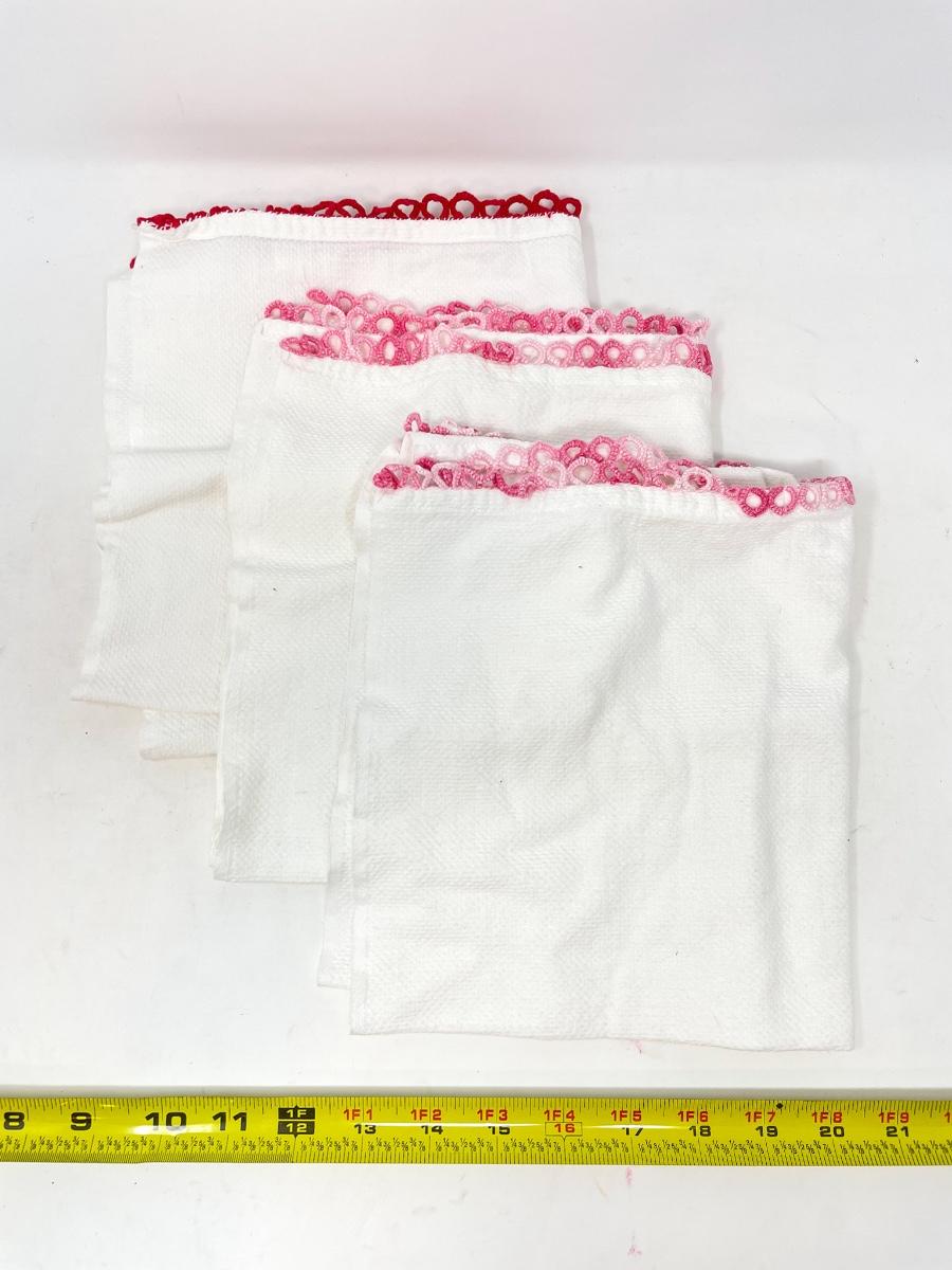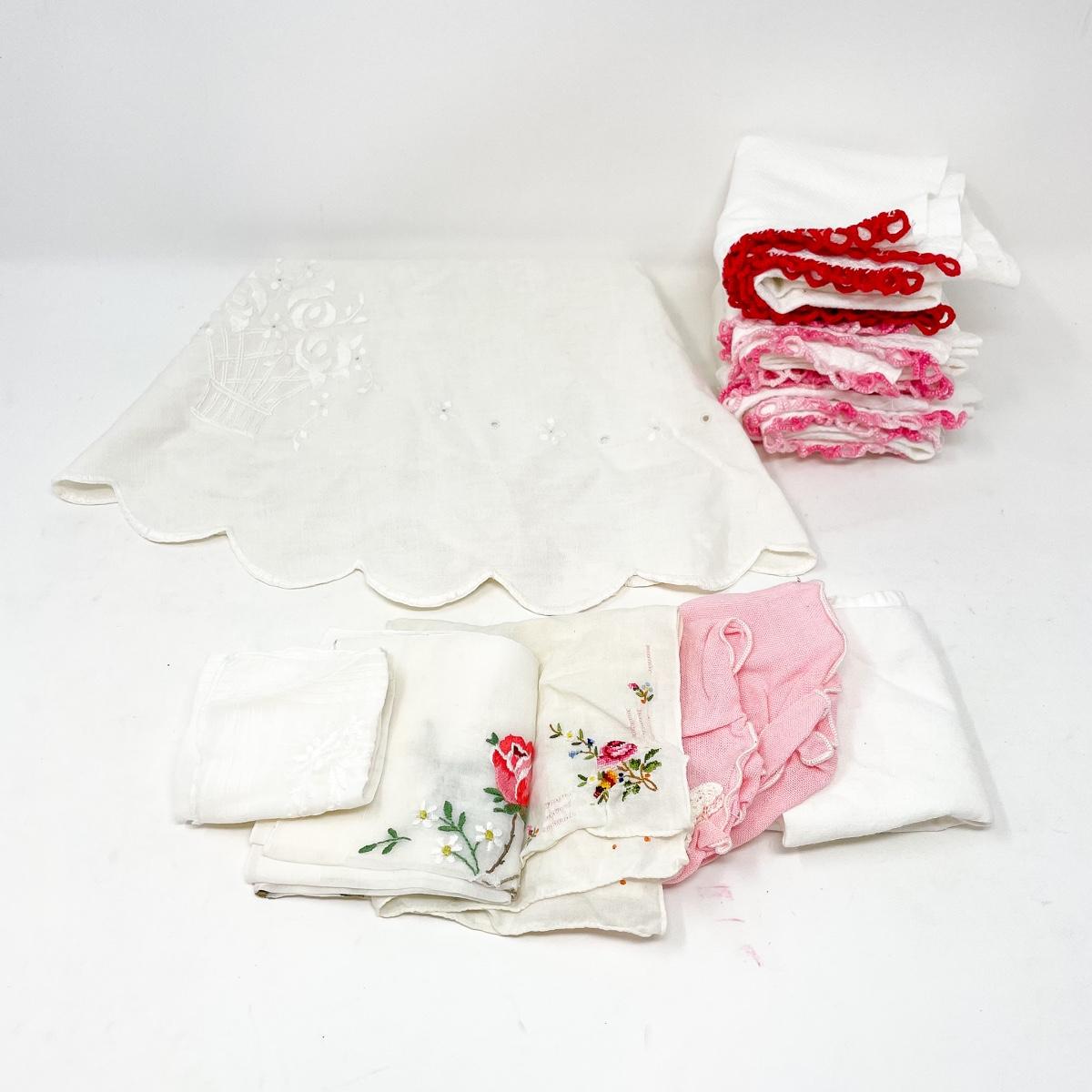 Includes 5 embroidered handkerchiefs, one plain white napkin (?), 3 napkins with embellished edges, and small round embroidered tablecloth (approx 30-31” in diameter). All appear to be in good condition, no holes or stains found.