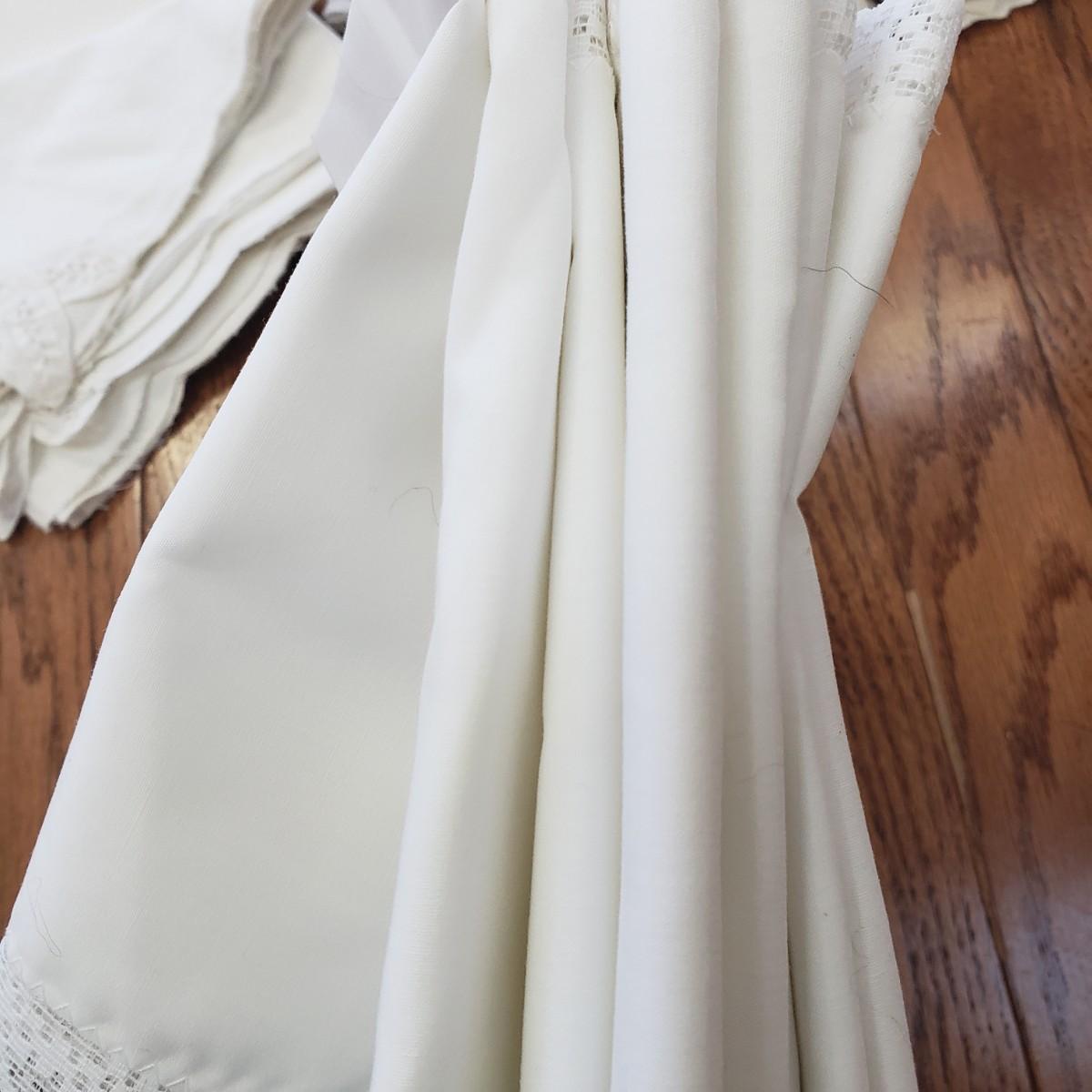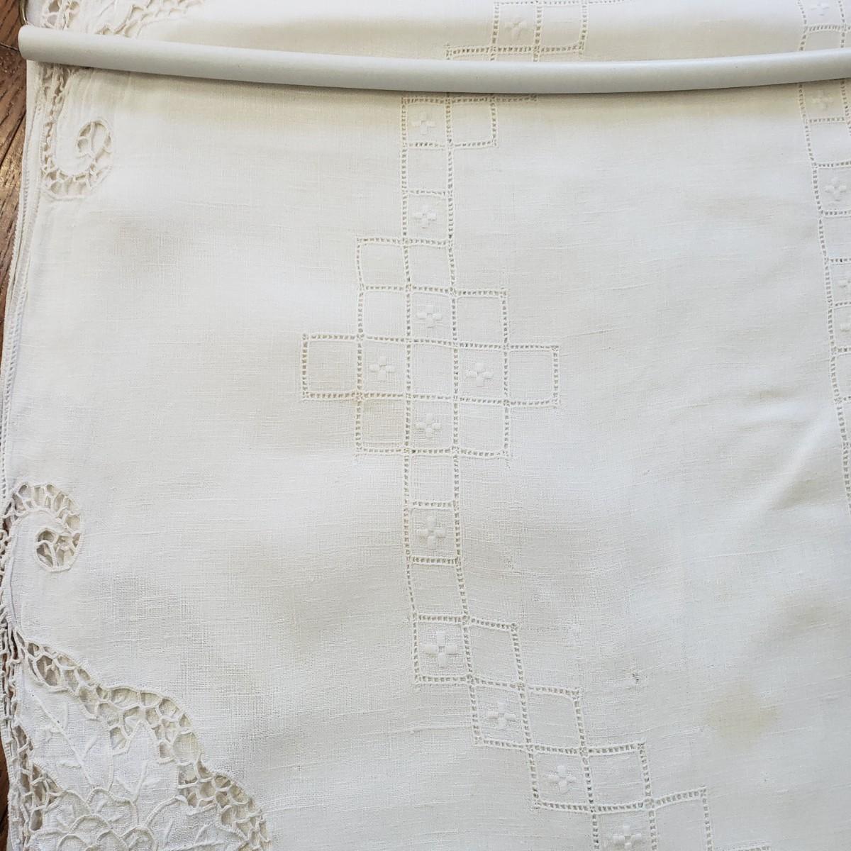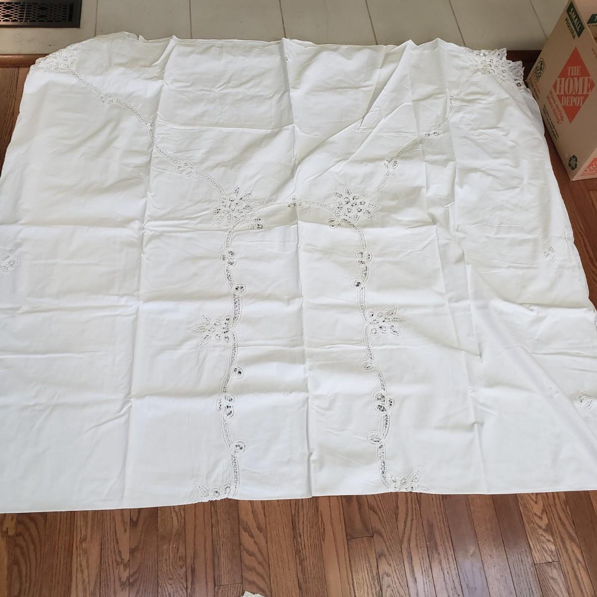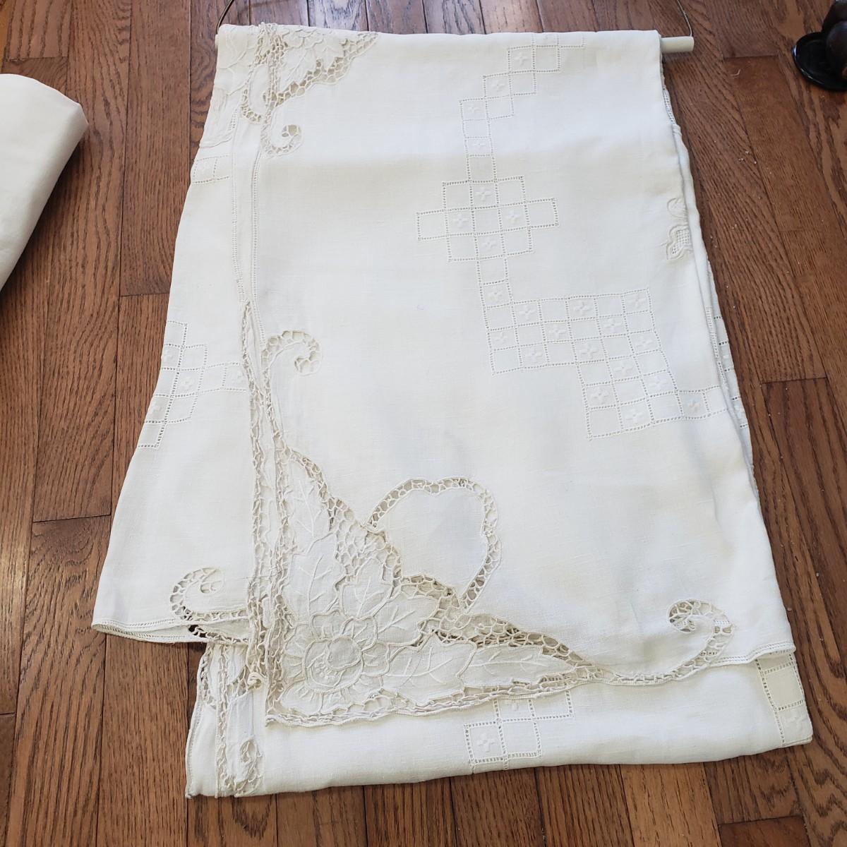 This gorgeous linens lot has just beautiful craftsmanship! All table cloths are rectangular and measure approximately 8' x 5' and longer. There is some staining to some pieces, but are clean. The Asian runner measures 13' and has some staining.