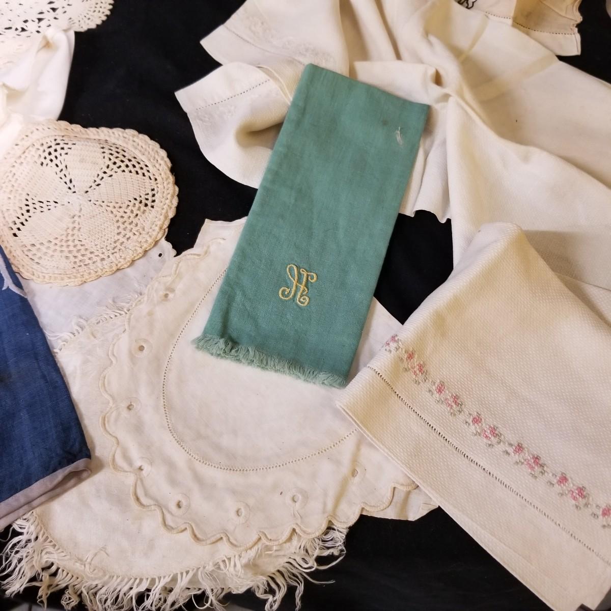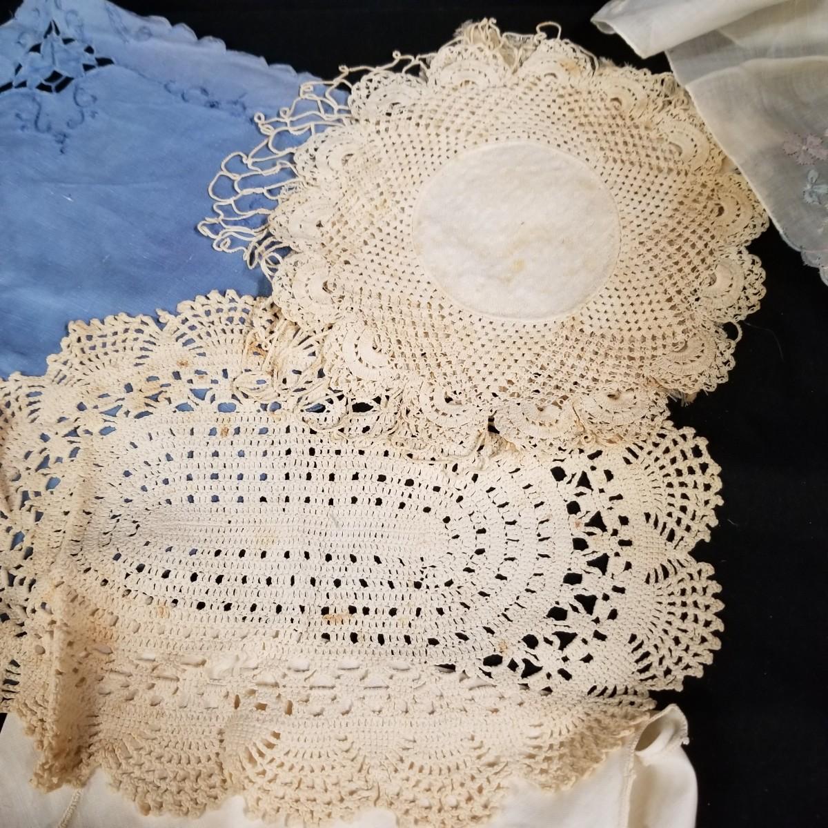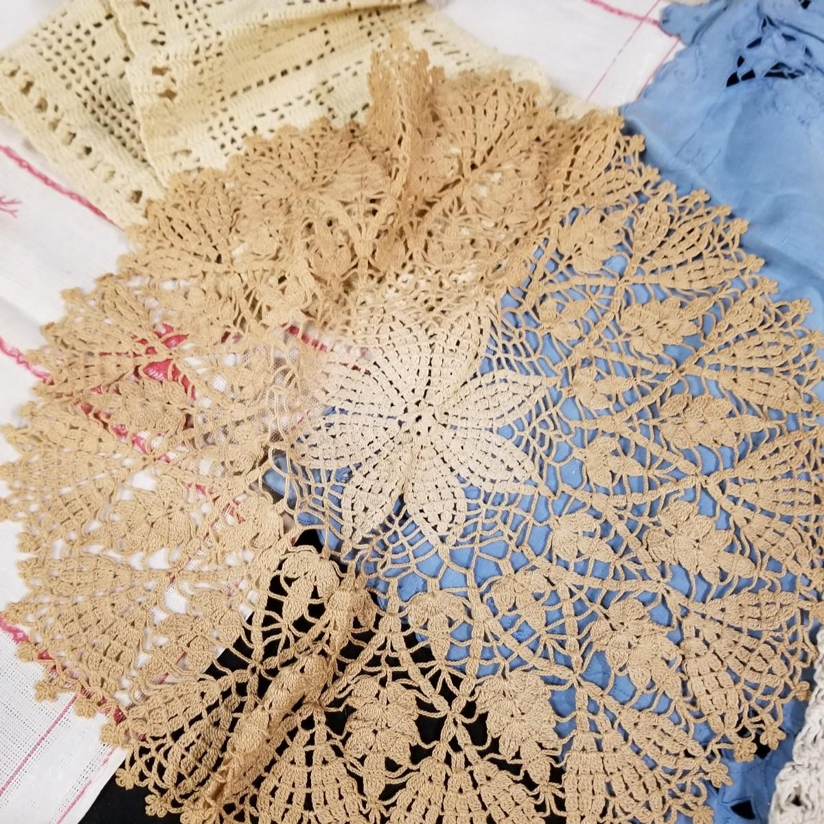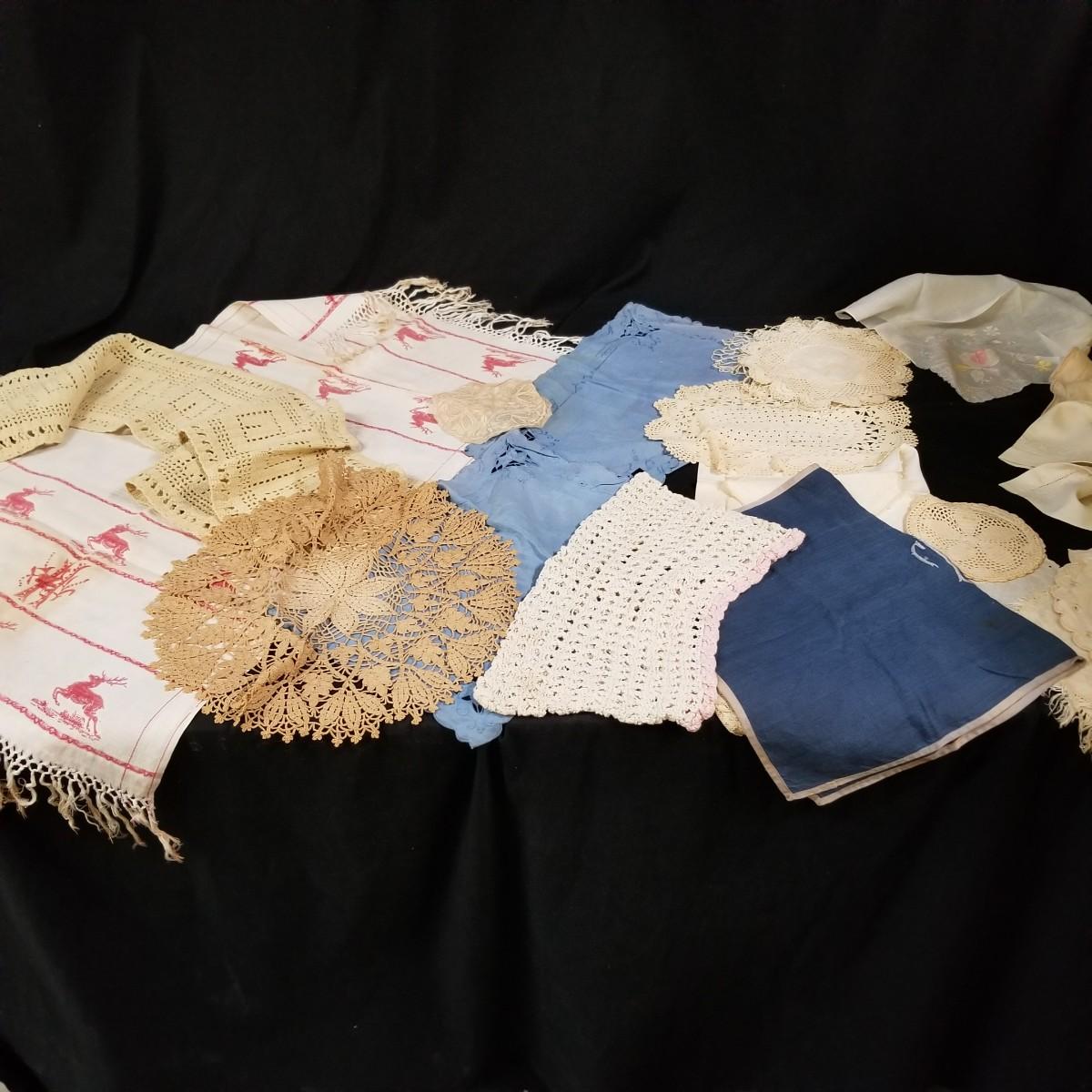 A nice assortment of vintage tablecloths, napkins, runners and doilies. Many different styles, crochet, woven, etc.  Tablecloths range in size from 48"x48" to 54"x68".  Note some discoloring on older items, see photos for detail.  Shipping available.