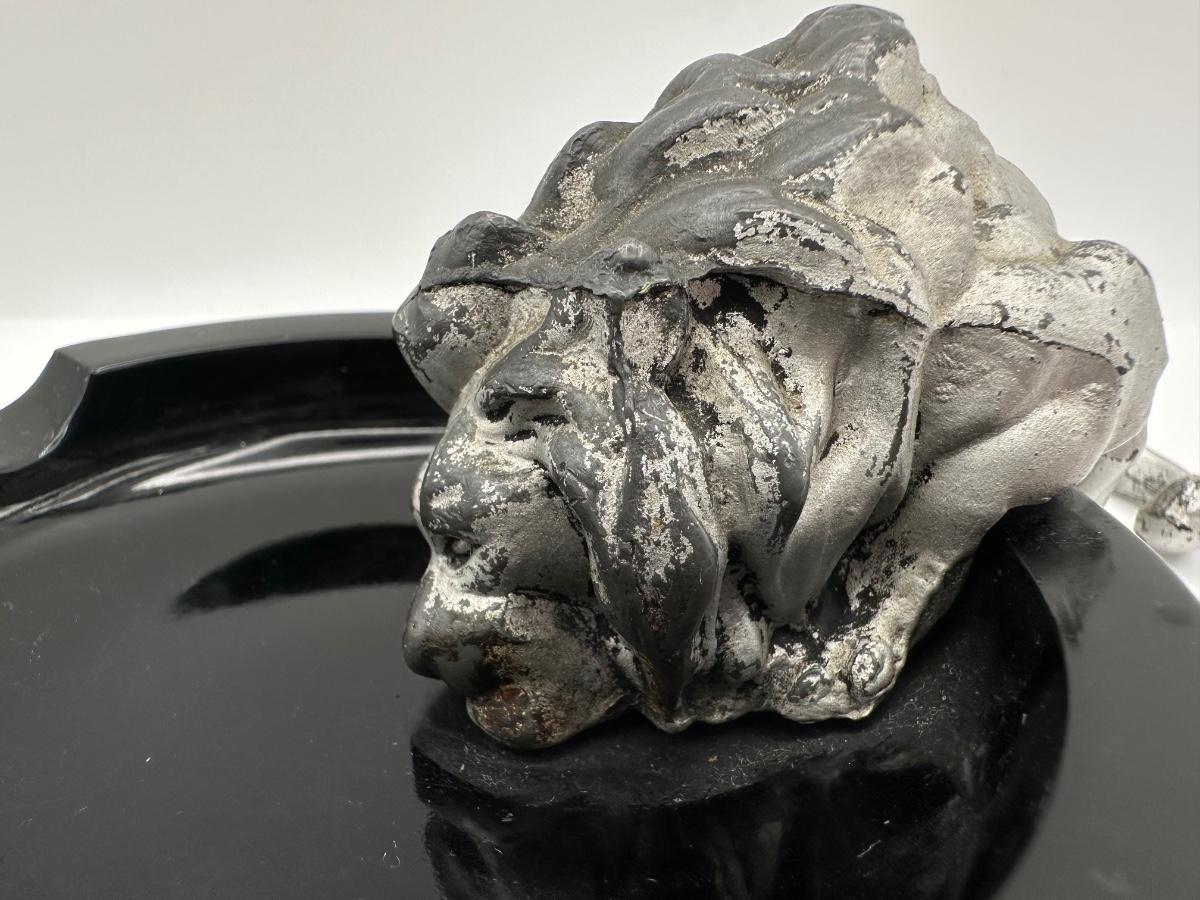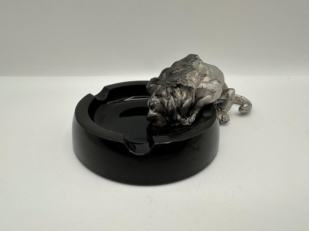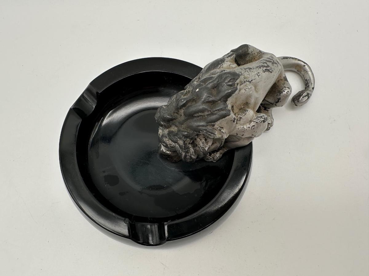 Vintage Lion Figural Ashtray – Cast Metal & Black Glass