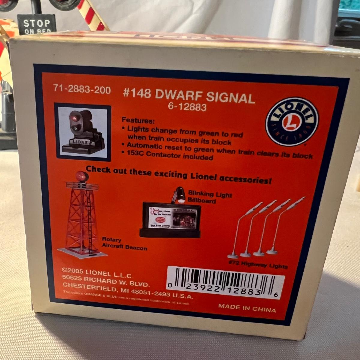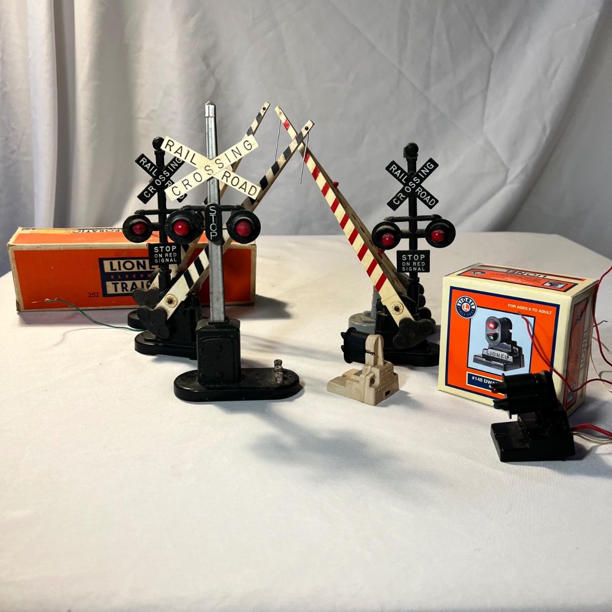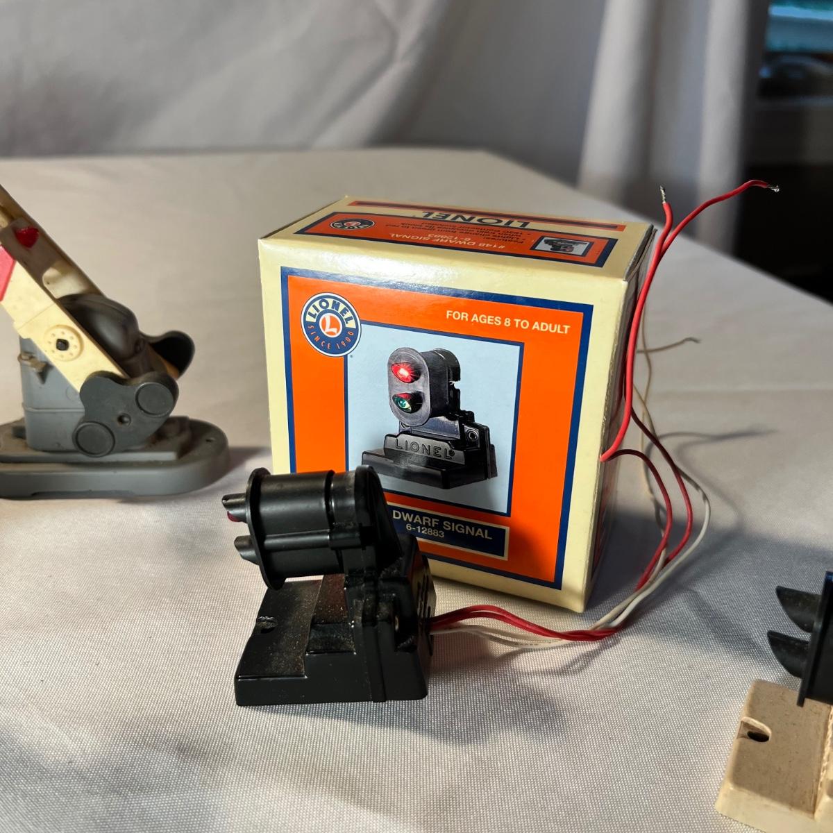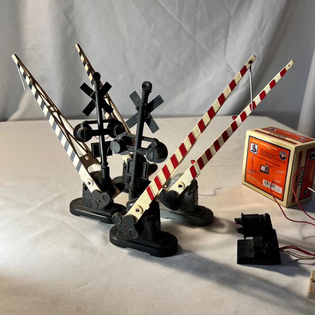 An assortment of mostly metal Lionel crossing gates and dwarf signals. See photos for more information. None of these items have been tested. One signal comes with original box which has some wear to it.