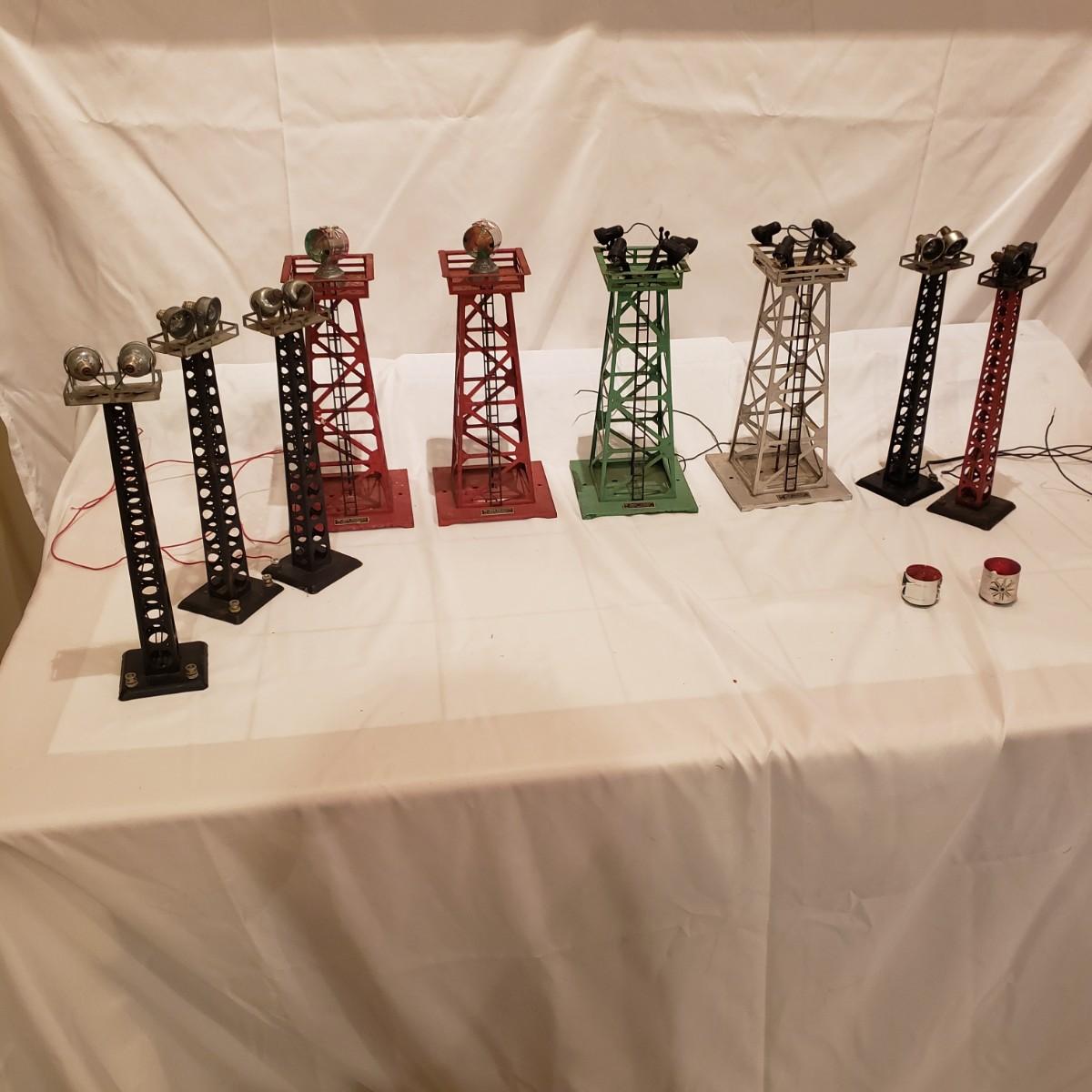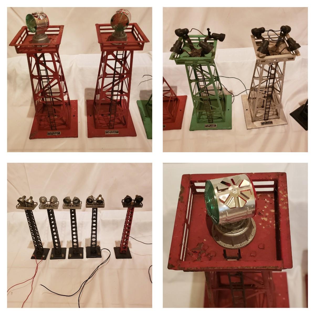 This lot contains 10 post war Lionel rotary beacon lights and flood lights. The larger beacon/flood lights are No.394 and 395 and measure 5" x 5" x 12"H. The smaller flood lights measure 3" x 3" x 12"H. There are two extra beacon lights in a box. Some lights have wires, while others do not, see pictures for details. These are electrical but have not been tested.