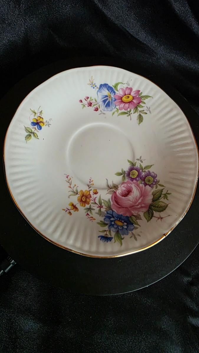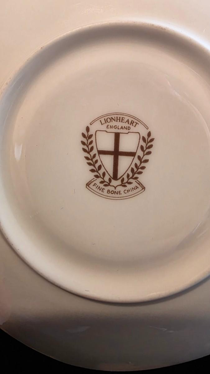 Marked “Lionheart England Fine Bone China” beneath, the emblem of the cross and laurel crest symbolizes enduring heritage—a brand that carried the pride of postwar English ceramics. Whether displayed under cabinet light, styled in a cottagecore vignette, or used to host afternoon tea, this set whispers of refinement and nostalgia. It’s a vessel of both history and grace, made not just to hold tea—but to hold memory.