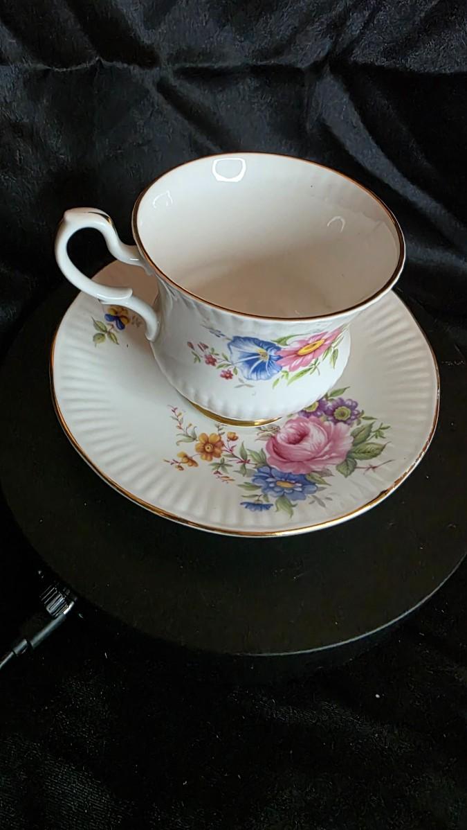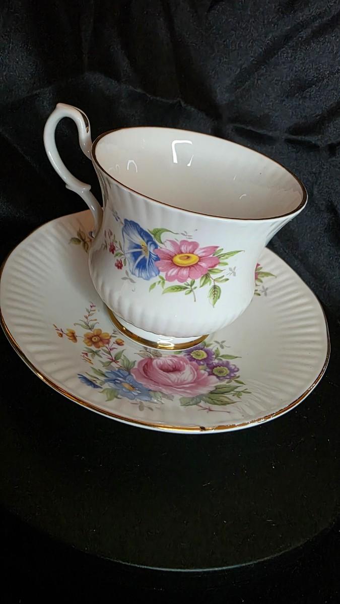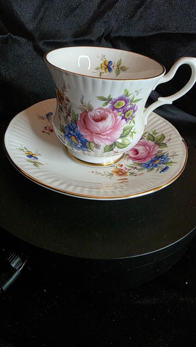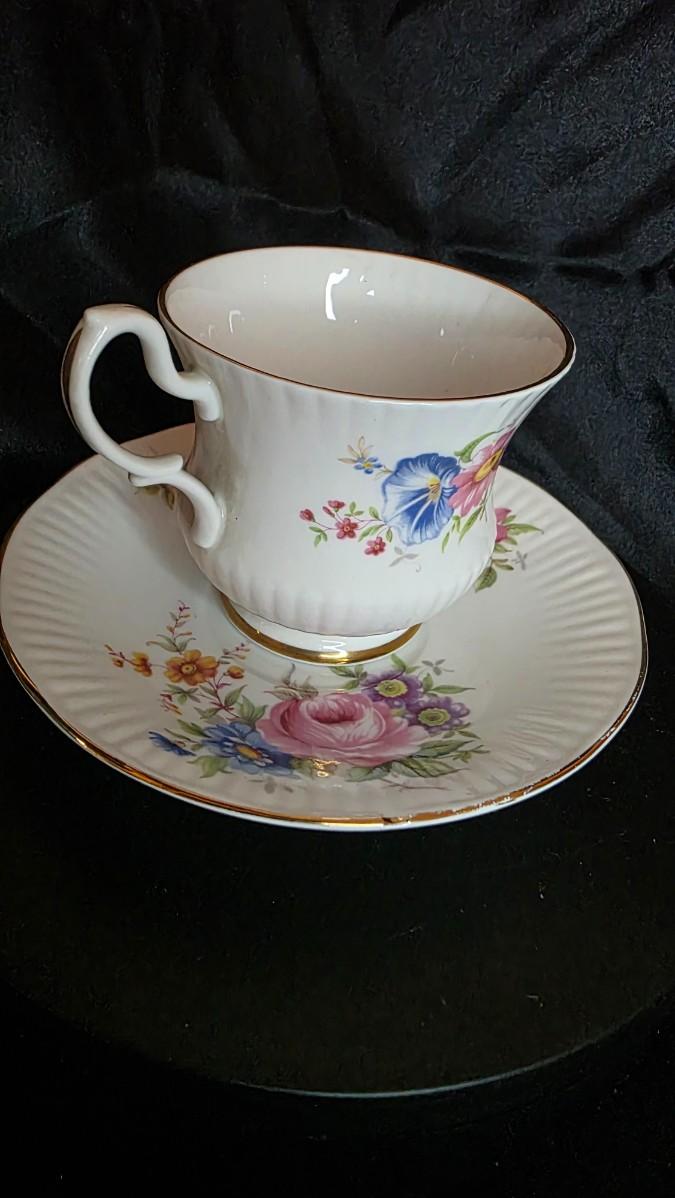 This exquisite vintage Lionheart England Fine Bone China teacup and saucer set stands as a timeless expression of English refinement and artistry. Crafted from the highest-quality fine bone china, it captures that delicate balance between lightness and strength that defined England’s golden age of porcelain production. The set features a gently fluted cup and saucer with scalloped rims, each edge delicately lined with 24-karat gold trim—a subtle accent that catches light like a soft whisper of luxury.