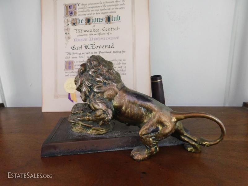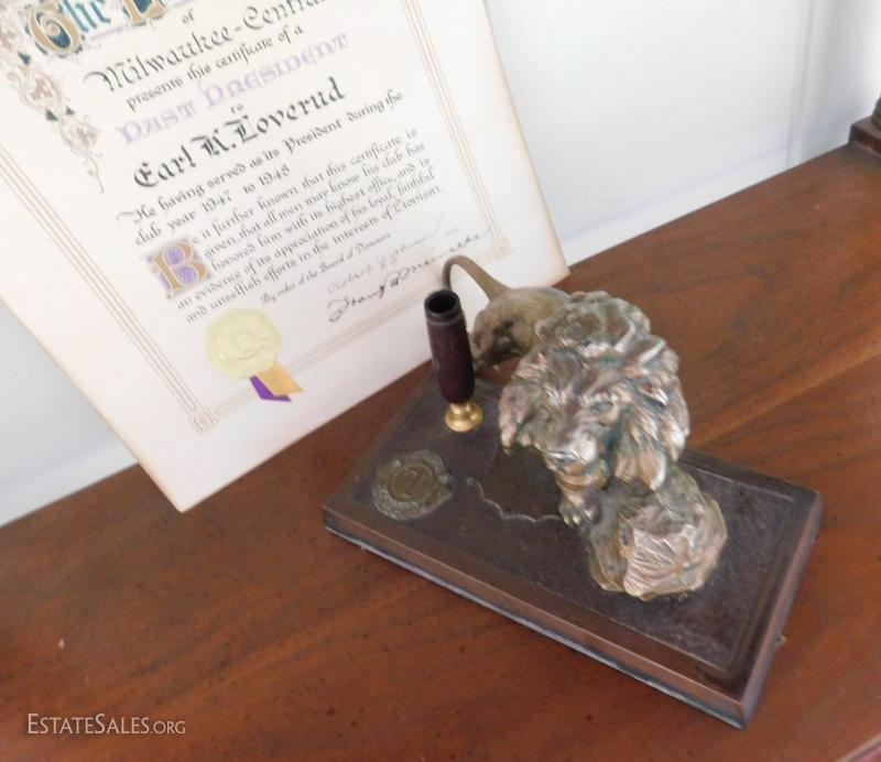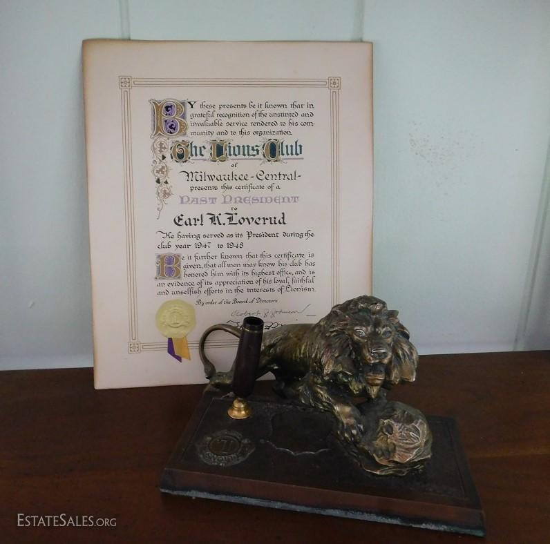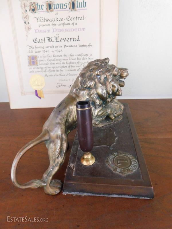 Vintage Lions Club honorary desk pen holder with plaque and solid brass lion. This was given to past president who served from 1947-48 in Milwaukee. Nice in size and very heavy. All solid brass. Some patina on lion and plaque. Needs some cleaning but in good shape. Shipping Available.