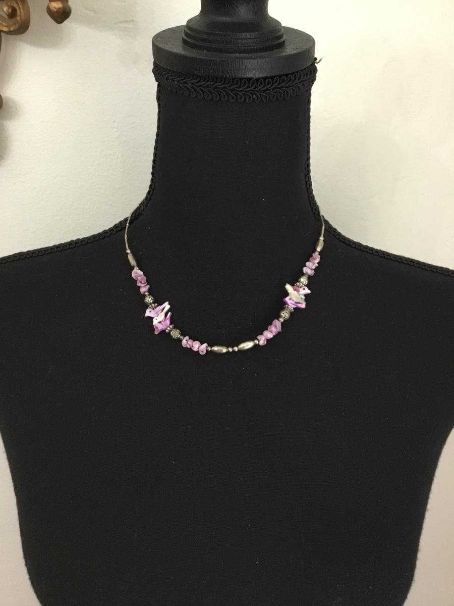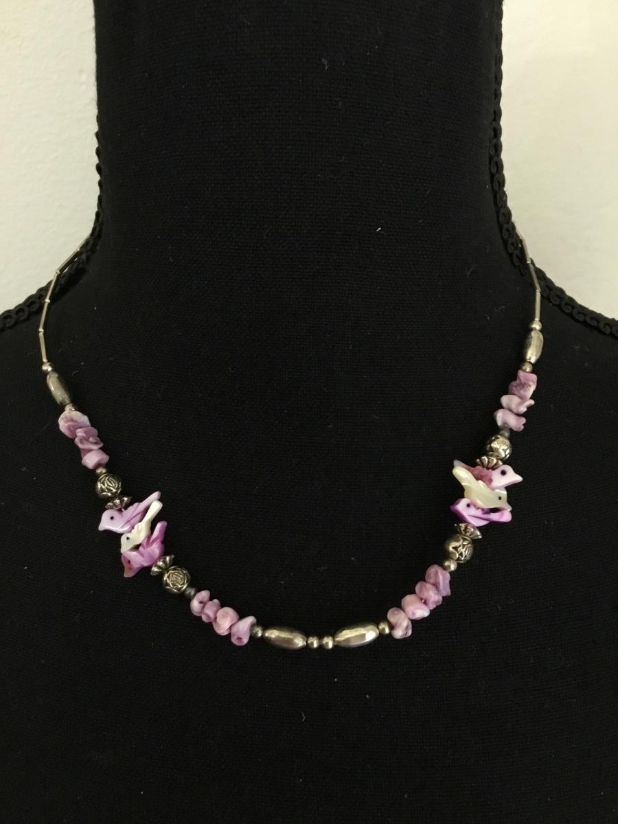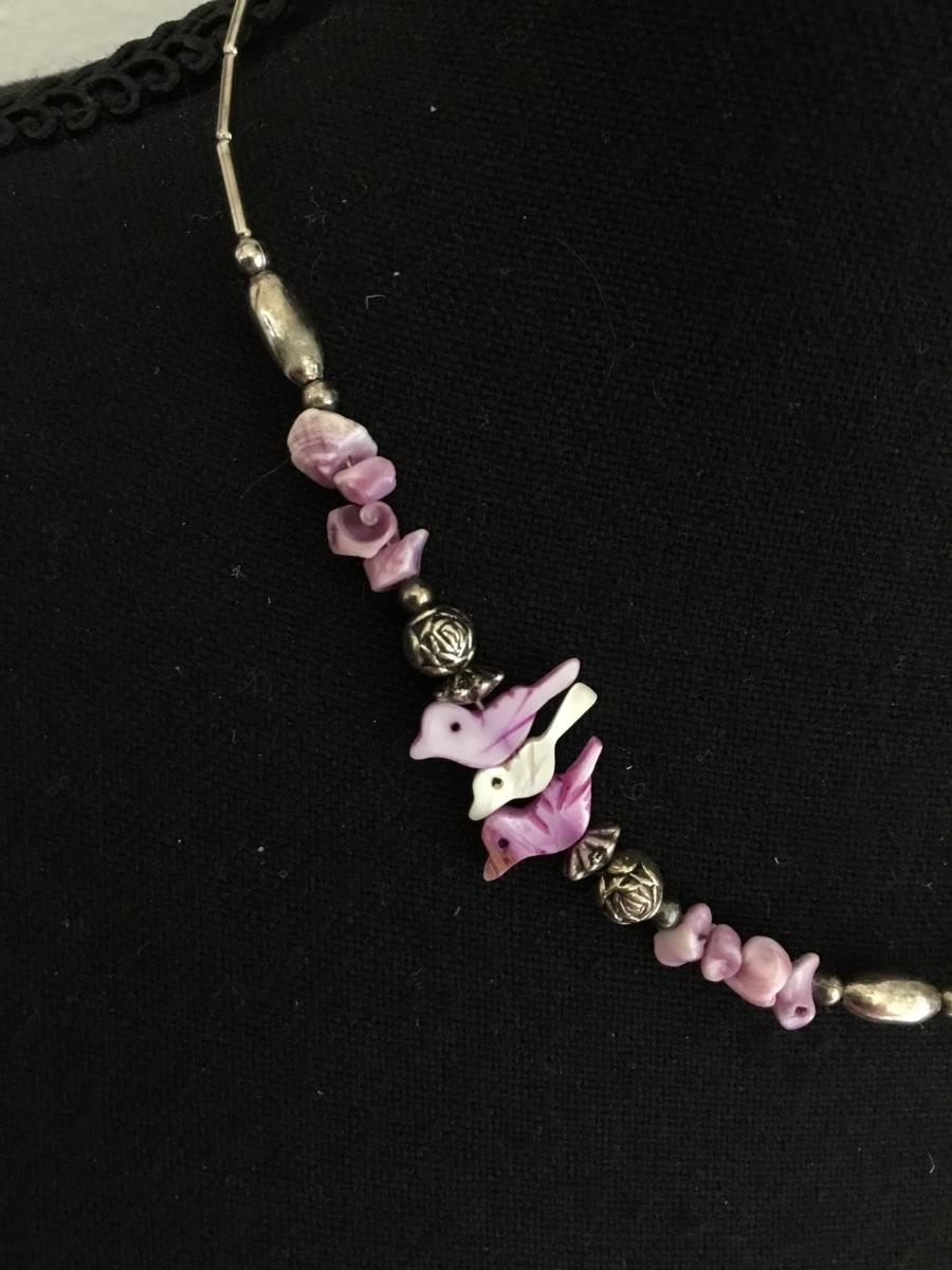 Vintage liquid, silver mother of pearl bird fashion necklace barrel clasp