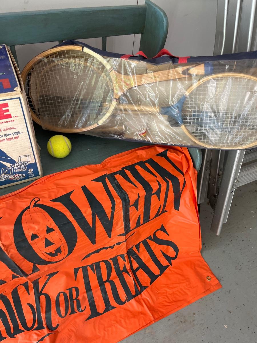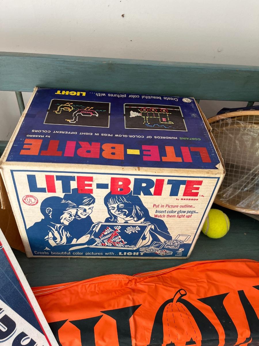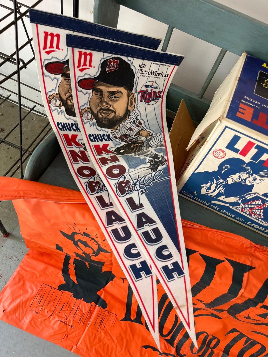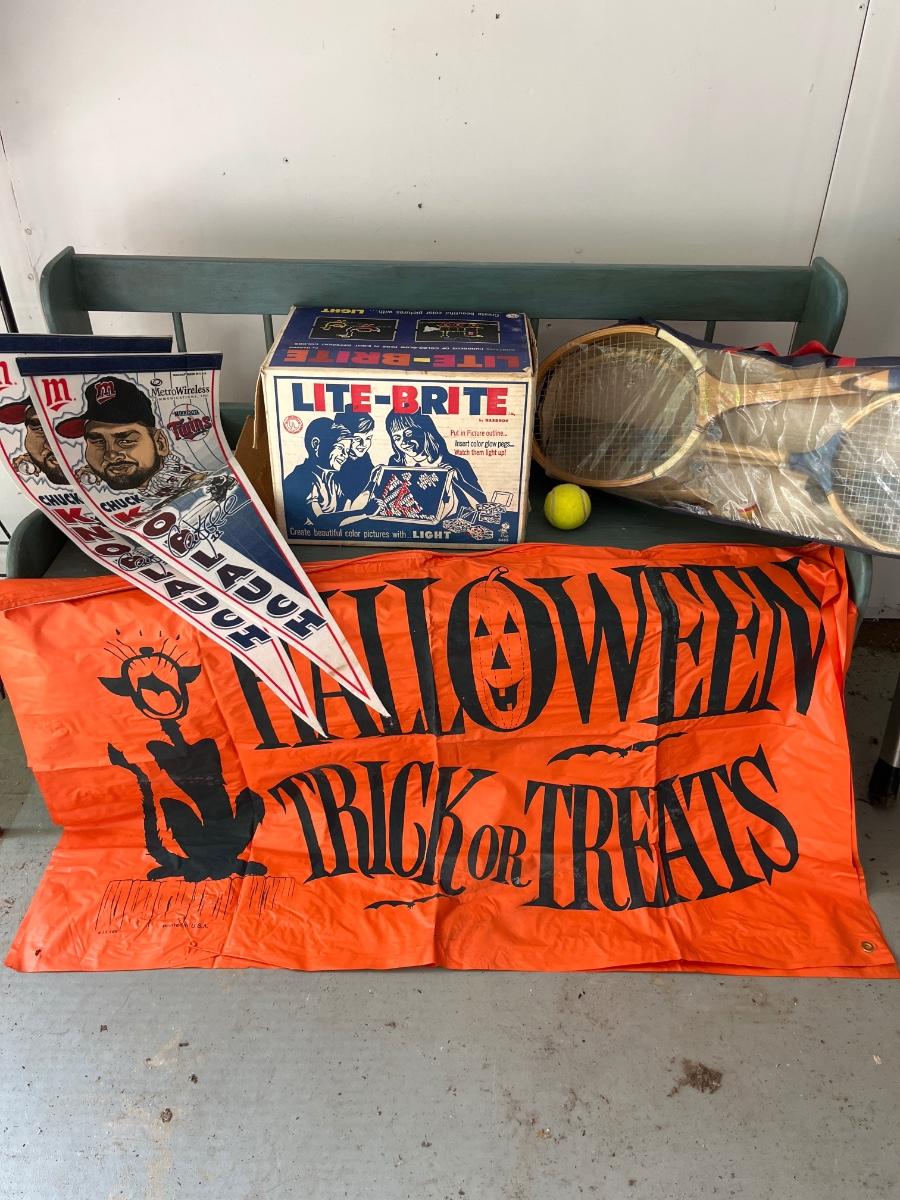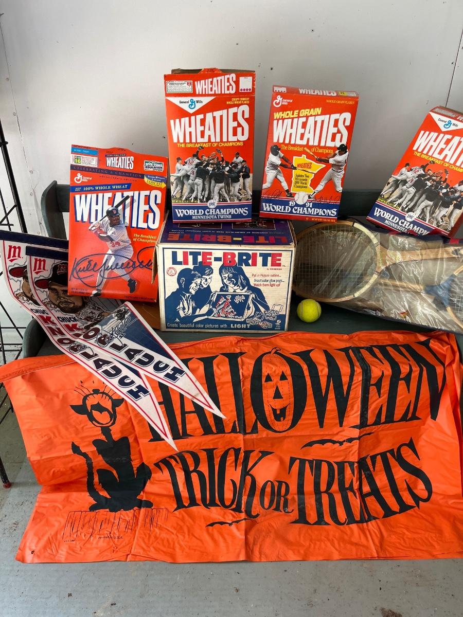 Vintage LiteBrite, Wheaties boxes, badminton set, Minnesota Twins, pennants, and Halloween sign