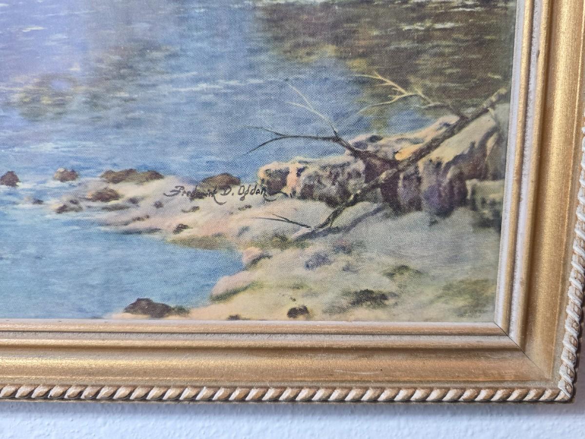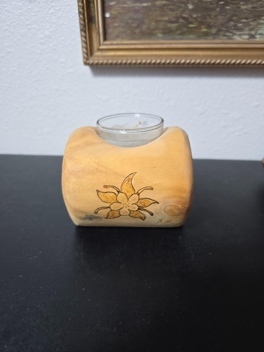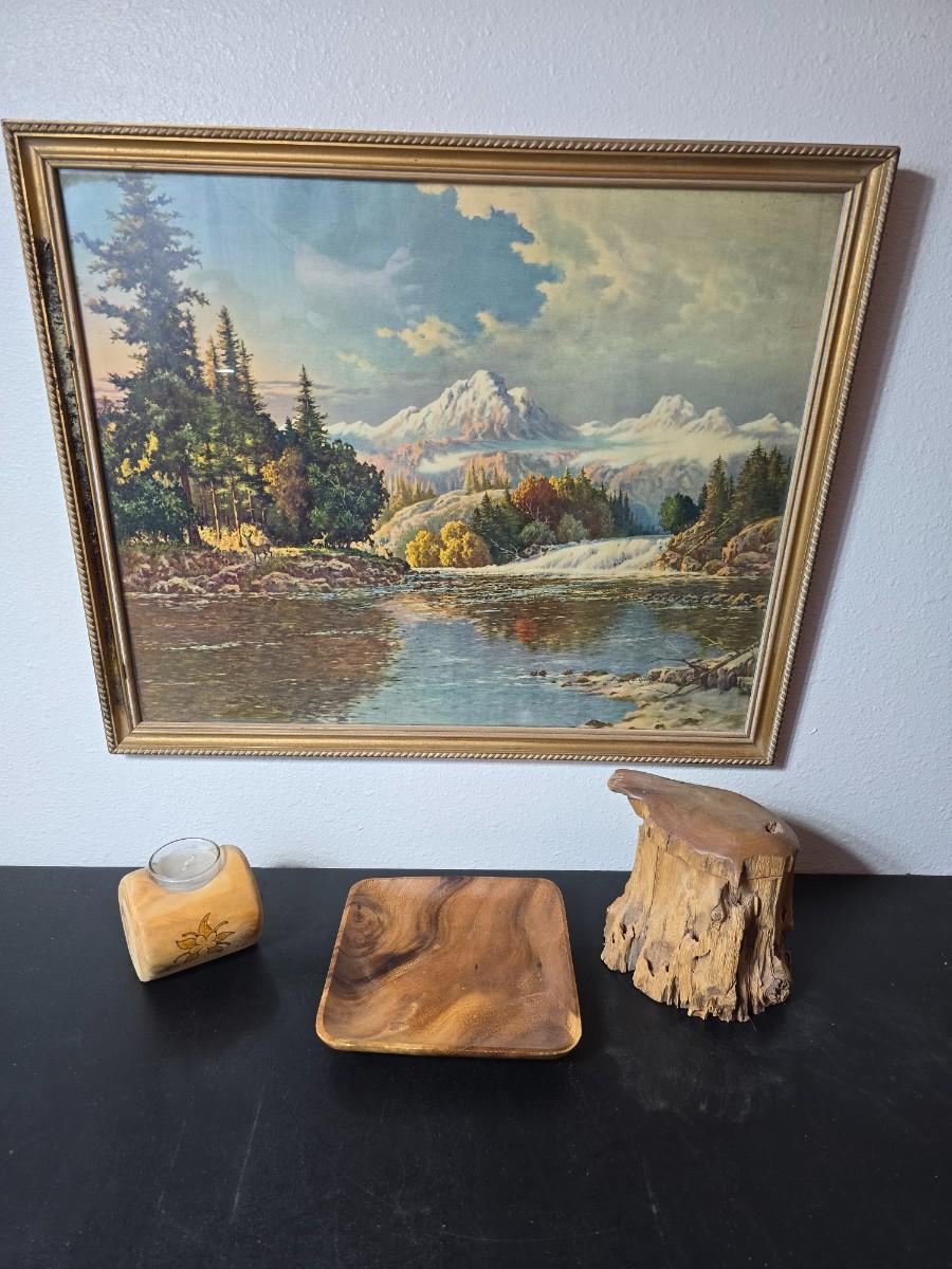 vintage lithograph print by the artist Frederick D. Ogden (1892-1948). - Wooden candle holder & Colorado Juniper hand carved jewelry box and a wooden tray