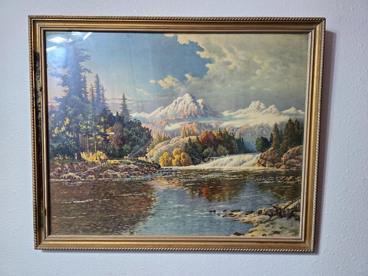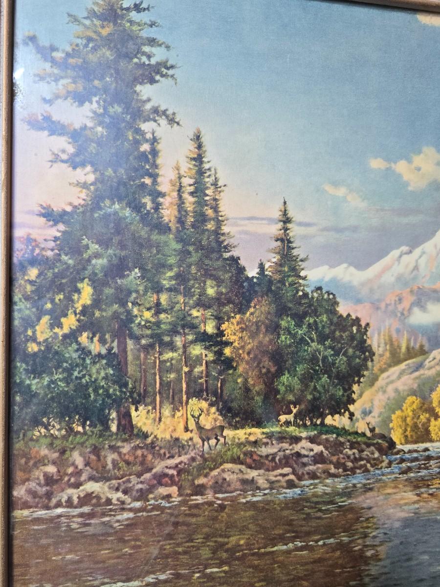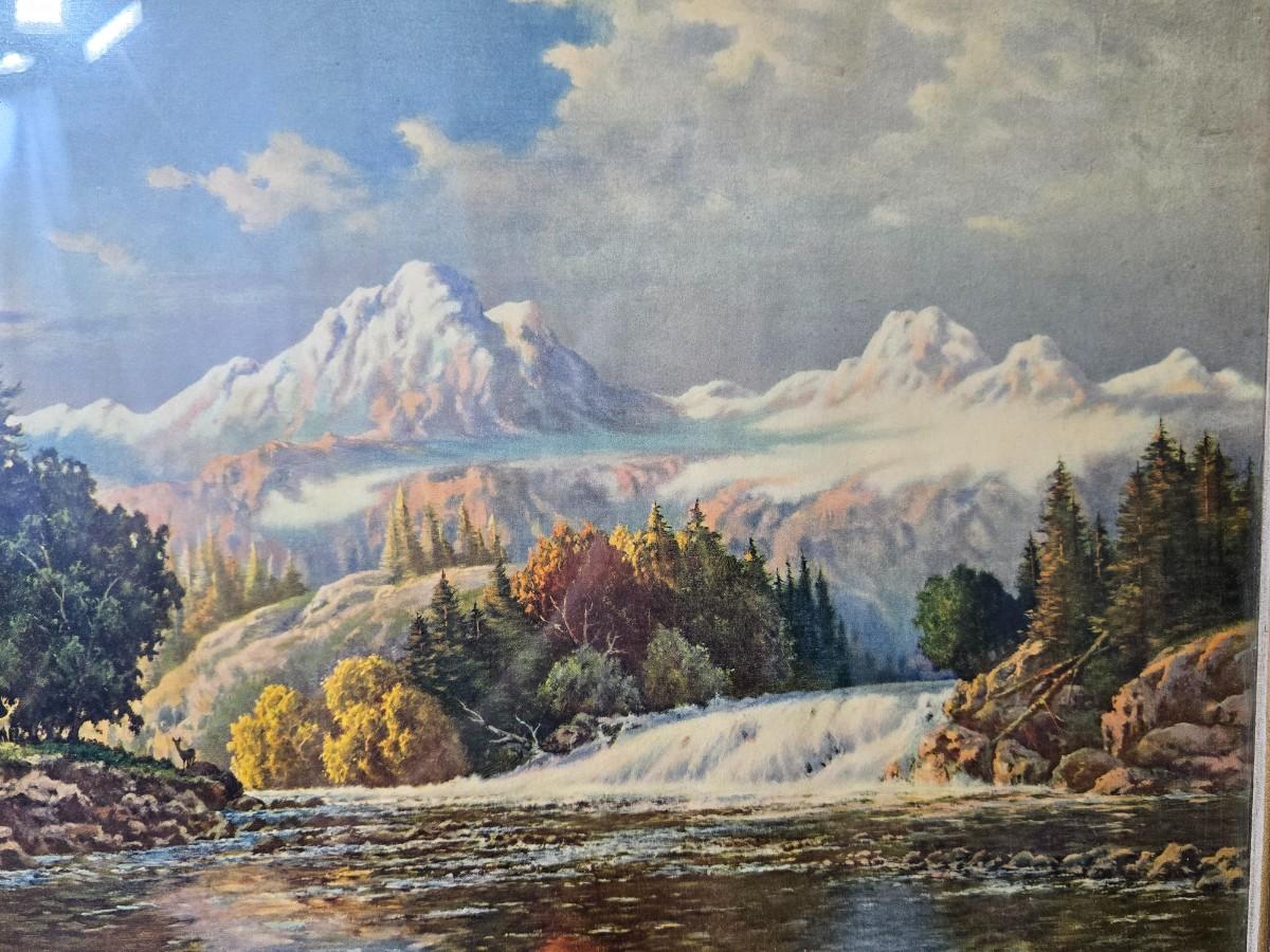 The print, which is also known by titles such as "Bow River Falls," "River Falls," or "Deer at a Mountain Stream,"