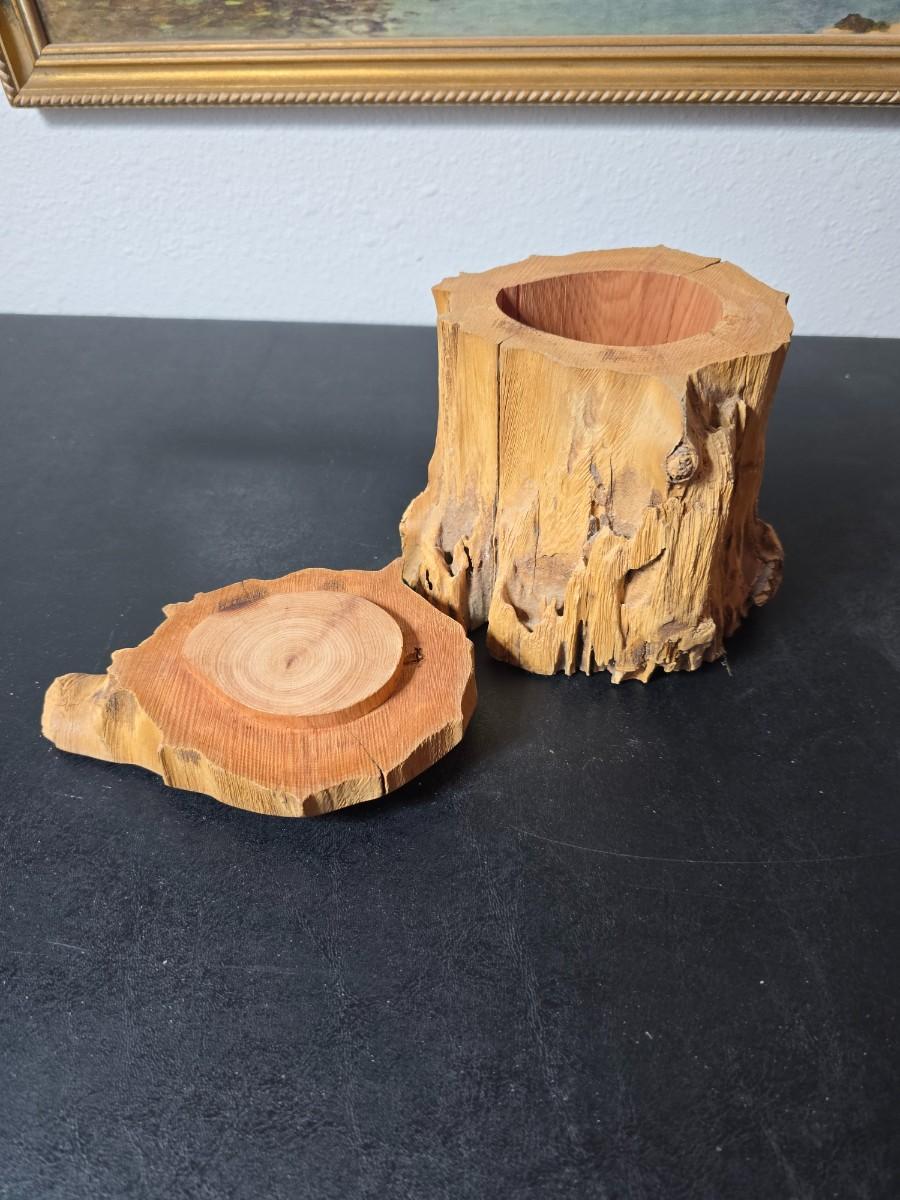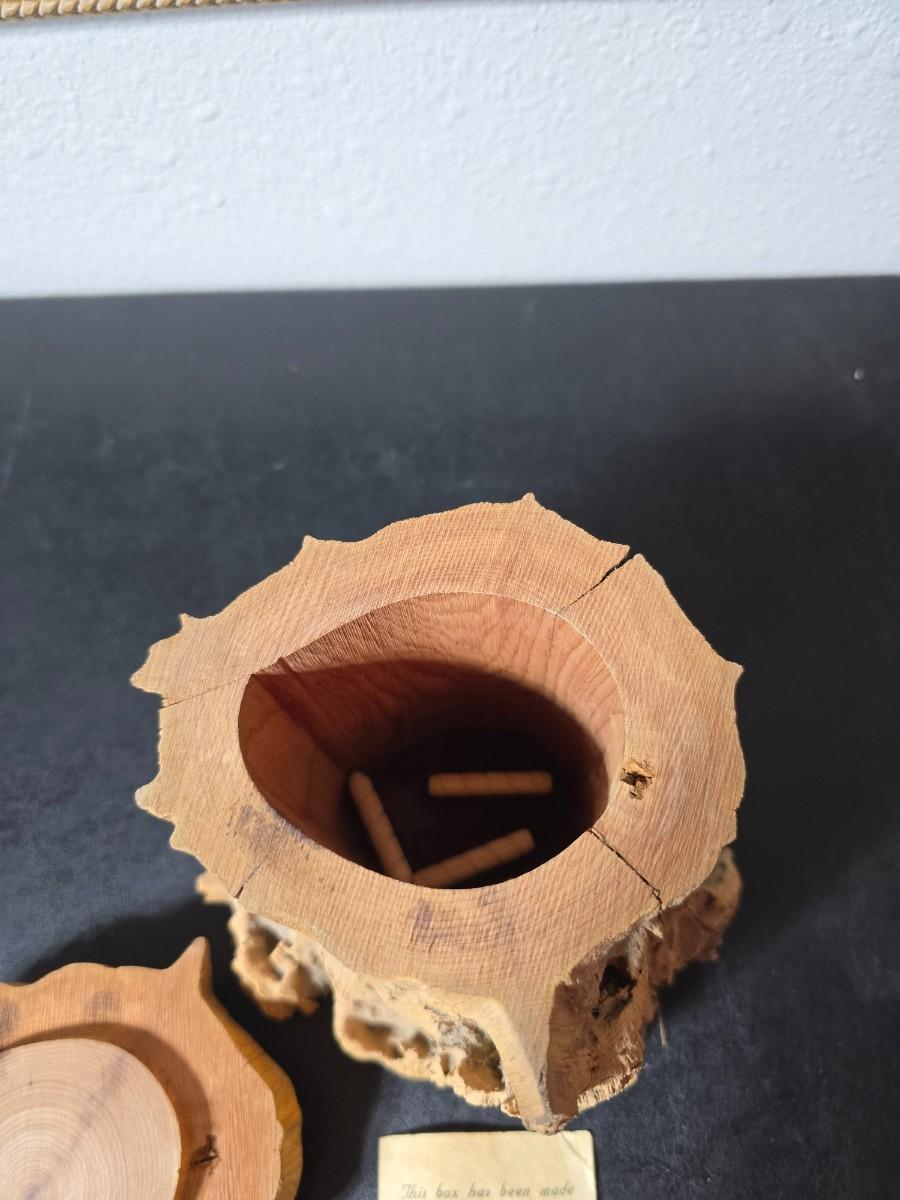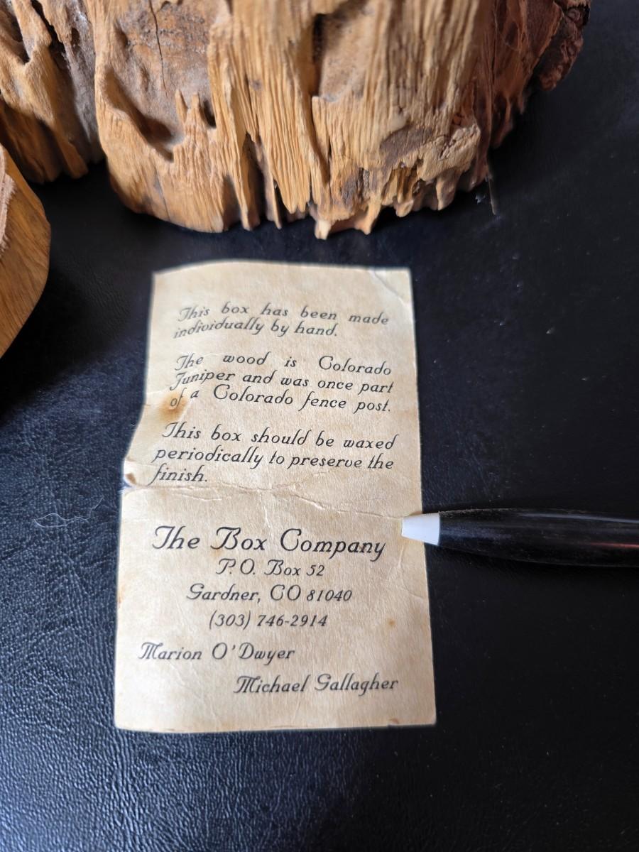 The Jewelry box has been made individually by hand. The wood is Colorado Juniper and was once part of a Colorado fence post. Made by the Box Company, Marion O' Dwyer & Michael Gallegher.