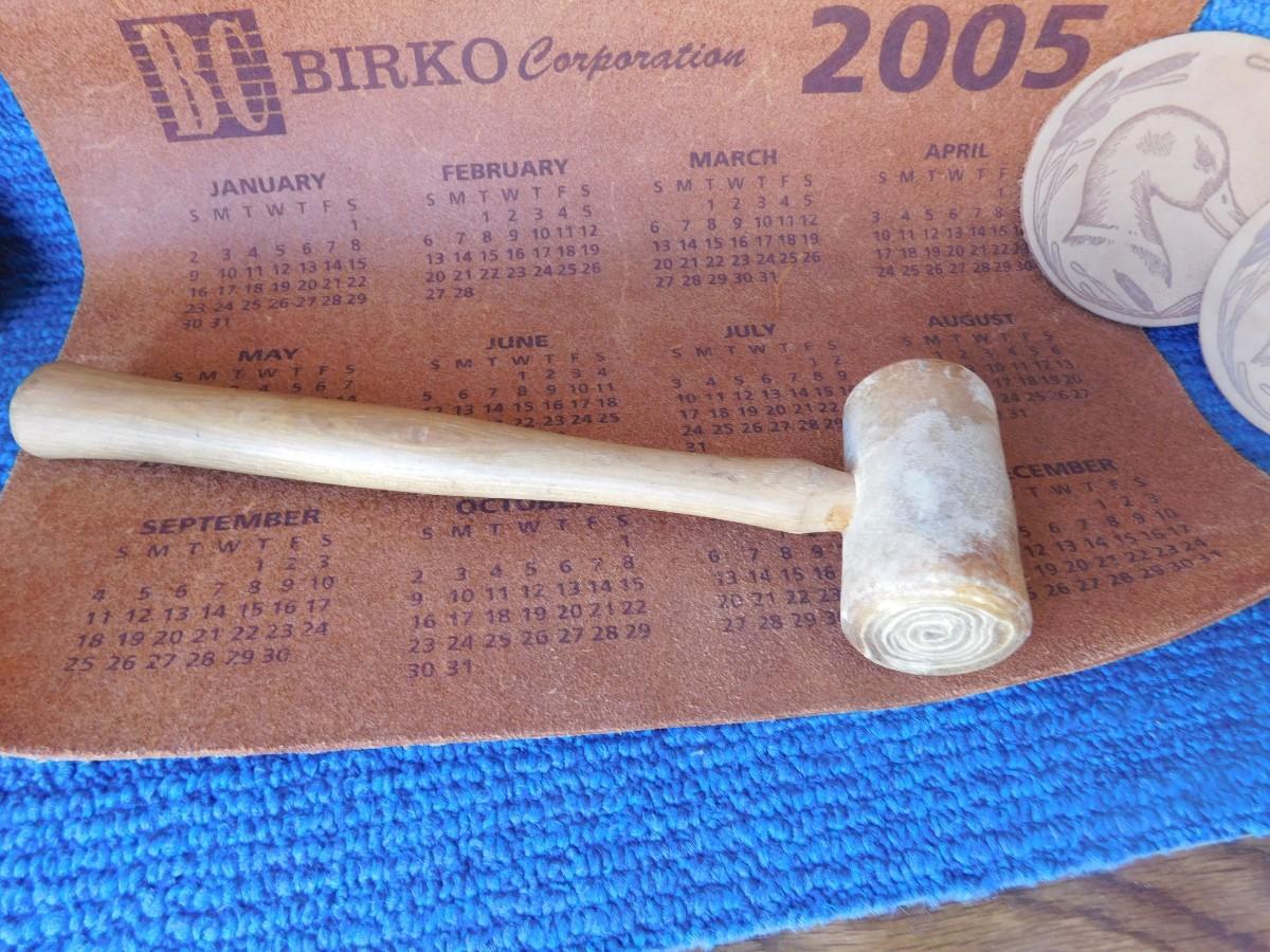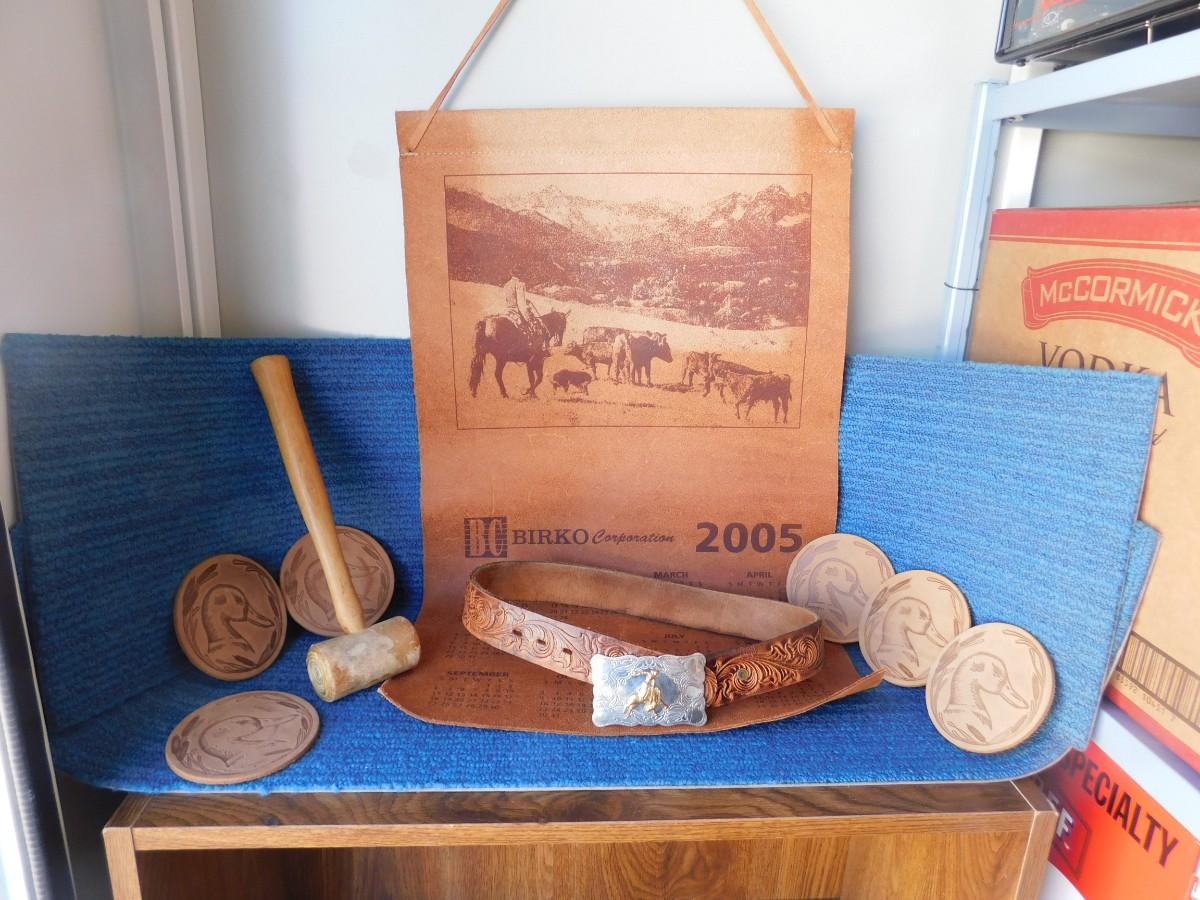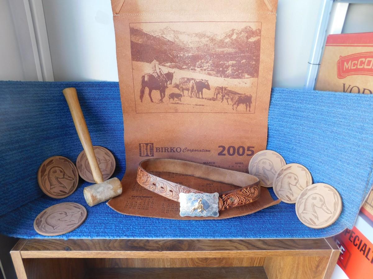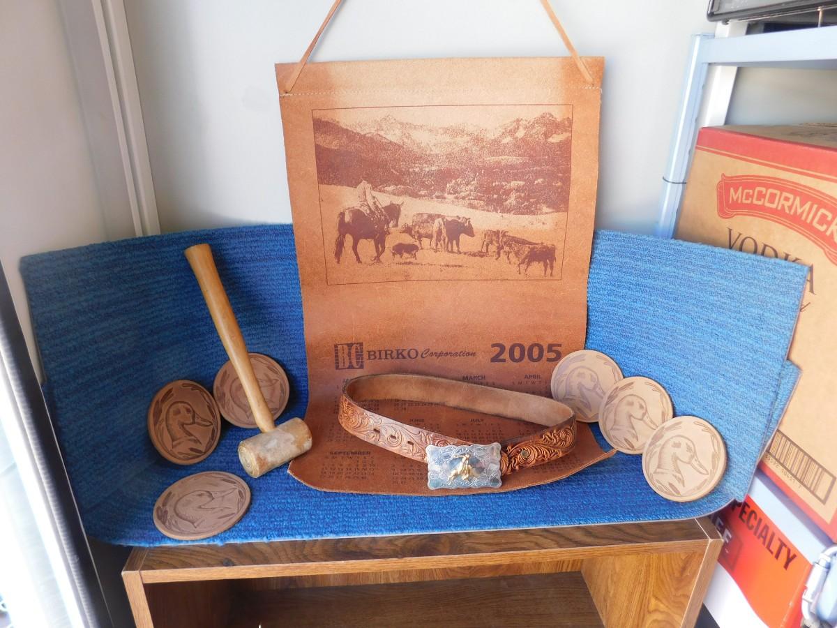 VINTAGE LITTLE BUCKAROO BELT AND BUCKLE, LEATHER HAMMER AND MORE LEATHER ITEMS