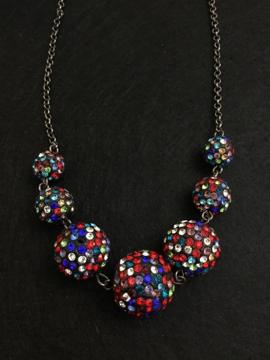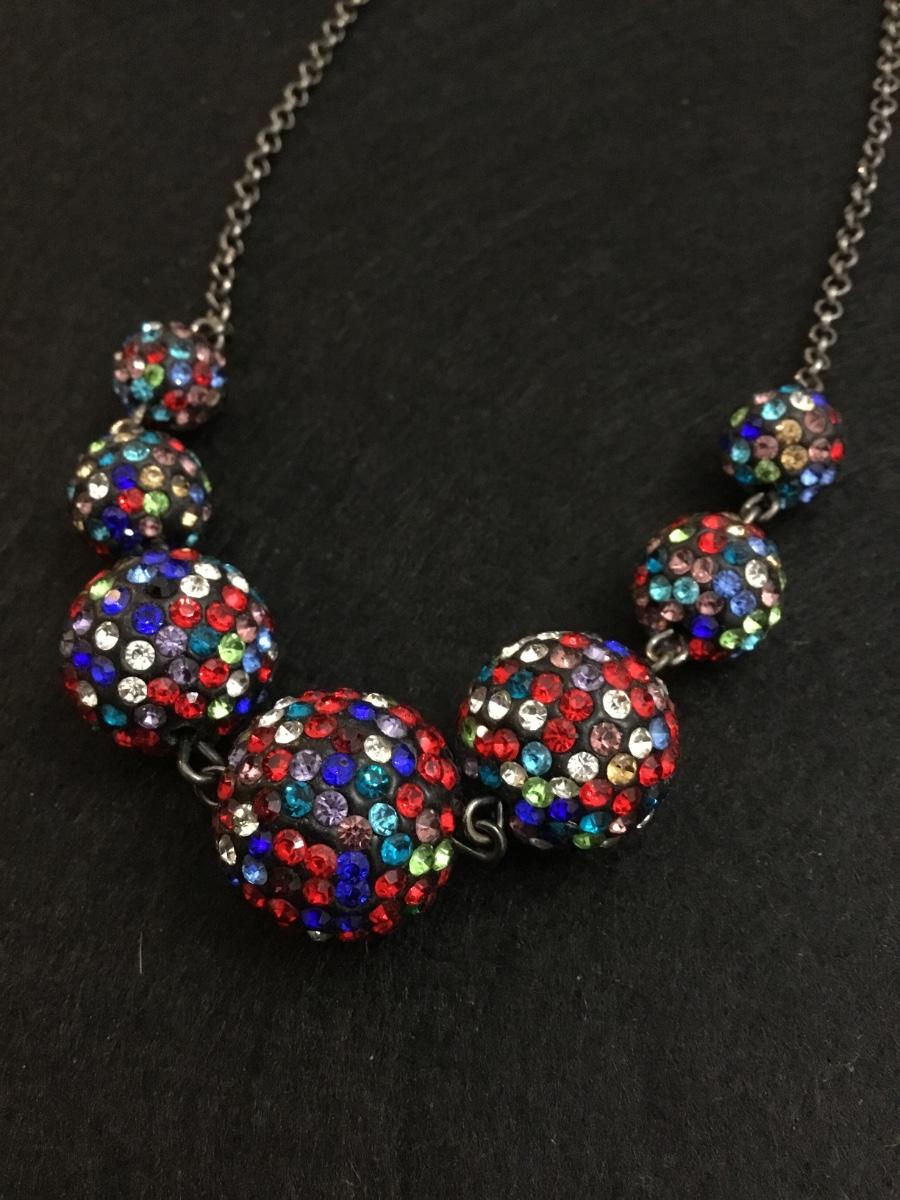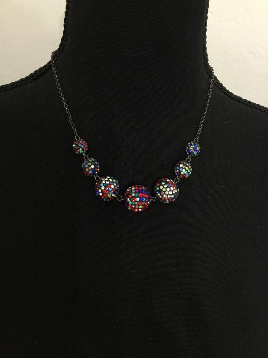 Vintage, Liz, Claiborne, gunmetal, gray toned with multi colored rhinestone balls, statement, necklace