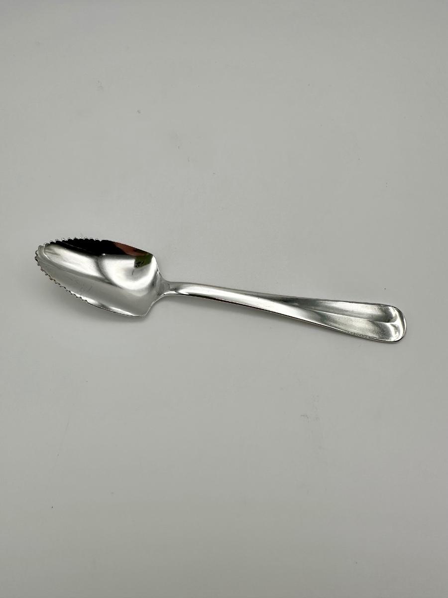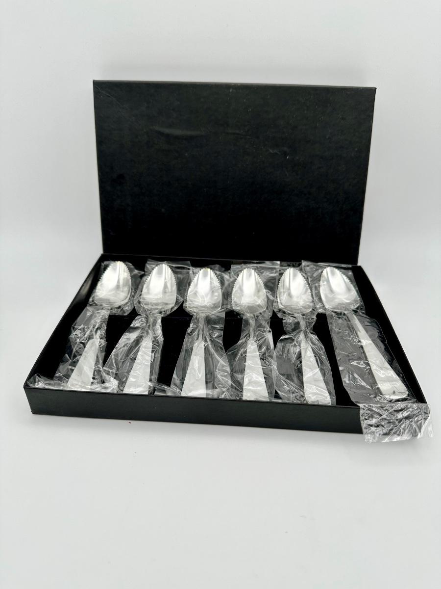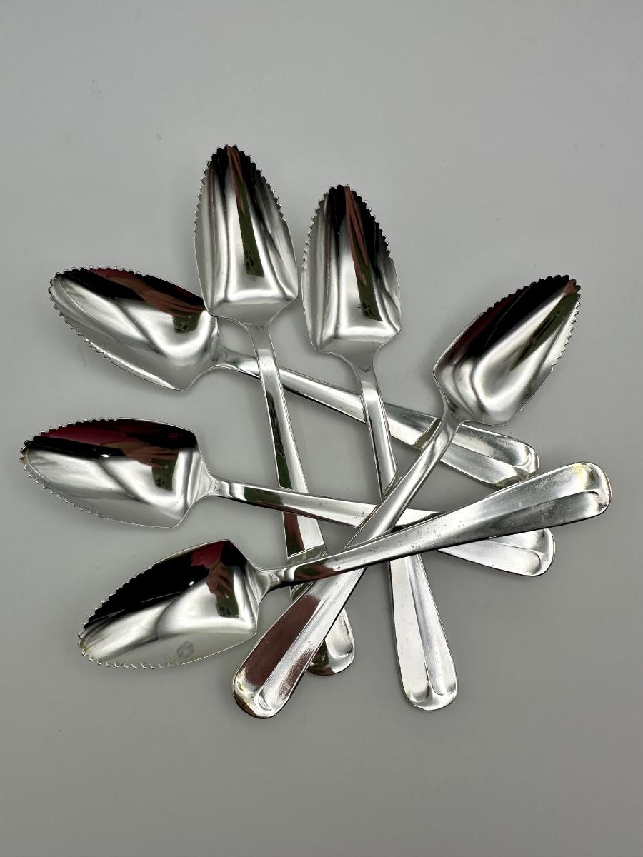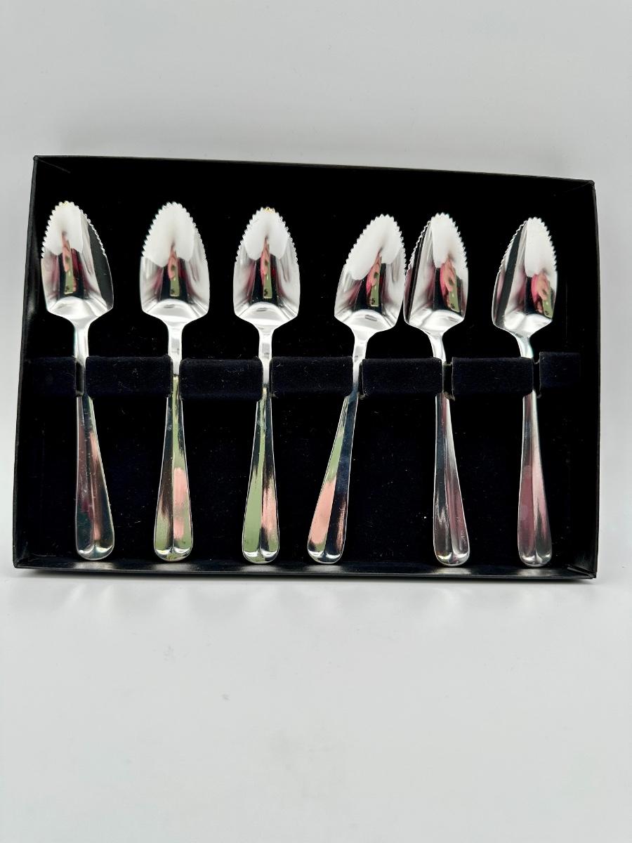 Set of six silver plate grapefruit spoons, Made in Japan. 5 ¾” long. Absolutely pristine.