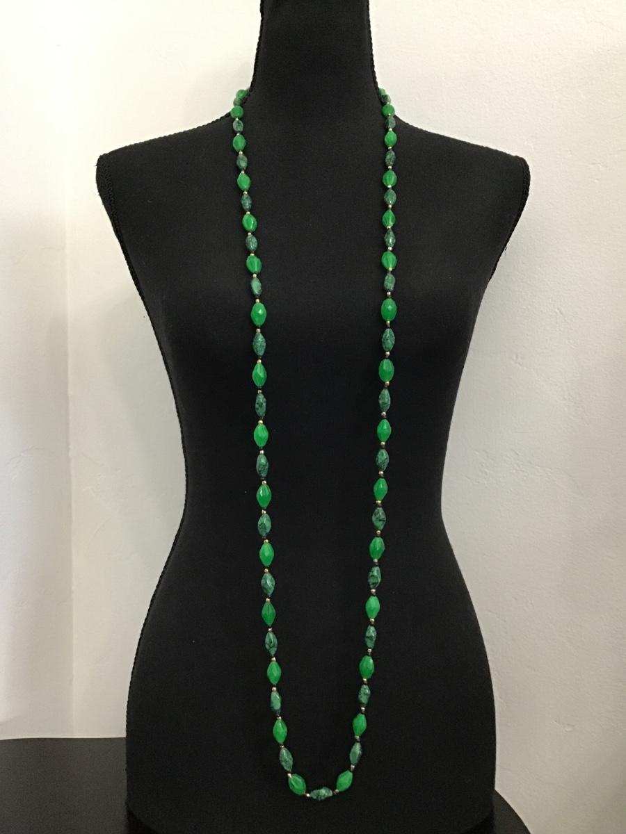 Vintage, long, green and gold, toned bead necklace, Hong Kong