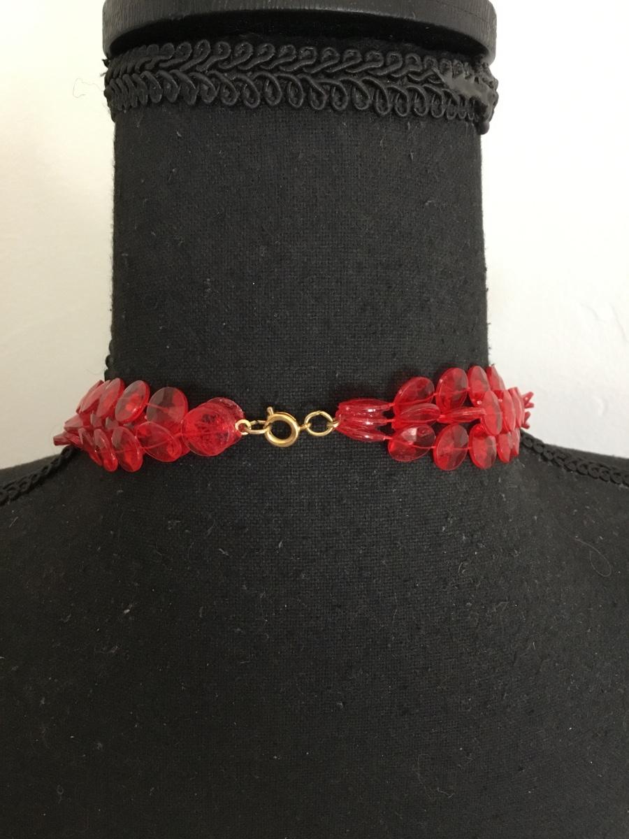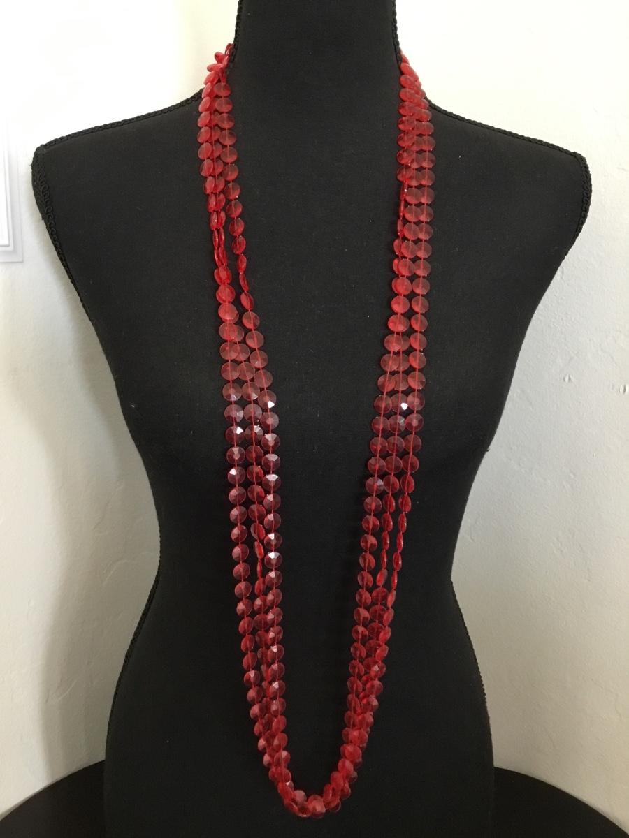 Vintage, long, red plastic Lucite type, circular bead, flapper style necklace