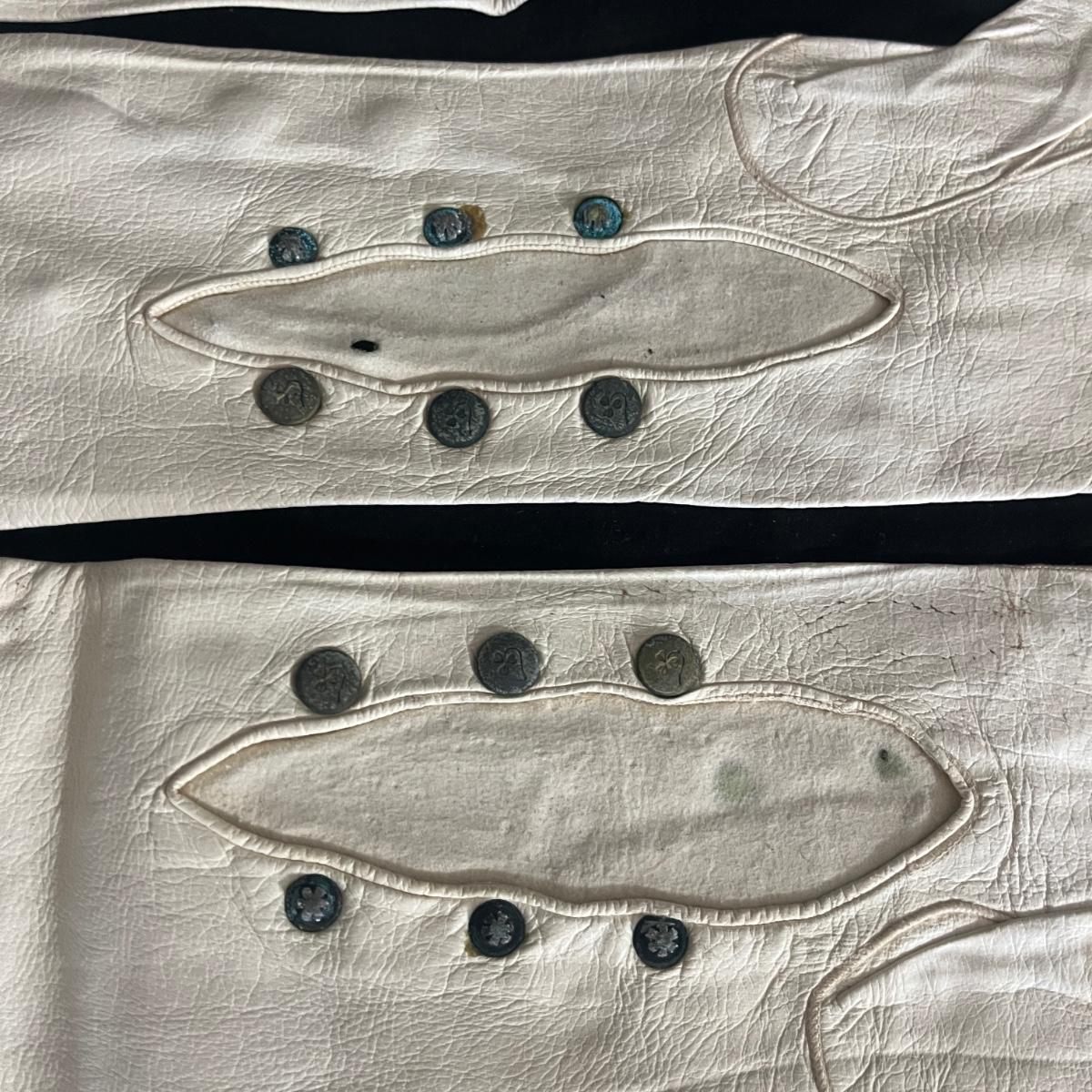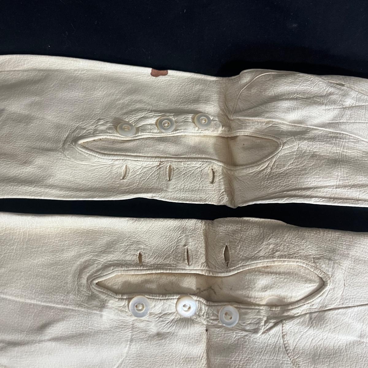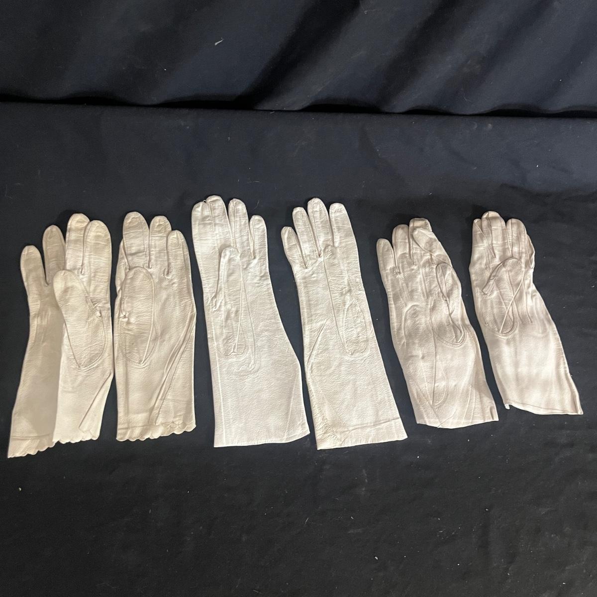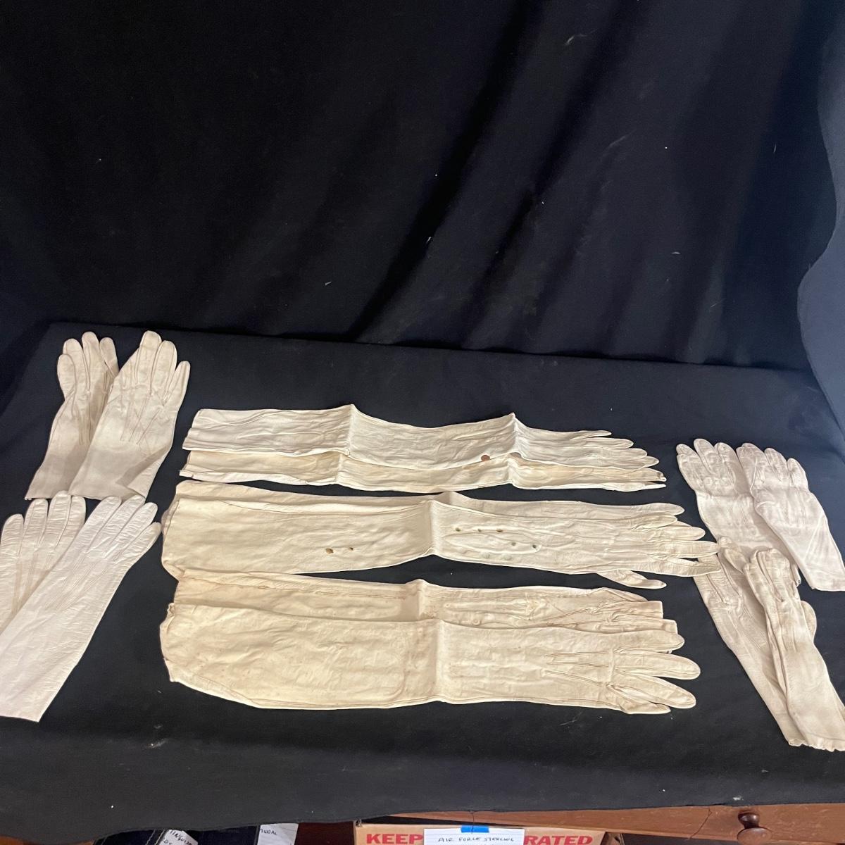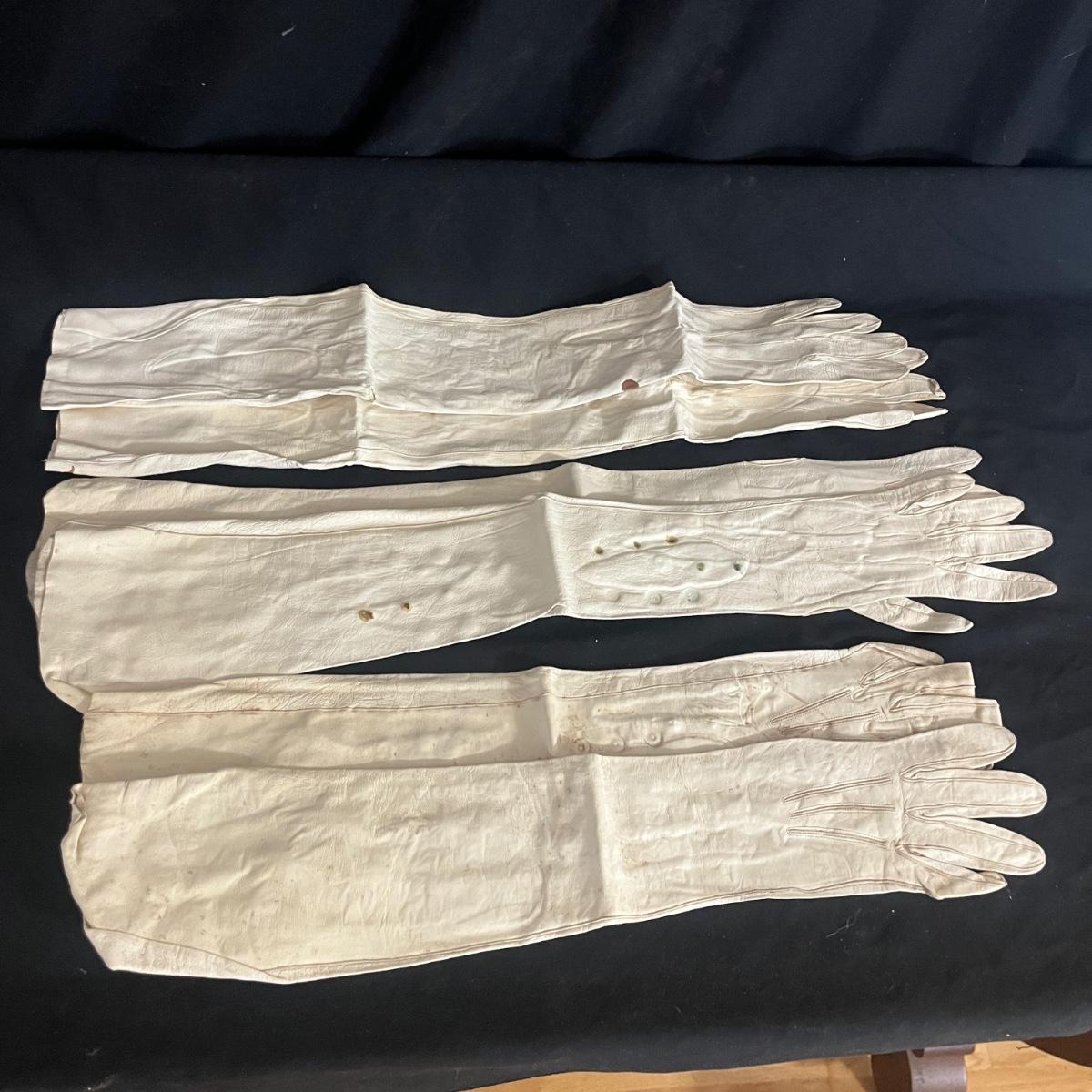 Lot includes three pair of white leather long gloves and four pair of white leather gloves. Long gloves measure 24”long x 5”Wide. Gloves are old and have marks, holes and are stiff. They appear to be a small size.