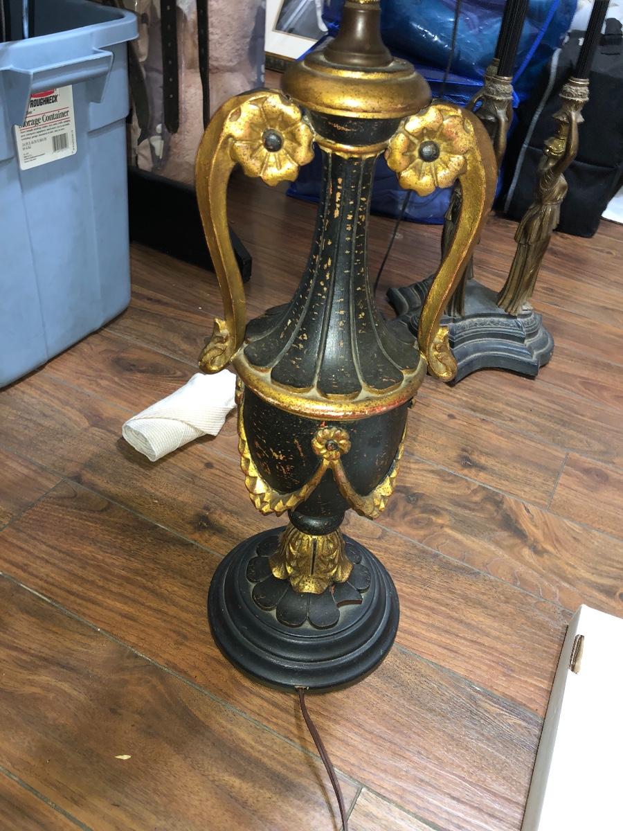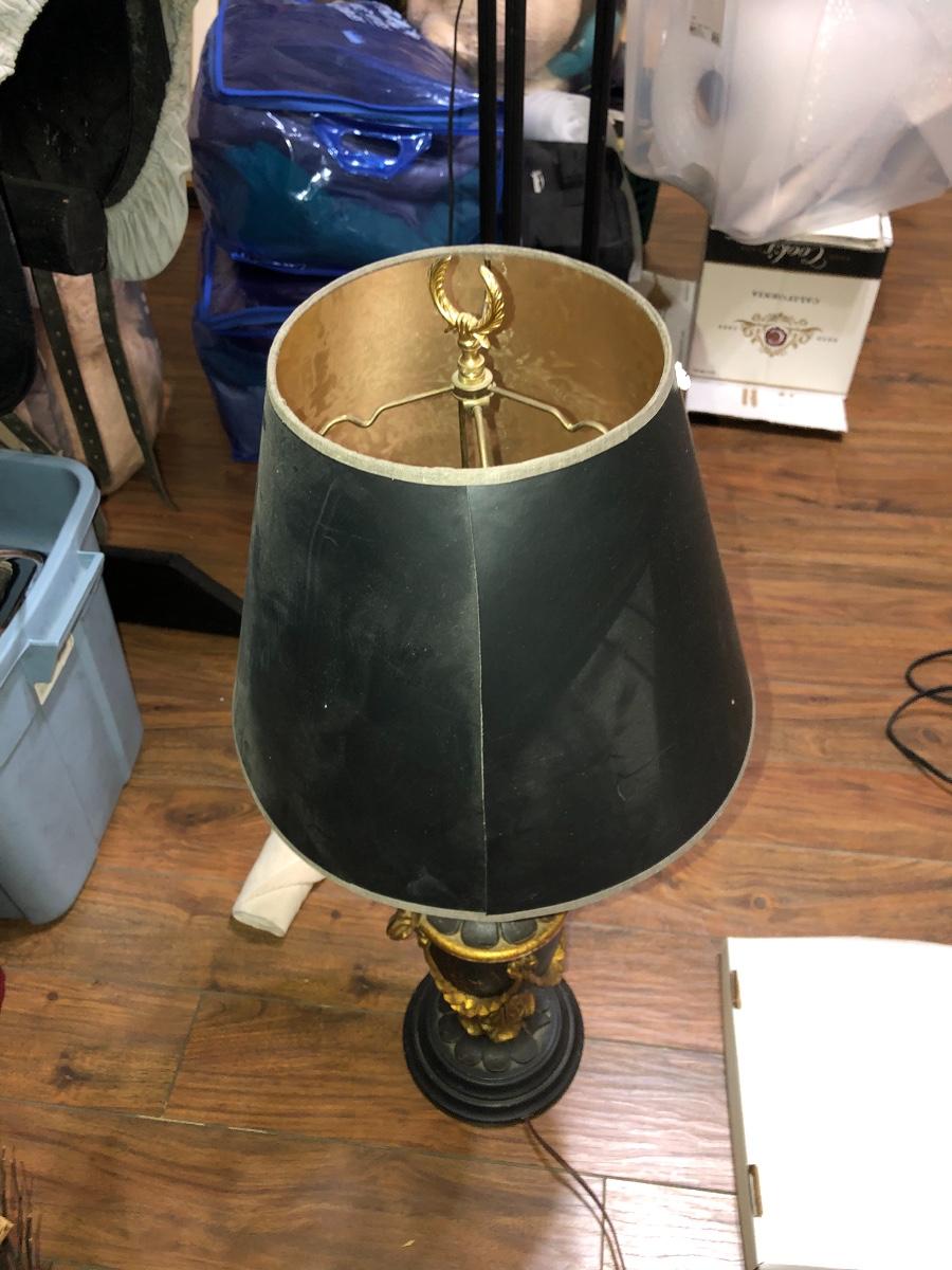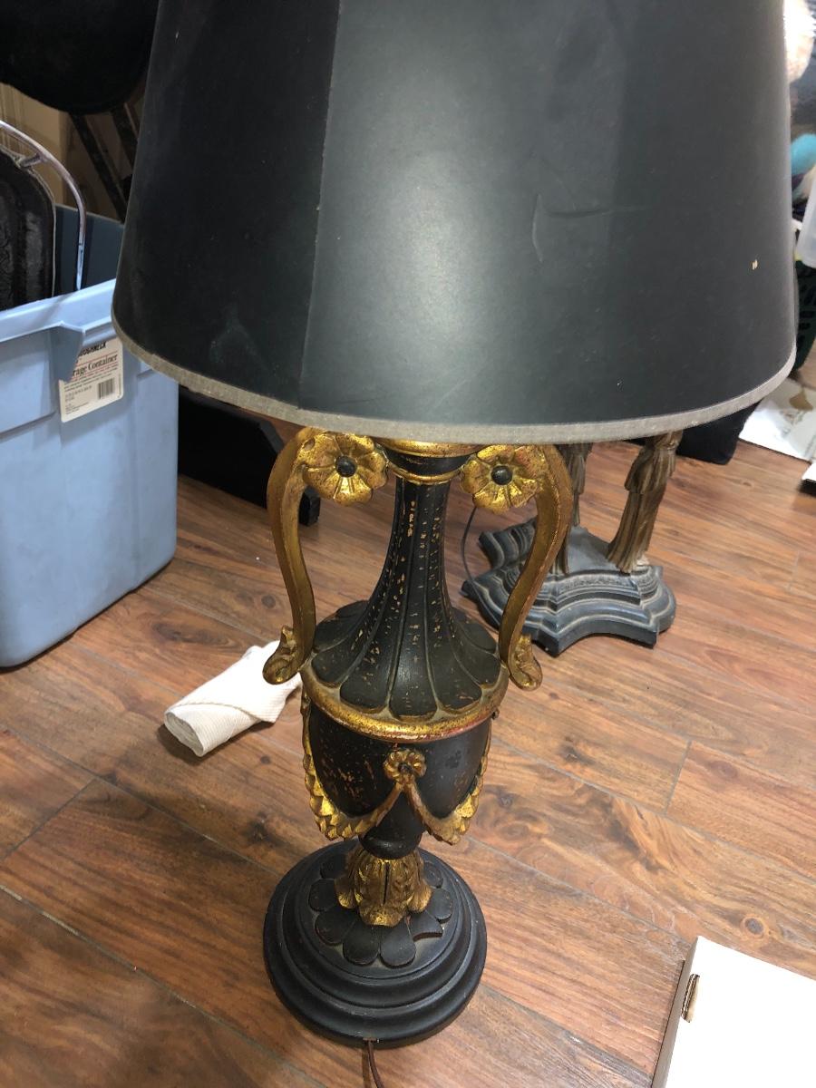 This is a vintage looking black lamp with gold trim. Never used. Measures 34” high
