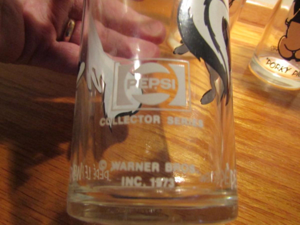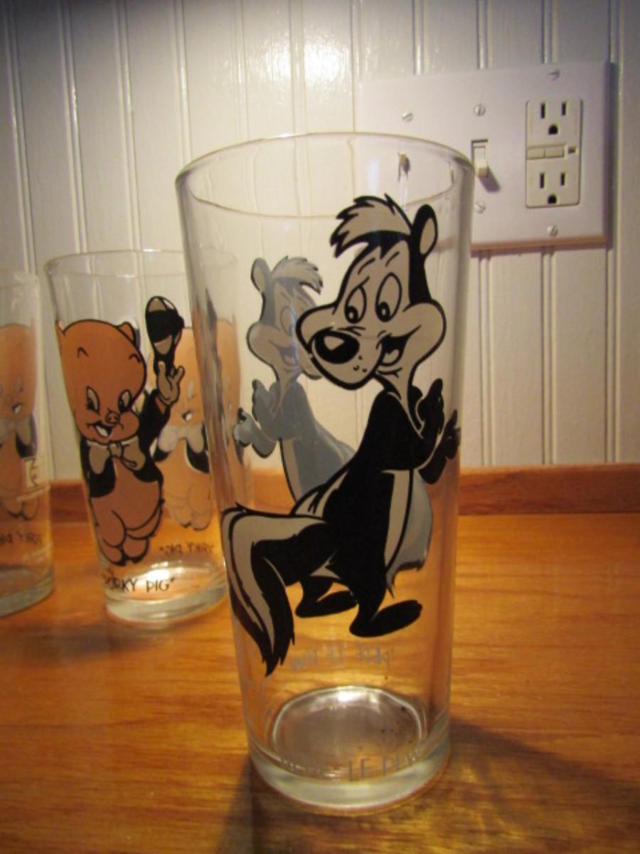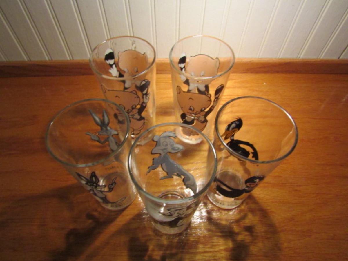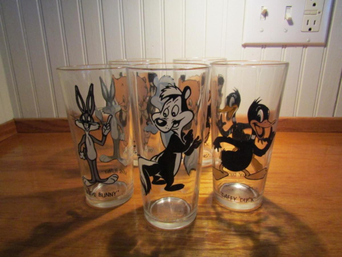 Vintage Looney Tunes Characters Drinking Glasses by Pepsi (1973)- 5 Pieces. Bugs Bunny, Daffy Duck, Pepe Le Pew, and 2 Porky Pig.