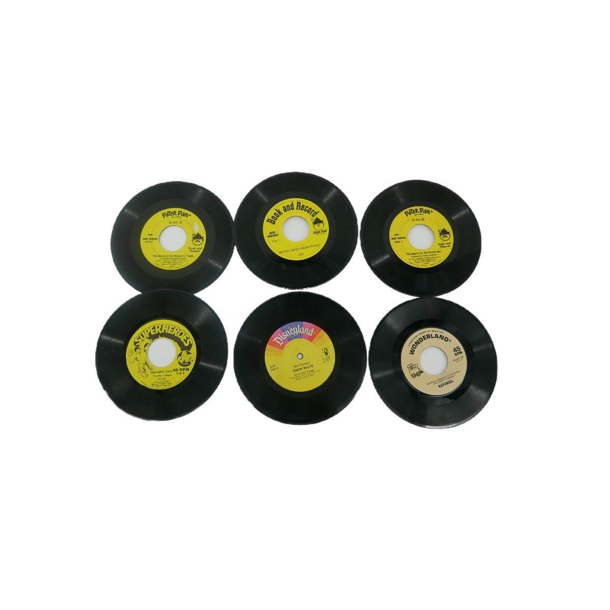 Six vintage records including: Wonderland the Lion and the Mouse, Superheroes Fantastic Four, Mother Goose Nursey Rhymes, The Secret of the Mummy's Tomb, The Secret of the Stolen Idol, and Snow White. All 45 rpms except Snow White which is 33 rpms. All in good condition, some scratches and scuffs are present. Lot weighs 7 oz. (M31)