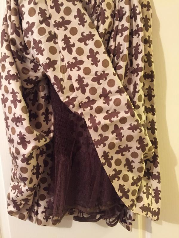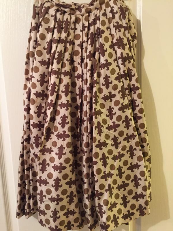 Silk circle skirt in cream with brown dots and fleur de lis pattern. Includes brown mesh crinoline. Labeled Lord & Taylor, Abby Michael Ltd., by Carol Vanderclock. No size