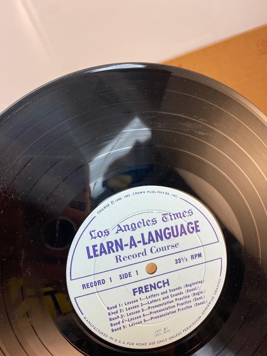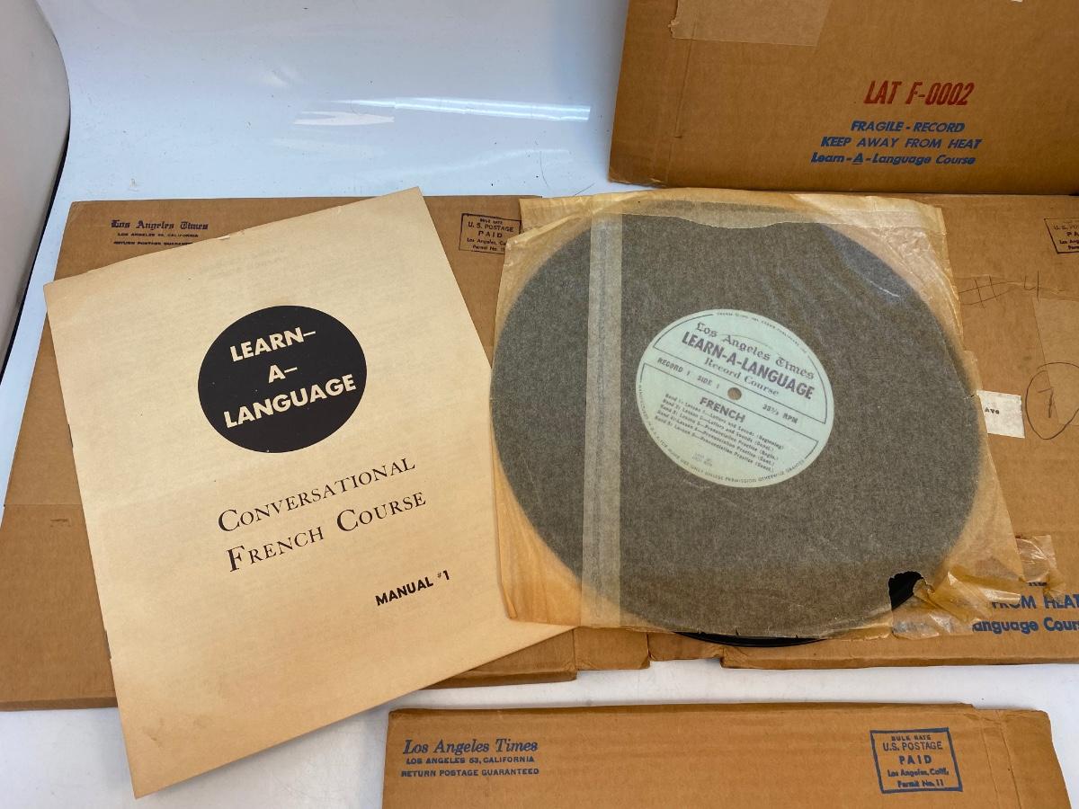 Vintage Los Angeles Times 4 Album Series Learn- a-Language French Record Course. Set of 4 records each with booklet. Good vintage condition. From mid 1950s. Light signs of use.