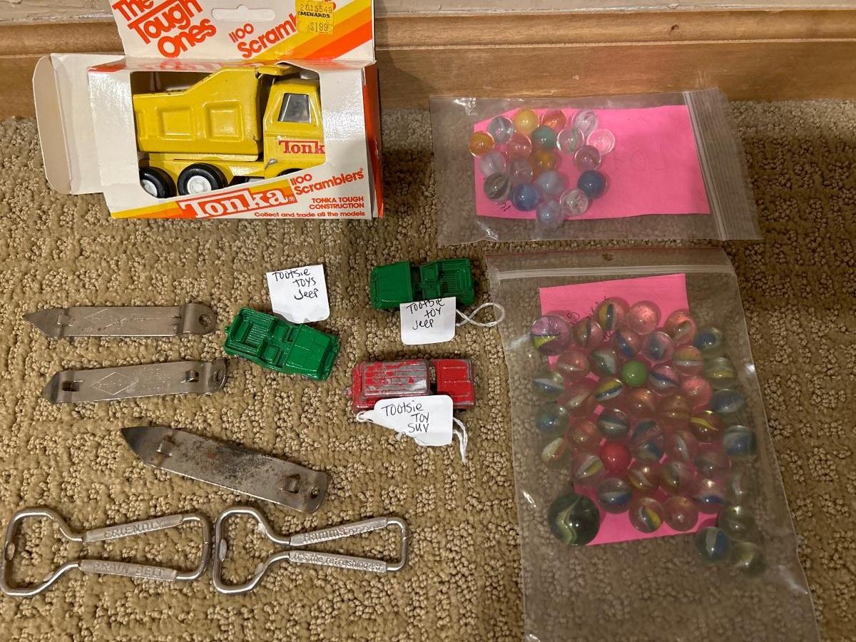 Tonka truck, tootsie toy Jeep’s & SUV, marbles & vintage bottle opener’s by grain belt & 1 Hamm’s