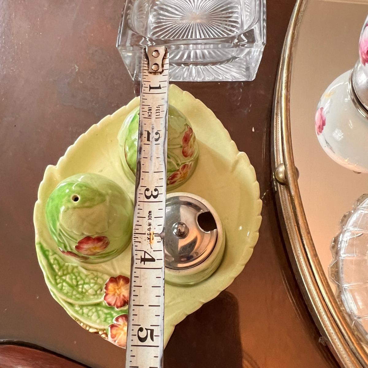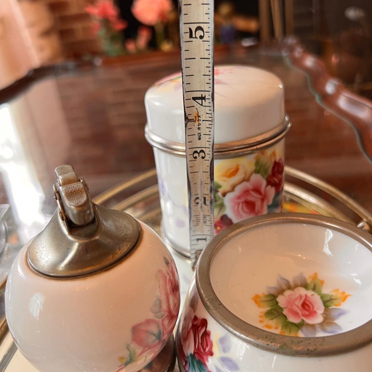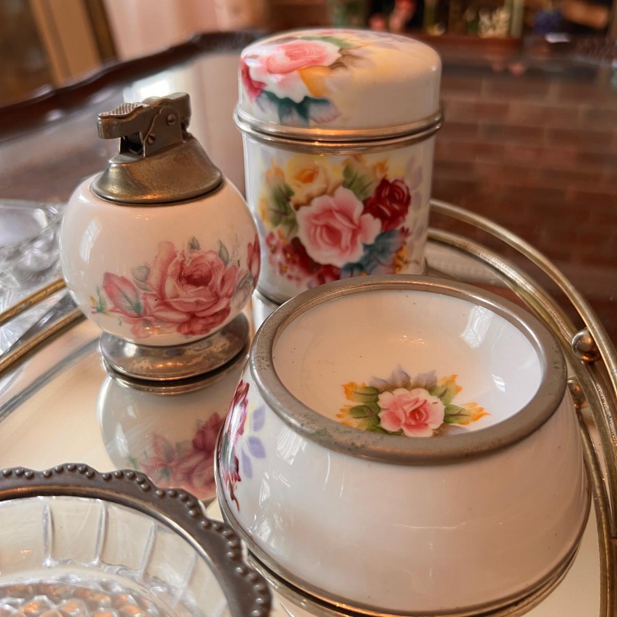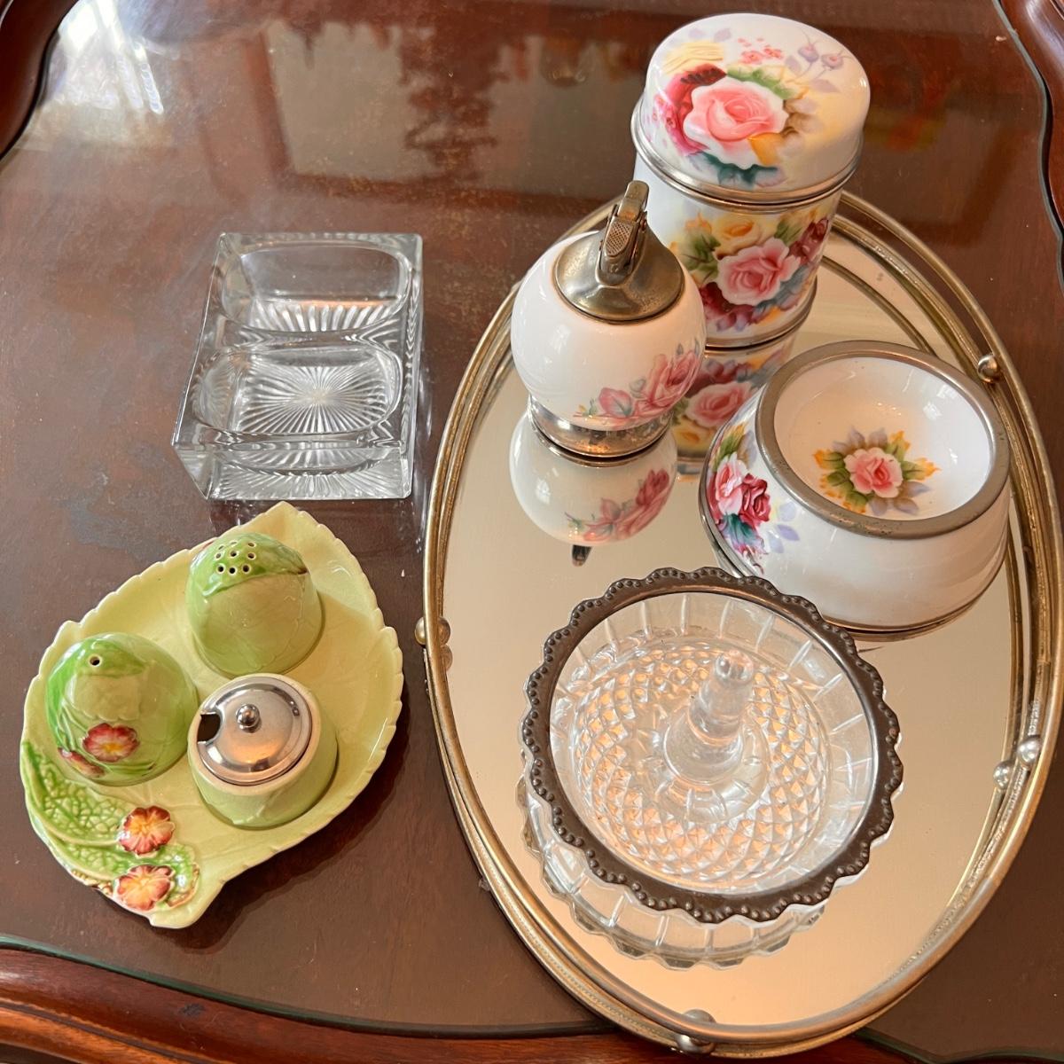 3 piece hand painted china stamped with the royal crown. Floral pattern 1 lighter, 1 cigarette holder, 1 ashtray bowl.4 piece porcelain Carlton Ware cruet set including salt, pepper, salt holders on matching floral dish. Plus cut glass ring holder dish, sunburst cut glass 2 compartment jewelry holder, glass and metal dresser mirror tray..