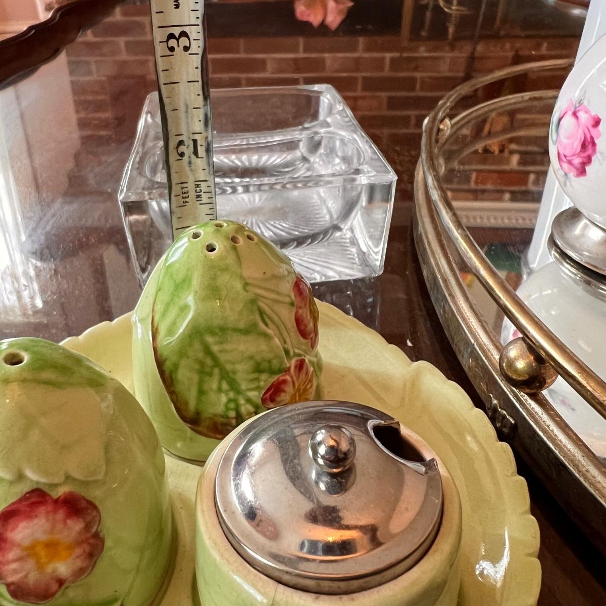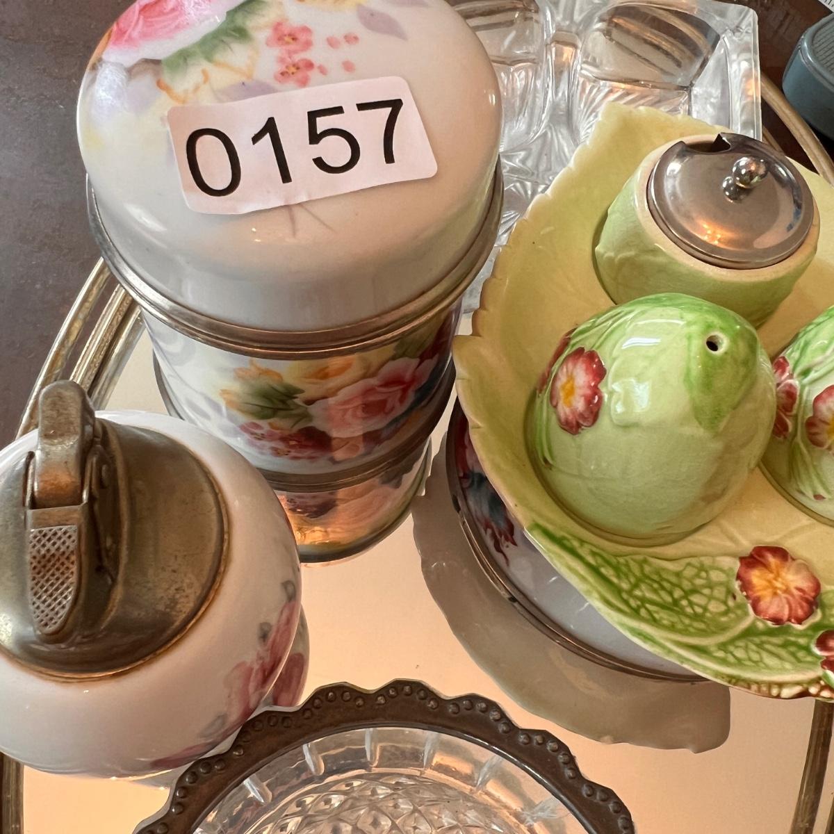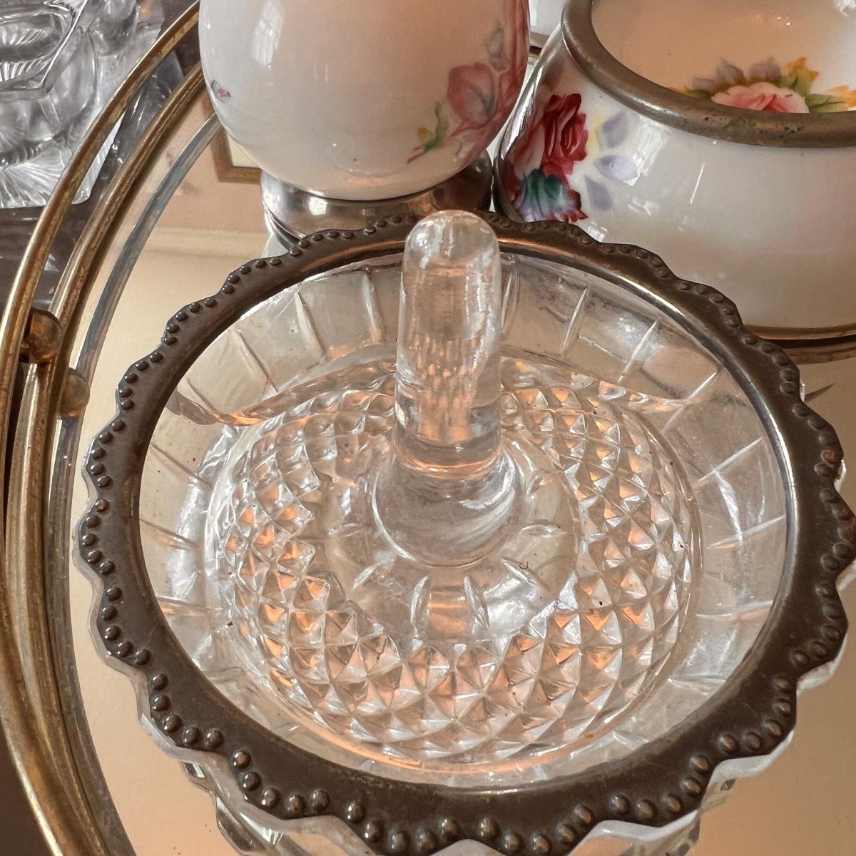 3 piece hand painted china stamped with the royal crown. Floral pattern 1 lighter, 1 cigarette holder, 1 ashtray bowl.4 piece porcelain Carlton Ware cruet set including salt, pepper, salt holders on matching floral dish. Plus cut glass ring holder dish, sunburst cut glass 2 compartment jewelry holder, glass and metal dresser mirror tray..