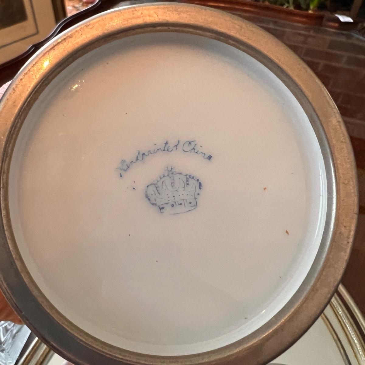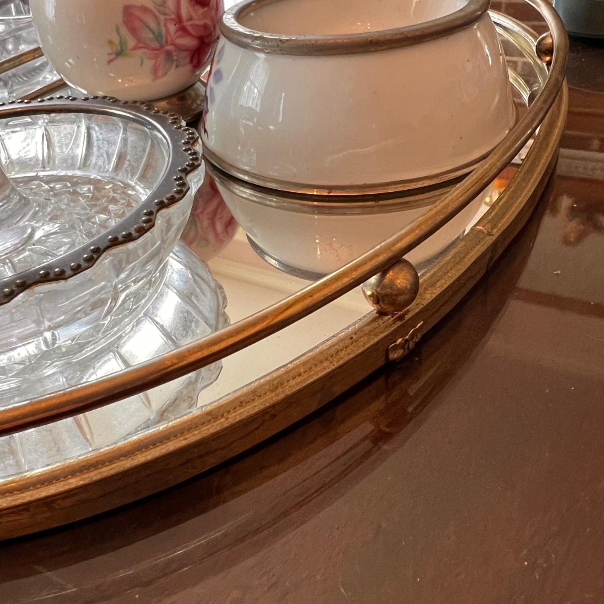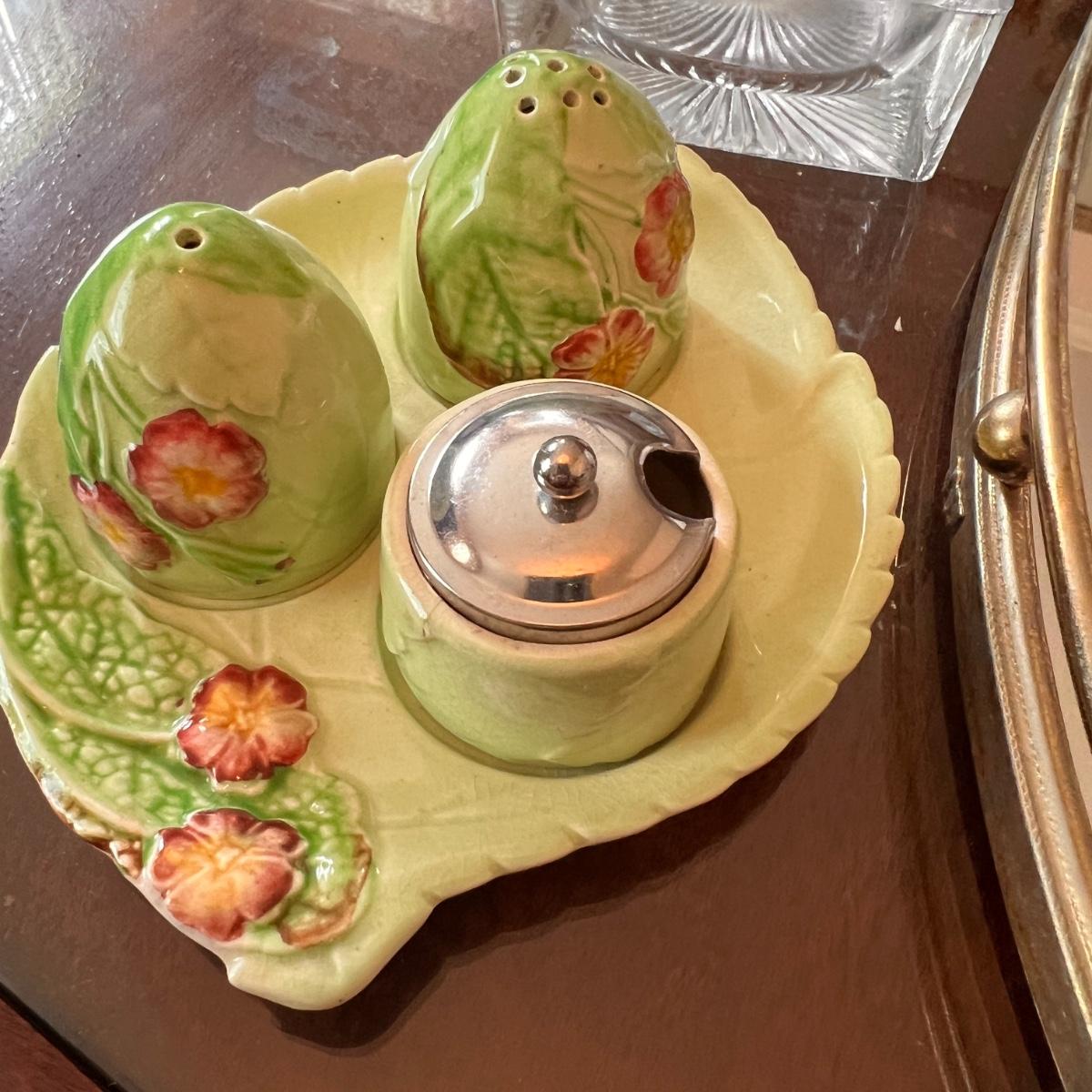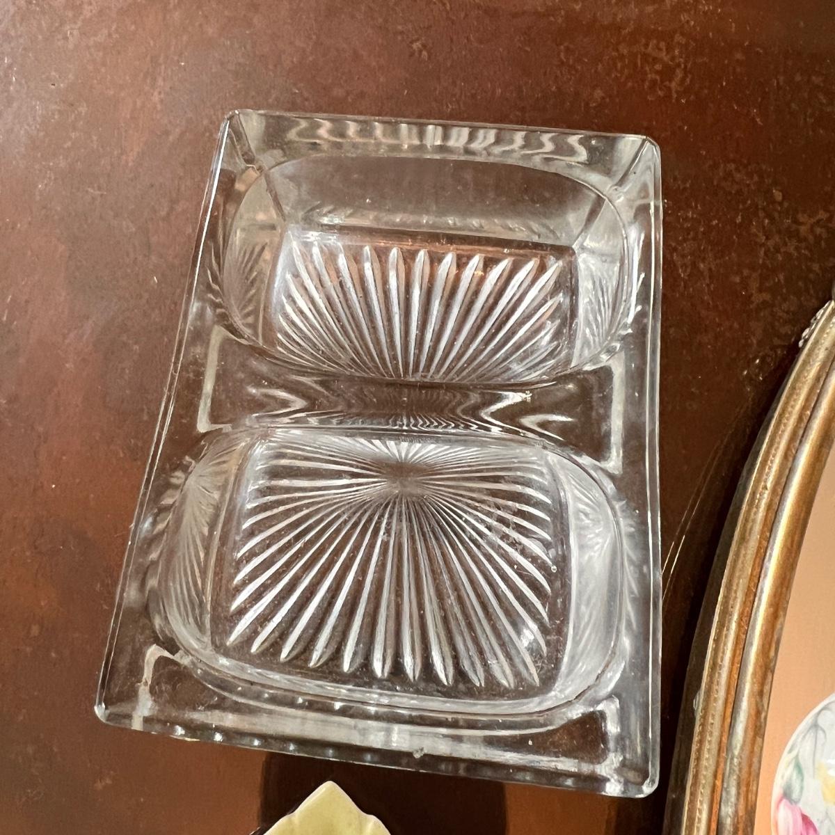 3 piece hand painted china stamped with the royal crown. Floral pattern 1 lighter, 1 cigarette holder, 1 ashtray bowl.4 piece porcelain Carlton Ware cruet set including salt, pepper, salt holders on matching floral dish. Plus cut glass ring holder dish, sunburst cut glass 2 compartment jewelry holder, glass and metal dresser mirror tray..