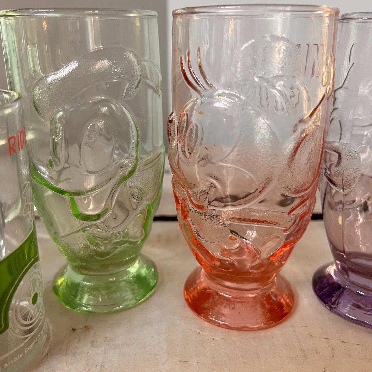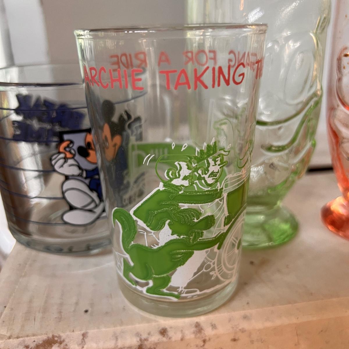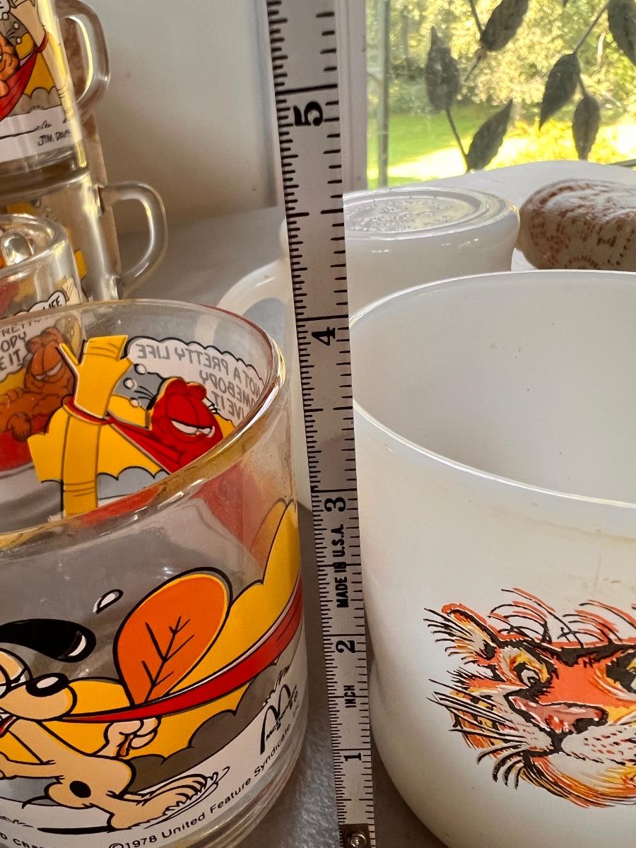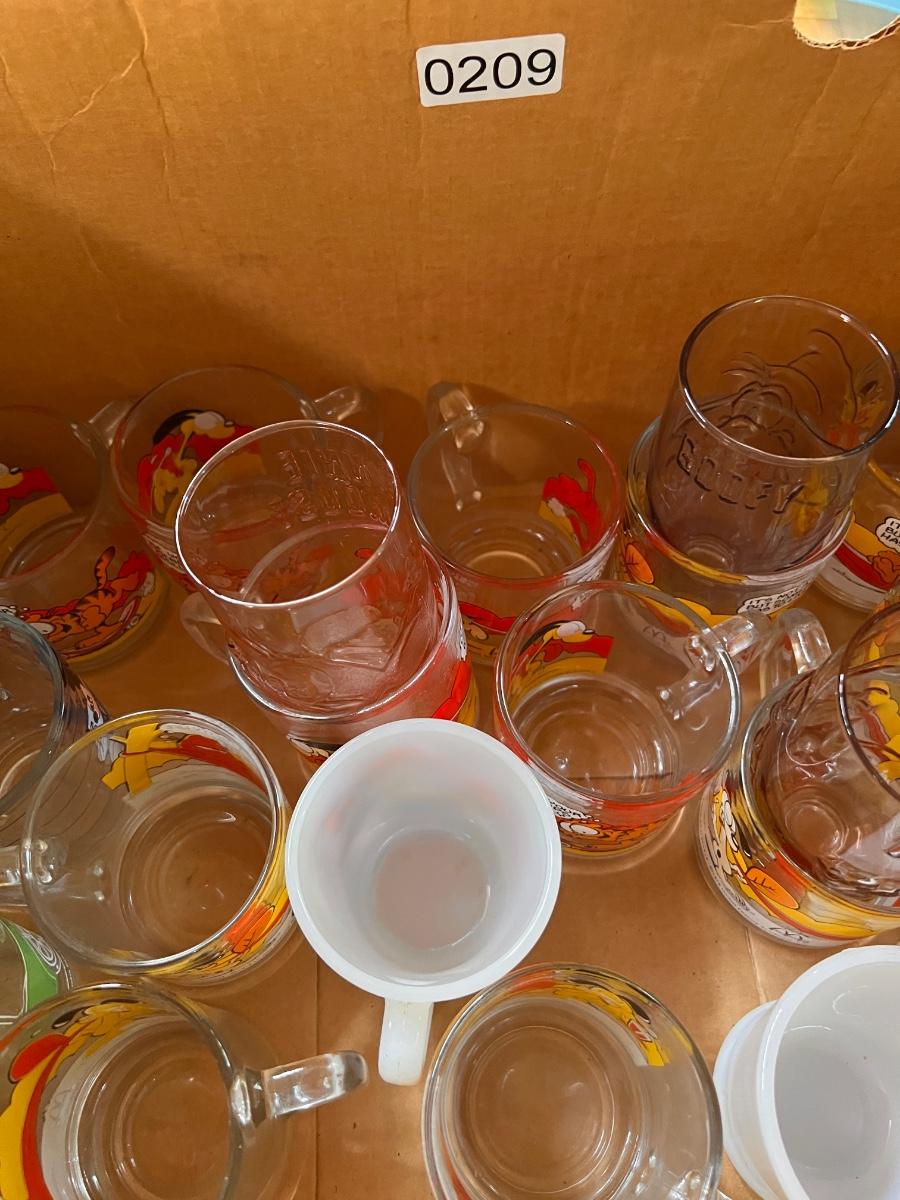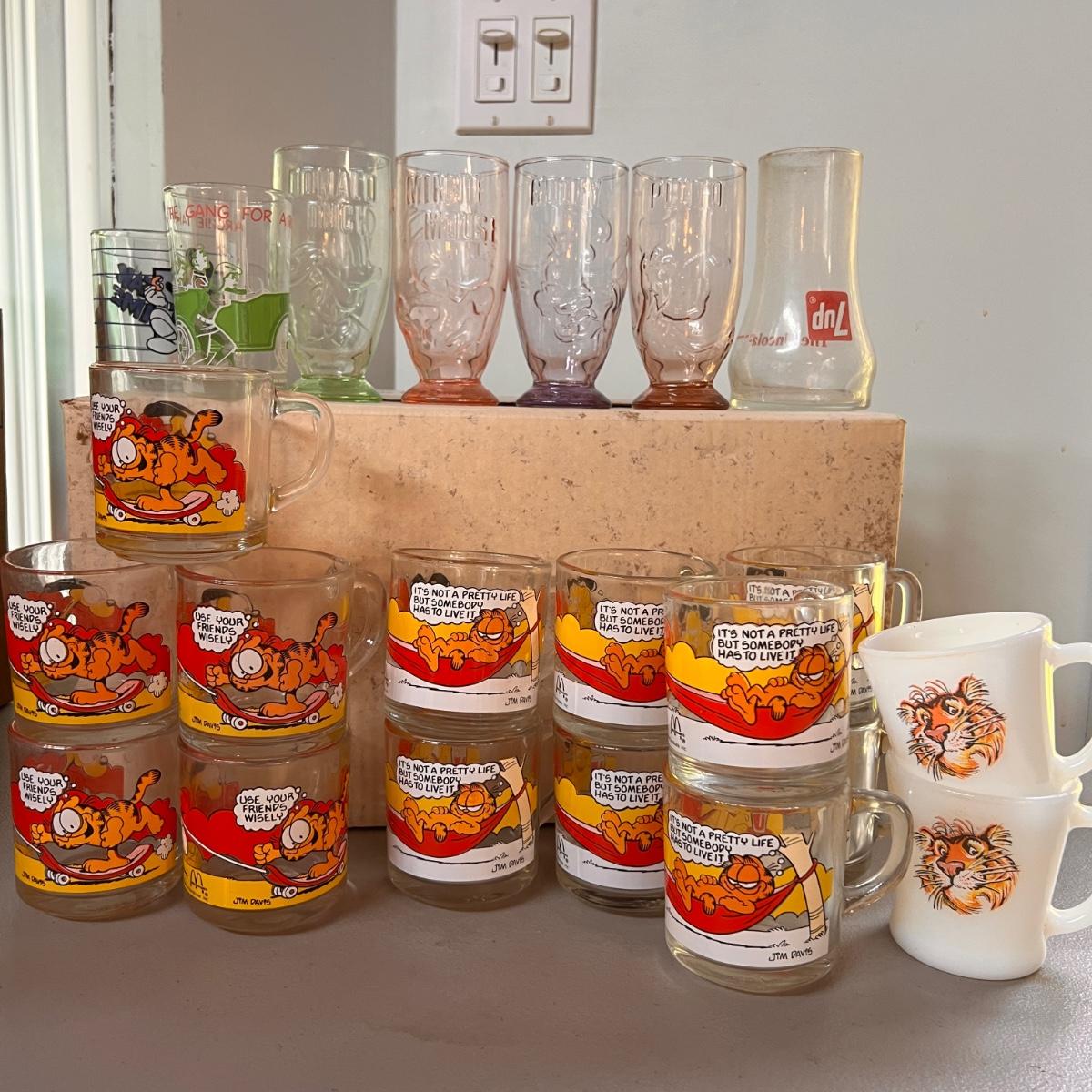 1970's garfield mugs from McDonalds. Tony the Tiger milk glass mugs. 7UP upside down glass, set of 4 Walt Disney embossed glasses, Mickey Mouse mug and Archie and the Gang glass.
