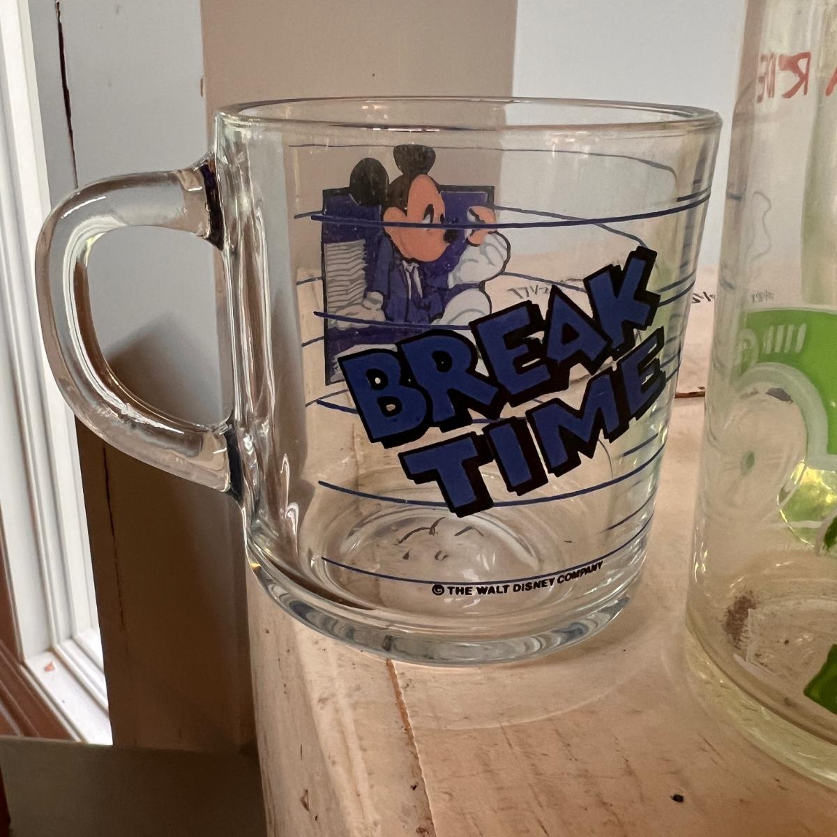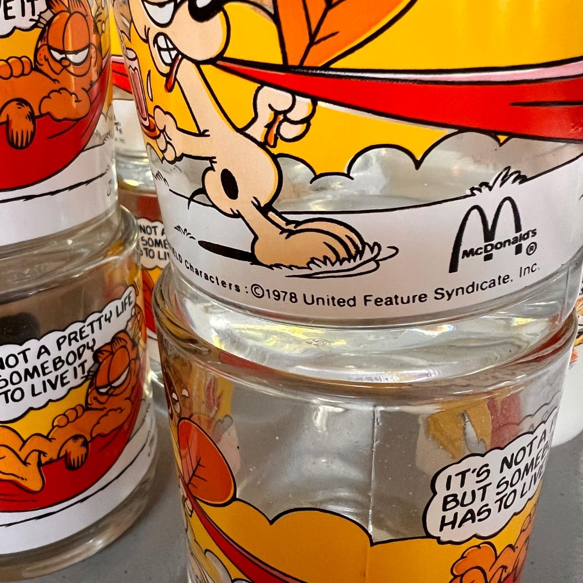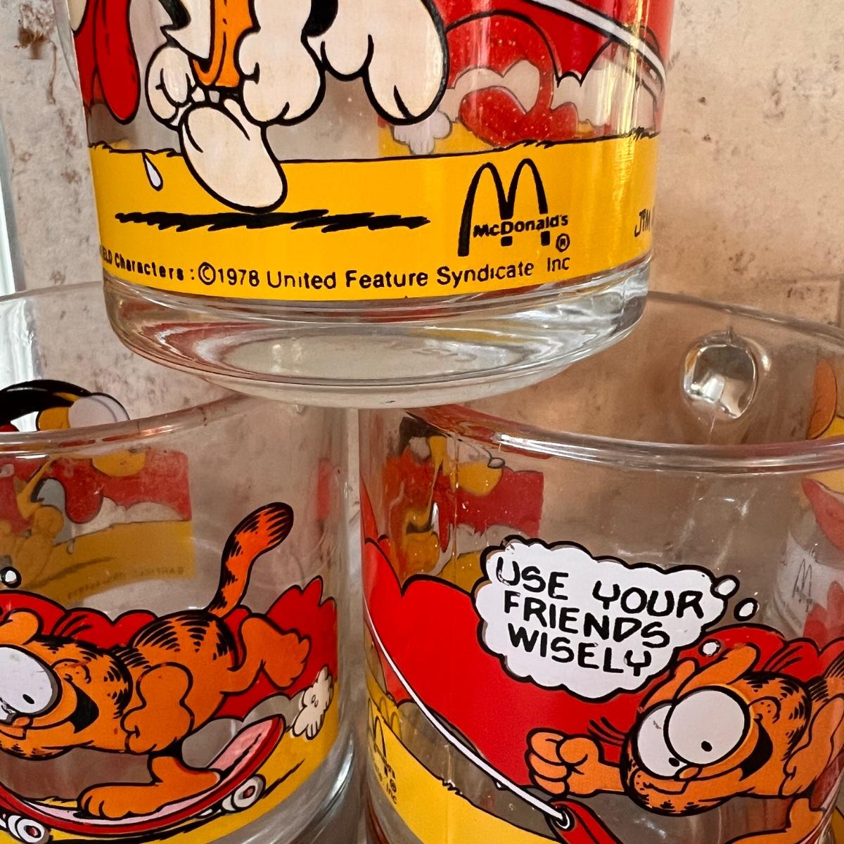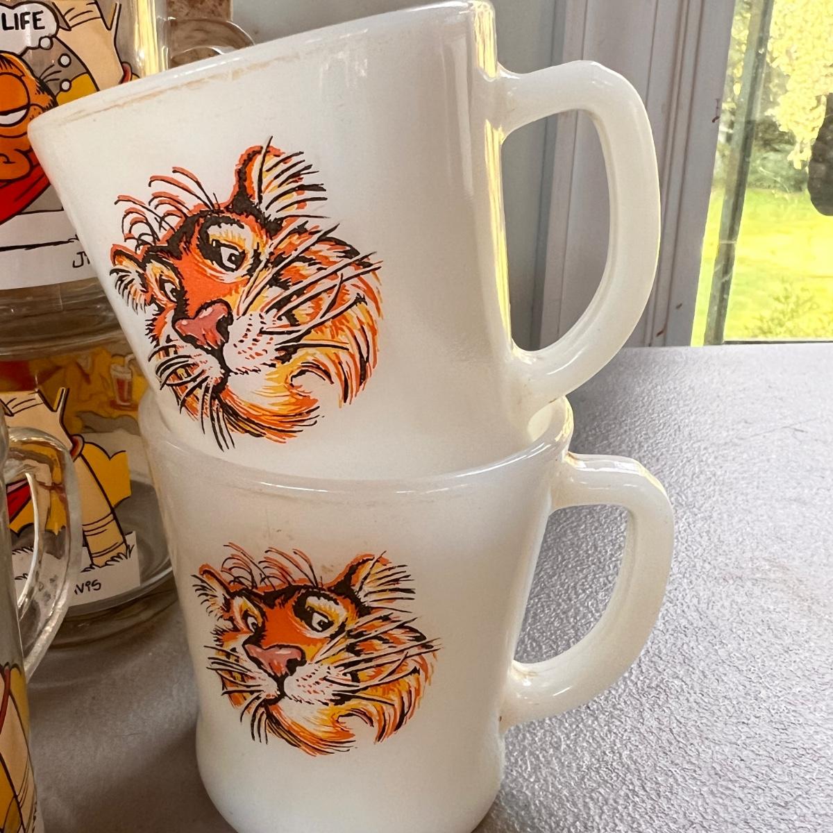 1970's garfield mugs from McDonalds. Tony the Tiger milk glass mugs. 7UP upside down glass, set of 4 Walt Disney embossed glasses, Mickey Mouse mug and Archie and the Gang glass.