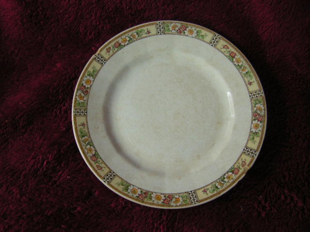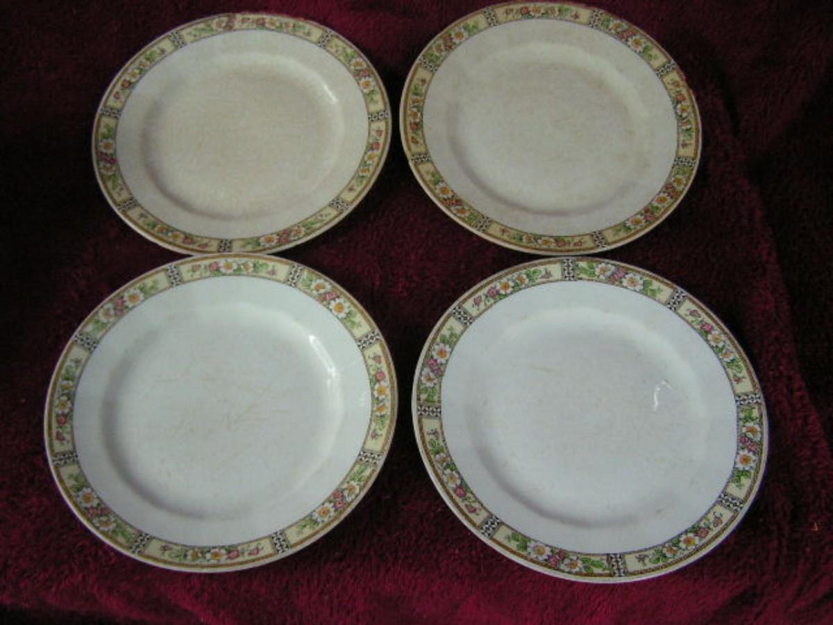 Vintage lot of 4 Edwin M Knowles China Co., salad plates?? 8" dia. Fair condition. Various manufacture dates.