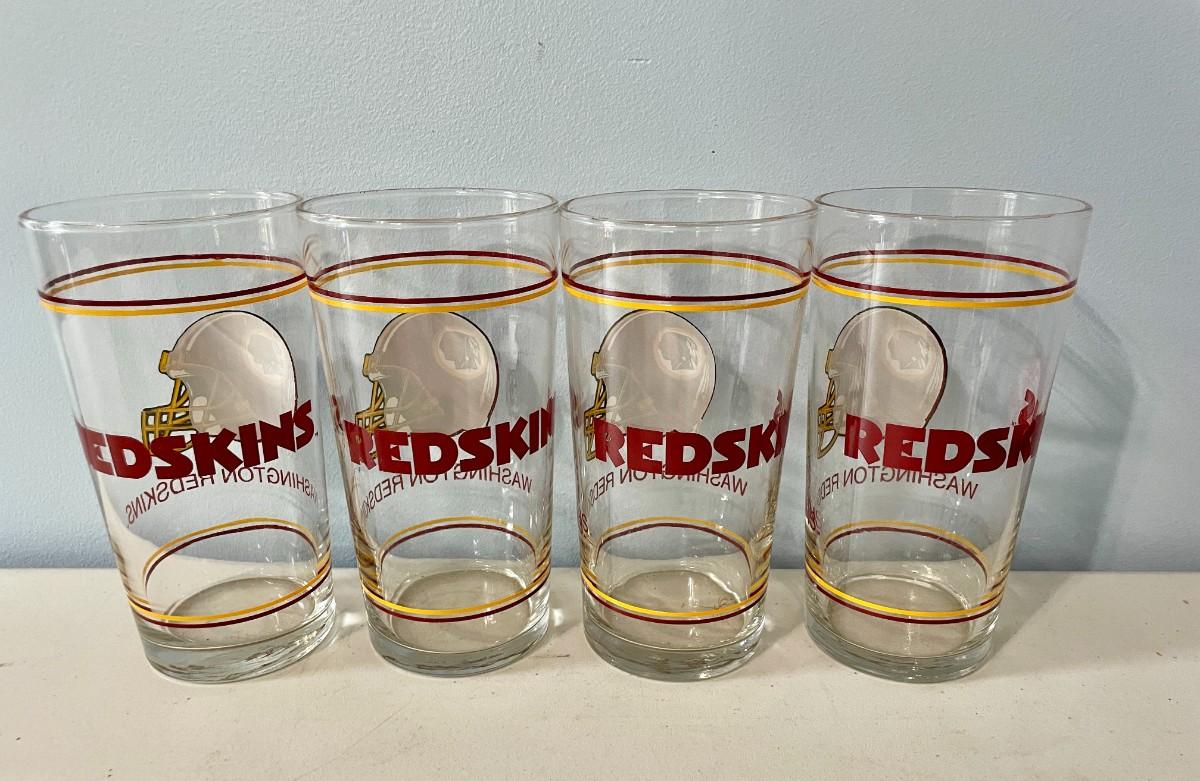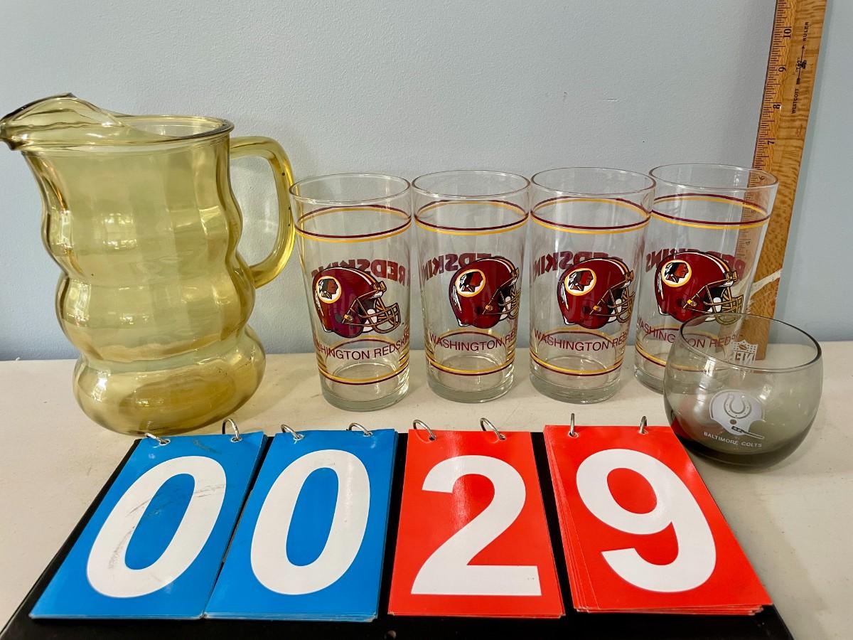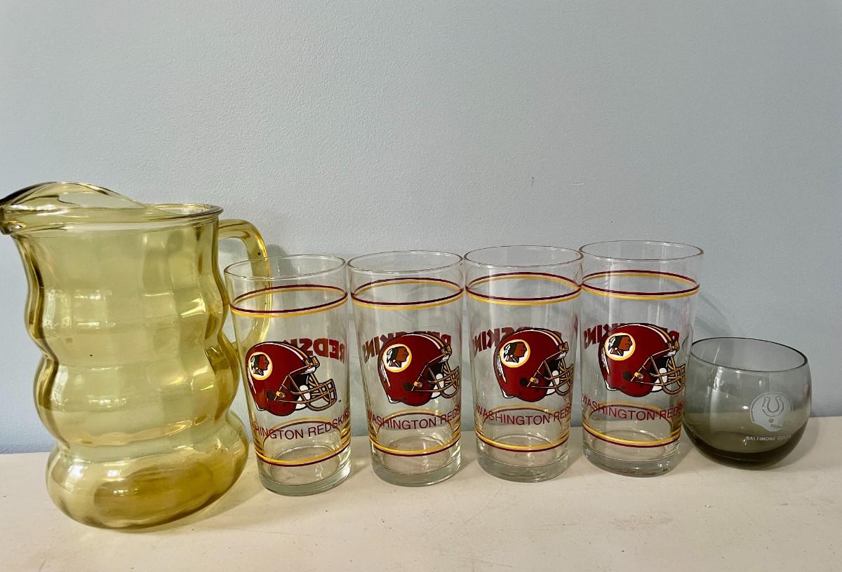 Vintage lot of 4 Washington Redskins tumblers, Baltimore Colt cocktail and amber pitcher