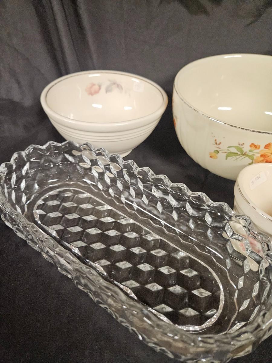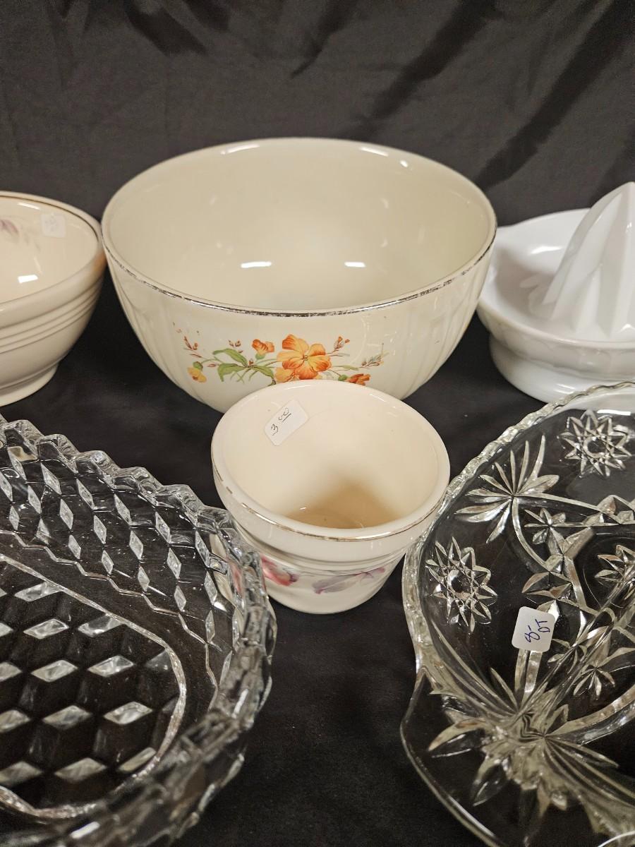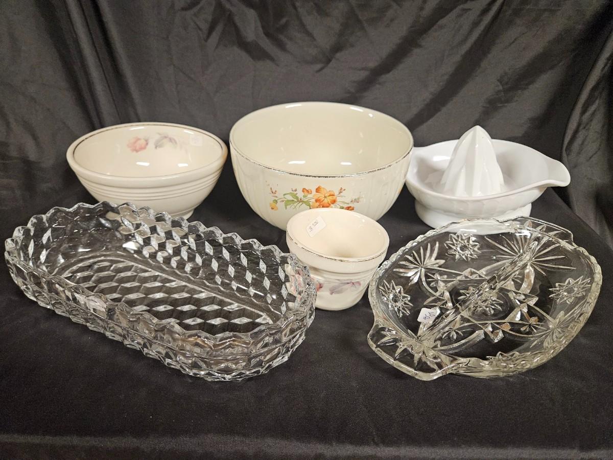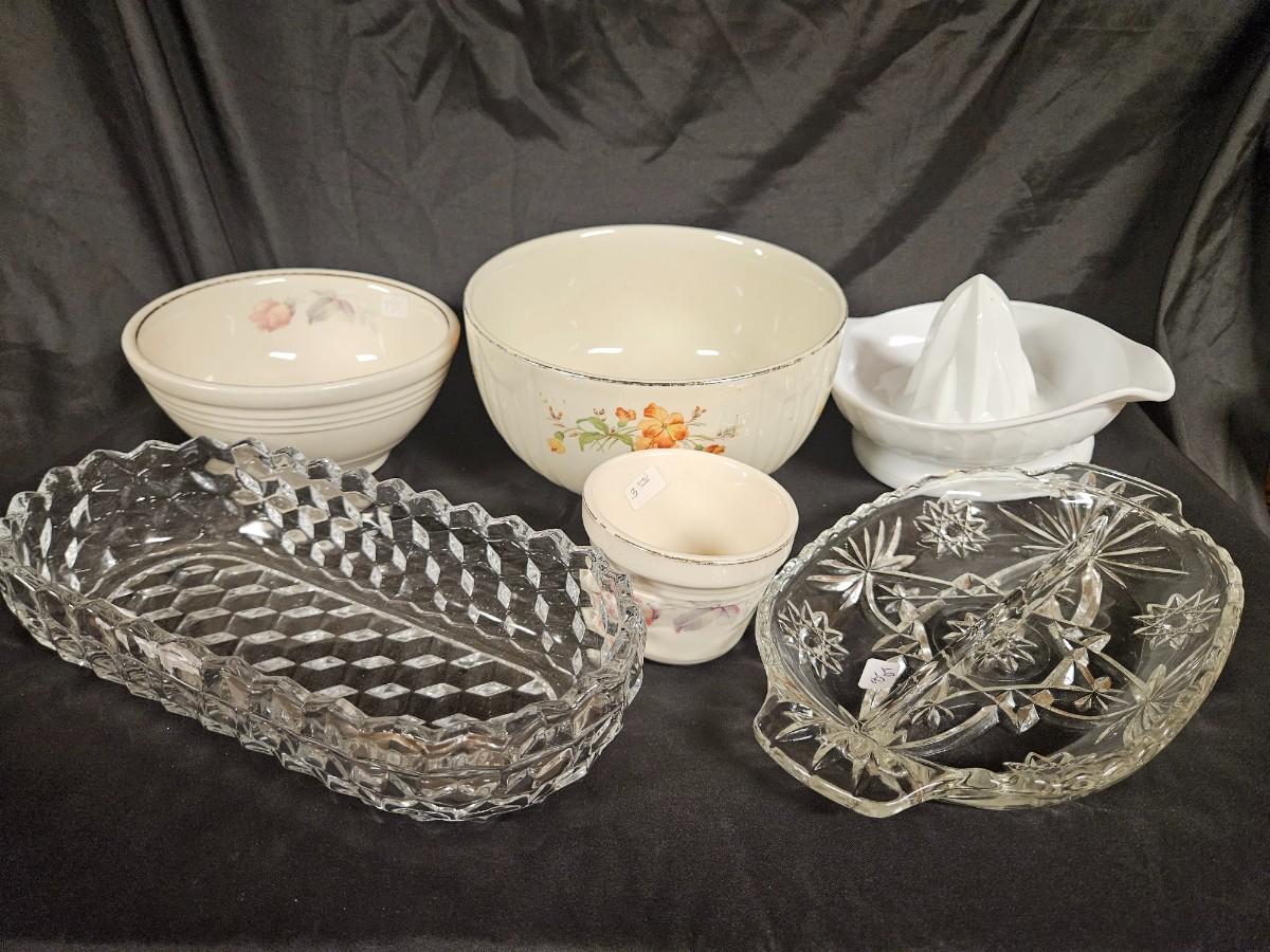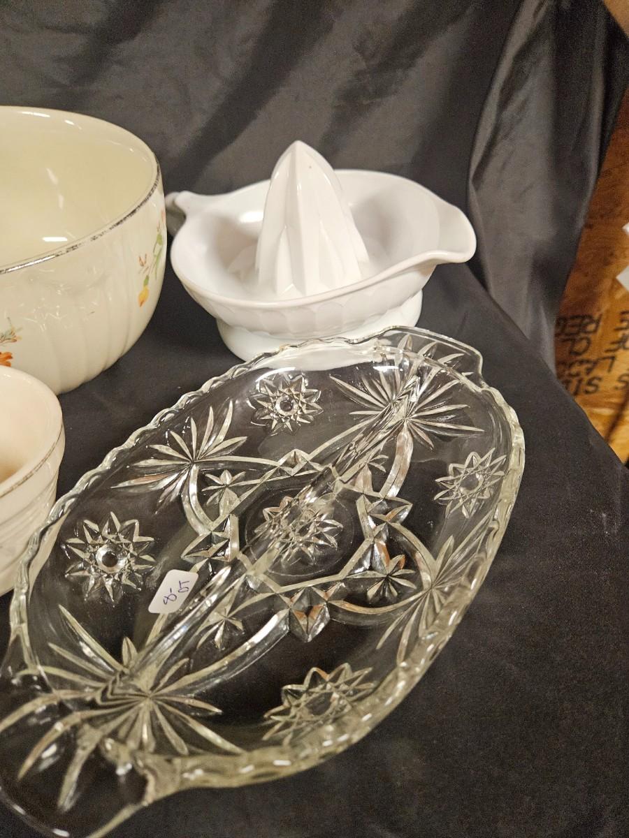 Vintage Lot of 6 Kitchen Items Including Milk Glass Juicer, Divided Relish Dish and Veggie Dish