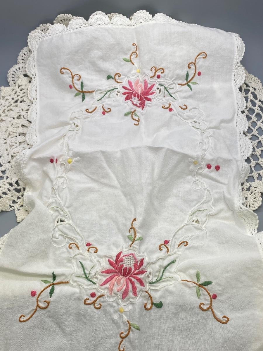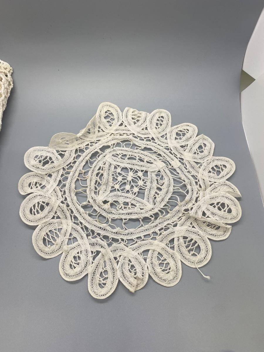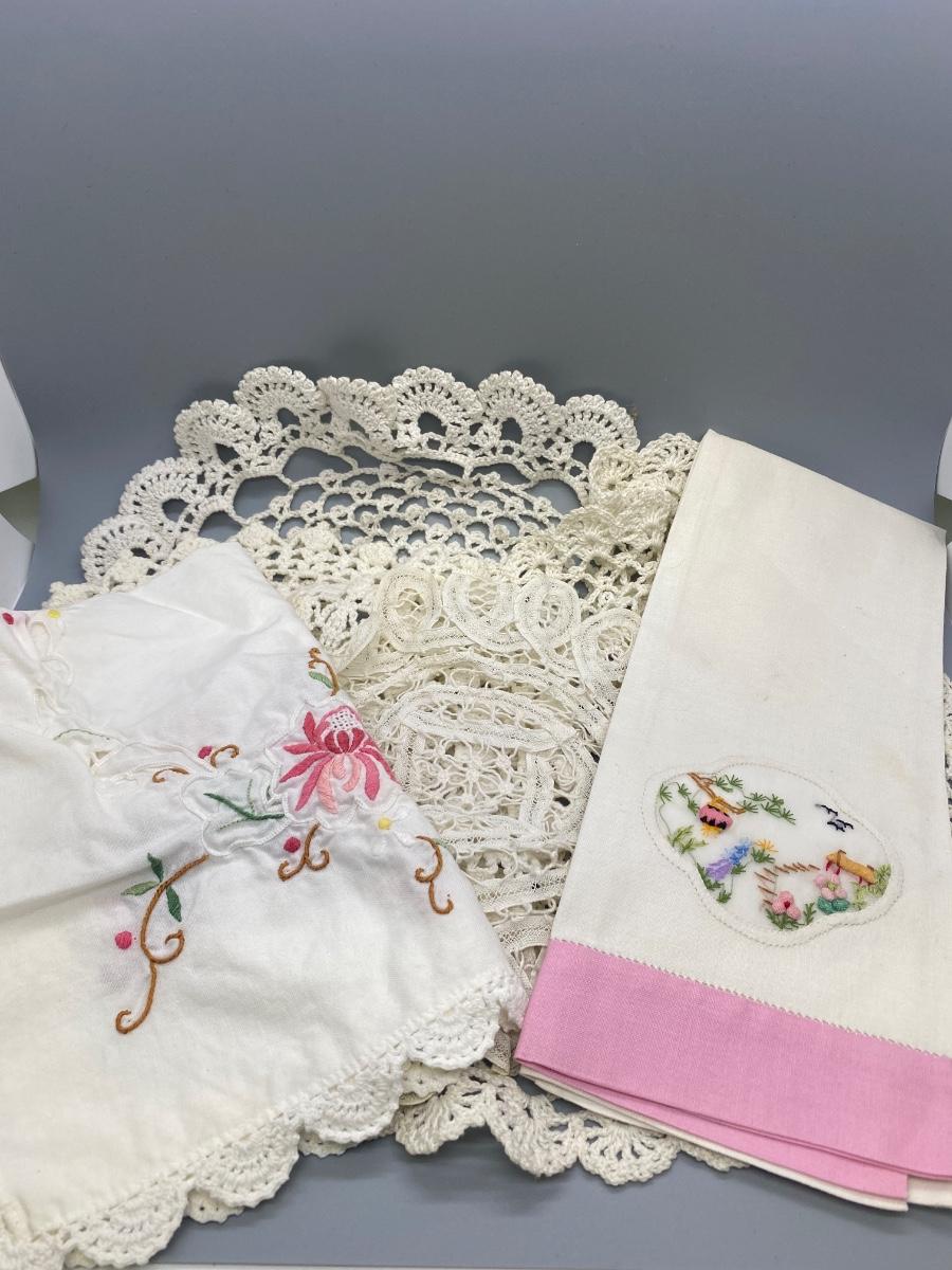Lot of 6 table doilies/linens. 4 doilies and to embroidered linen pieces. Some light discolor.