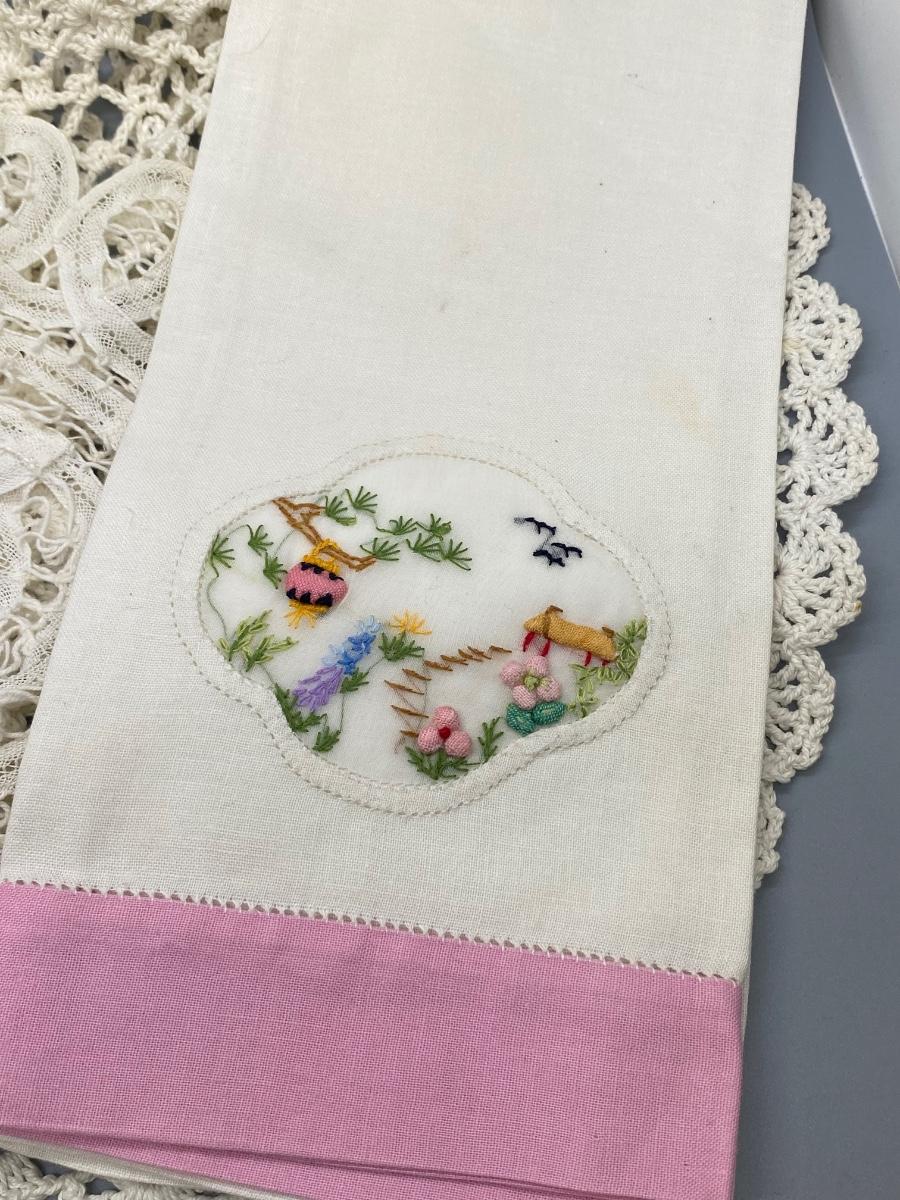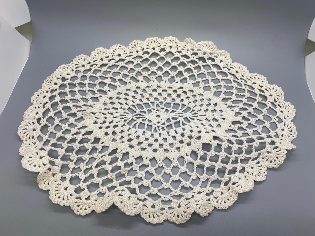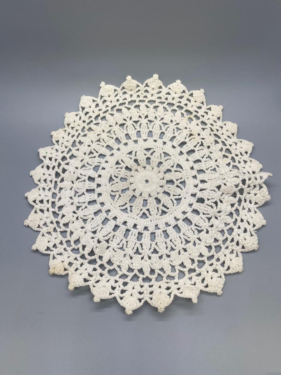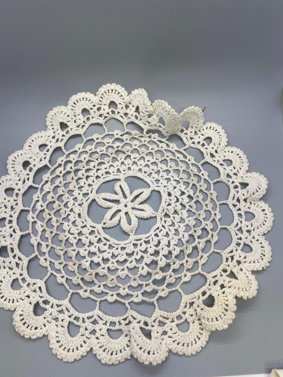 Lot of 6 table doilies/linens. 4 doilies and to embroidered linen pieces. Some light discolor.