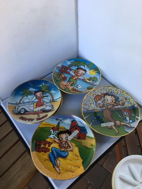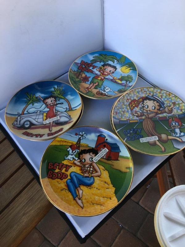 For your consideration a set of 8 plates Betty Boop America's Sweetheart. Will be sold as a lot. All new,from a store we liquidated. 5 of them come with the original foam box but the boxes are not clean as they spent years in storage. The following are the plates: D3633 (we have 5 of them: Show Time and Tropical Time, Starts and Stripes, The Toast of the Town, This is the life), D3632 (we have 3 of them Let it Snow, Barnyard Beauty, Homecoming Queen). The shipping will differ depending upon the location. If it is less than the asking quote we will refund the difference.