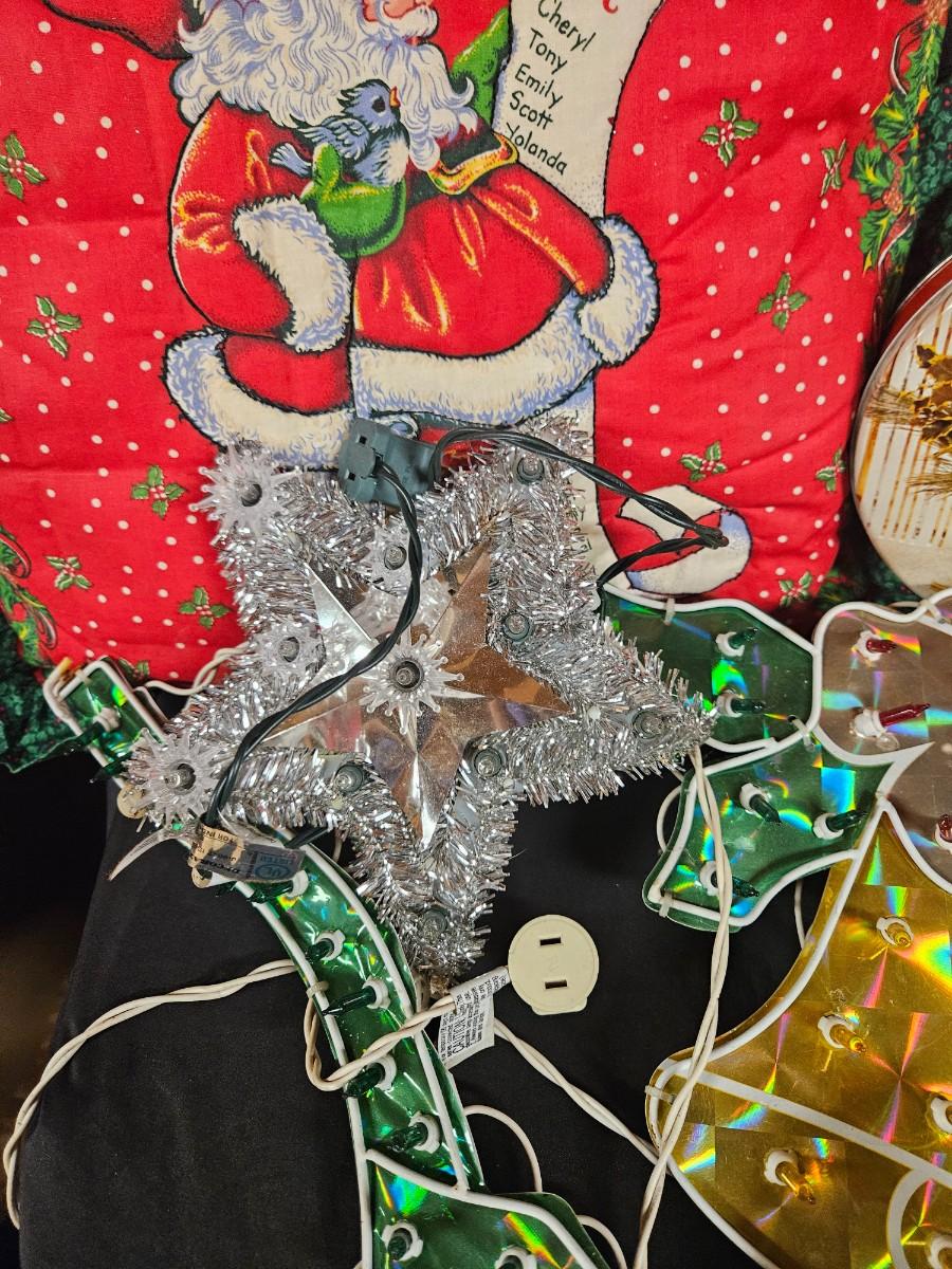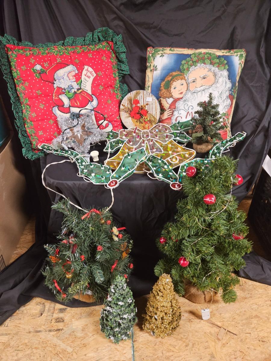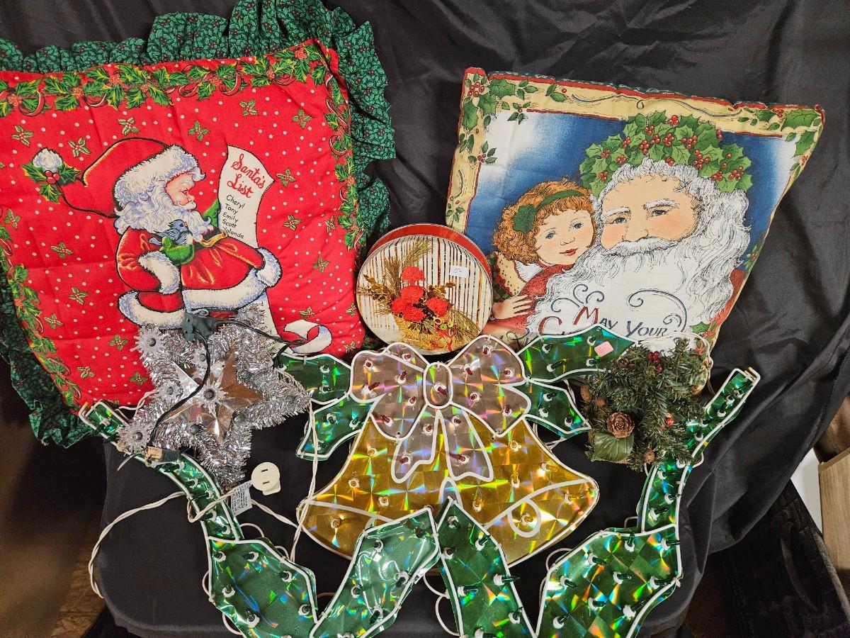 Vintage Lot of 9 Misc Christmas Decorations Including Pillows, Light Up Tinsel Star and Small Trees
