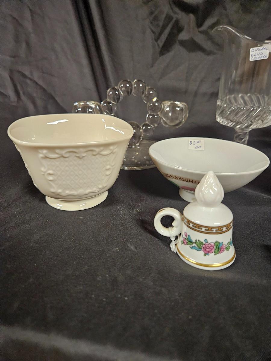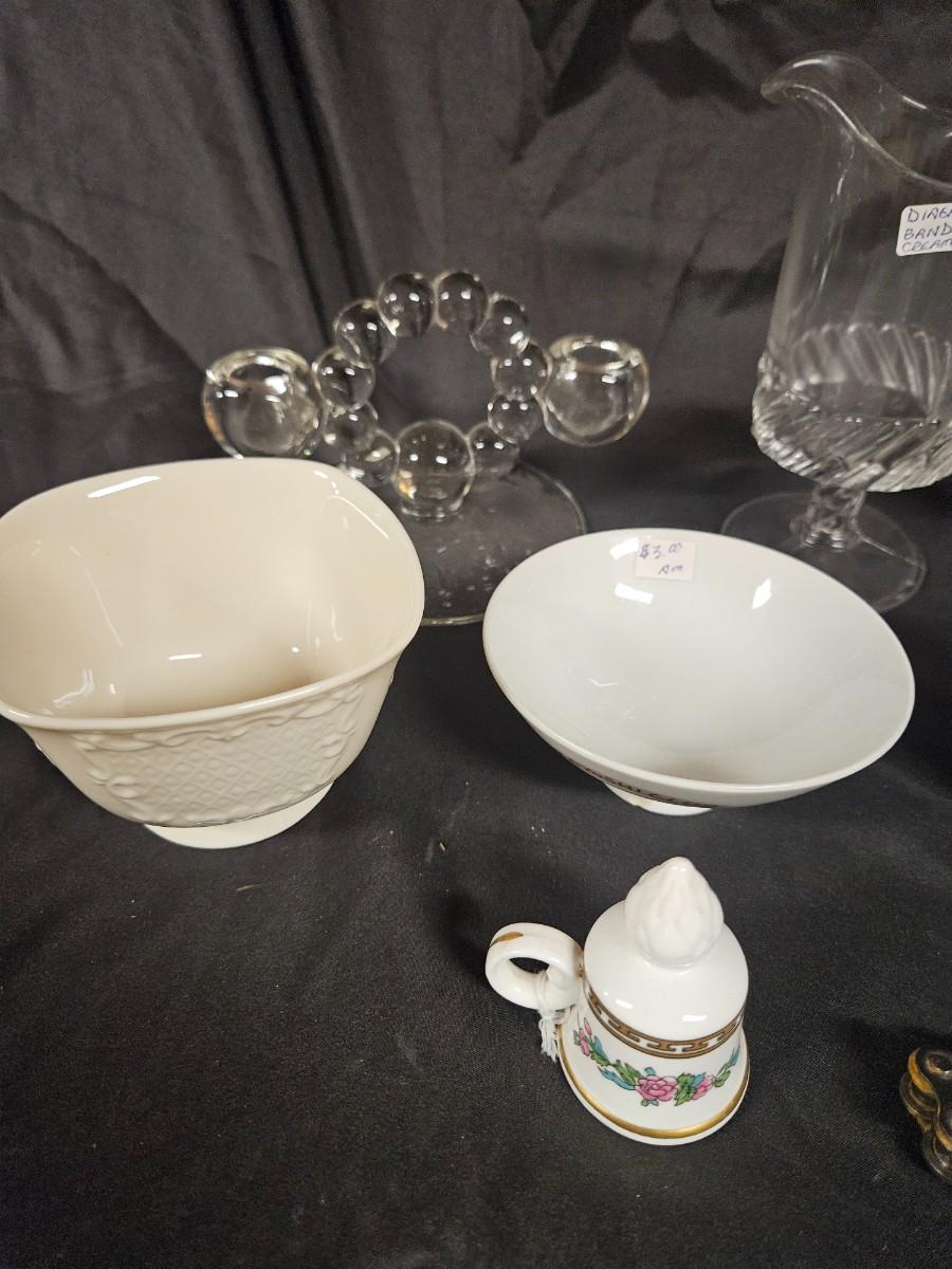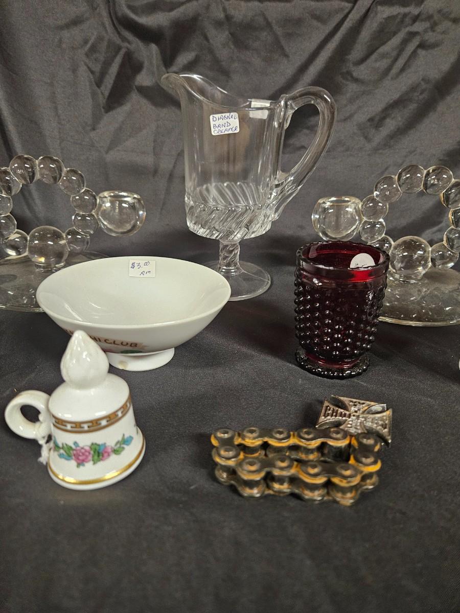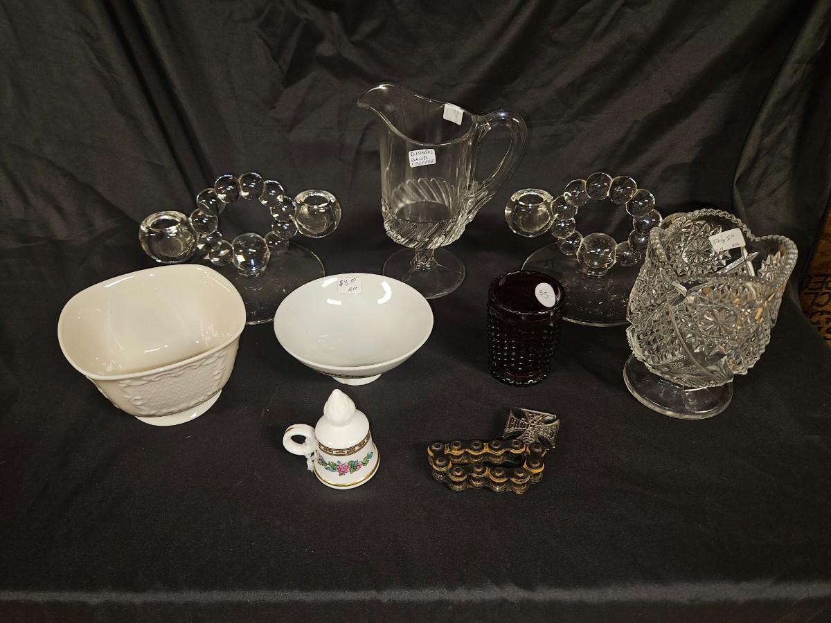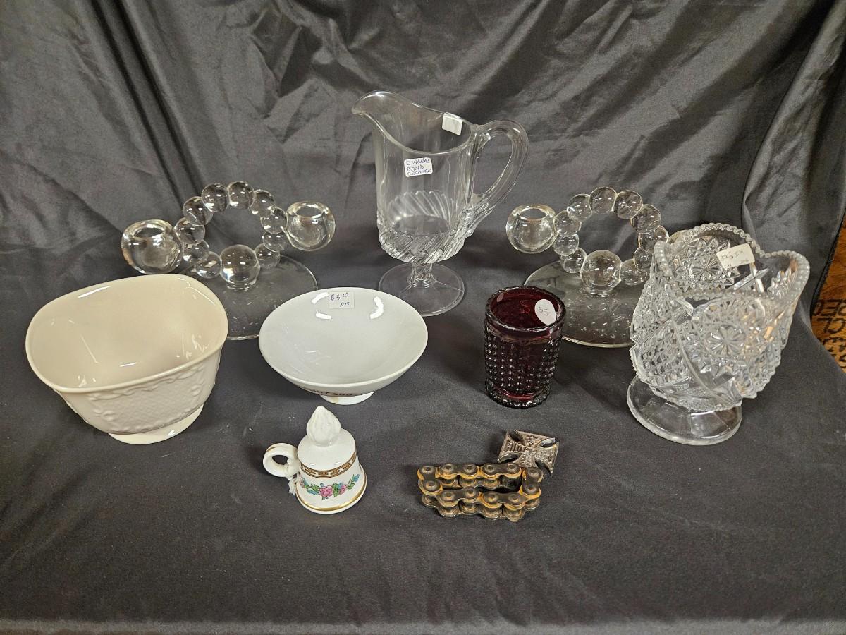 Vintage Lot of 9 Misc Home Goods Including Candlesticks, Noodle Bowl, Water Pitchers and Ruby Votive Holder