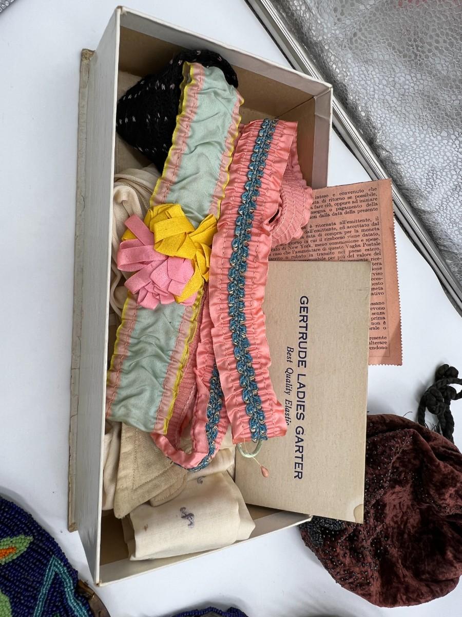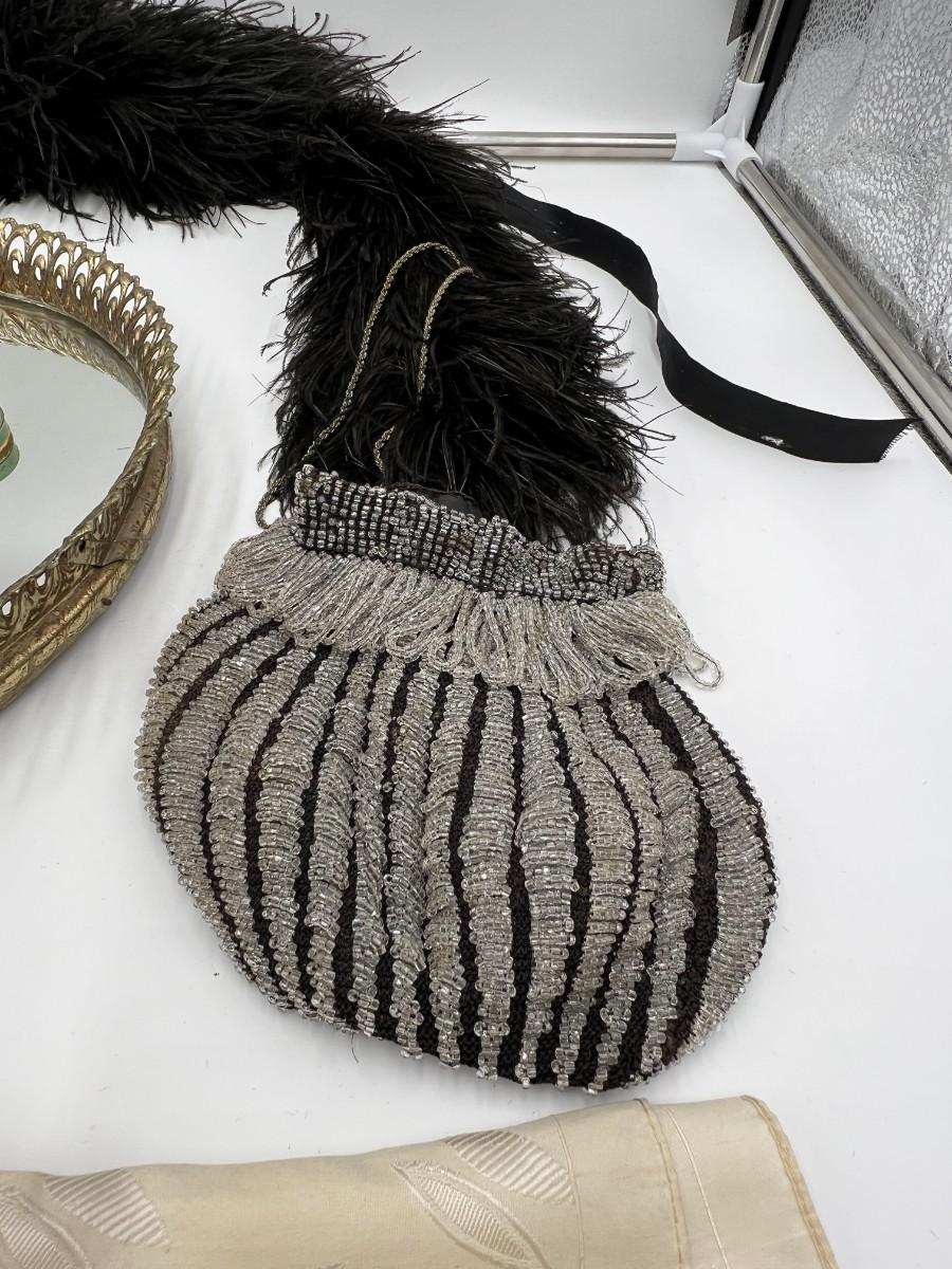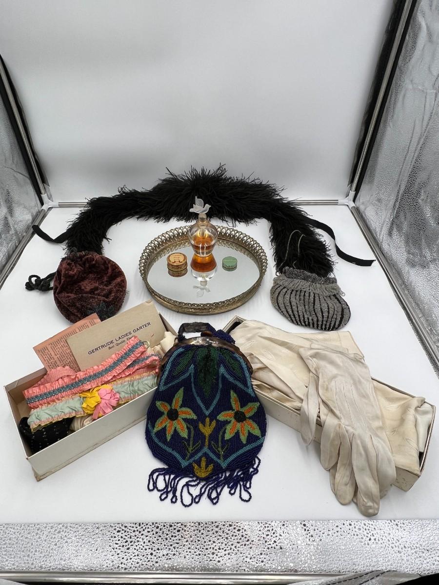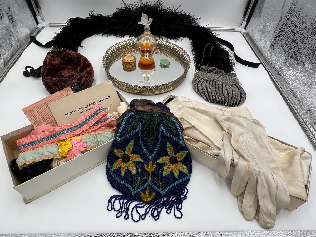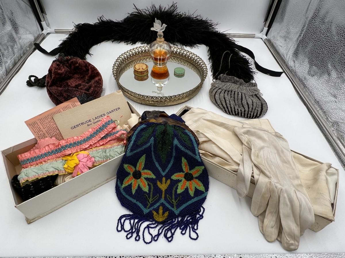 Vintage Lot of Antique Beaded Handbags, Pouches, Gloves, Garter Belts, Black Feather Boa, Perfume, and Cosmetics